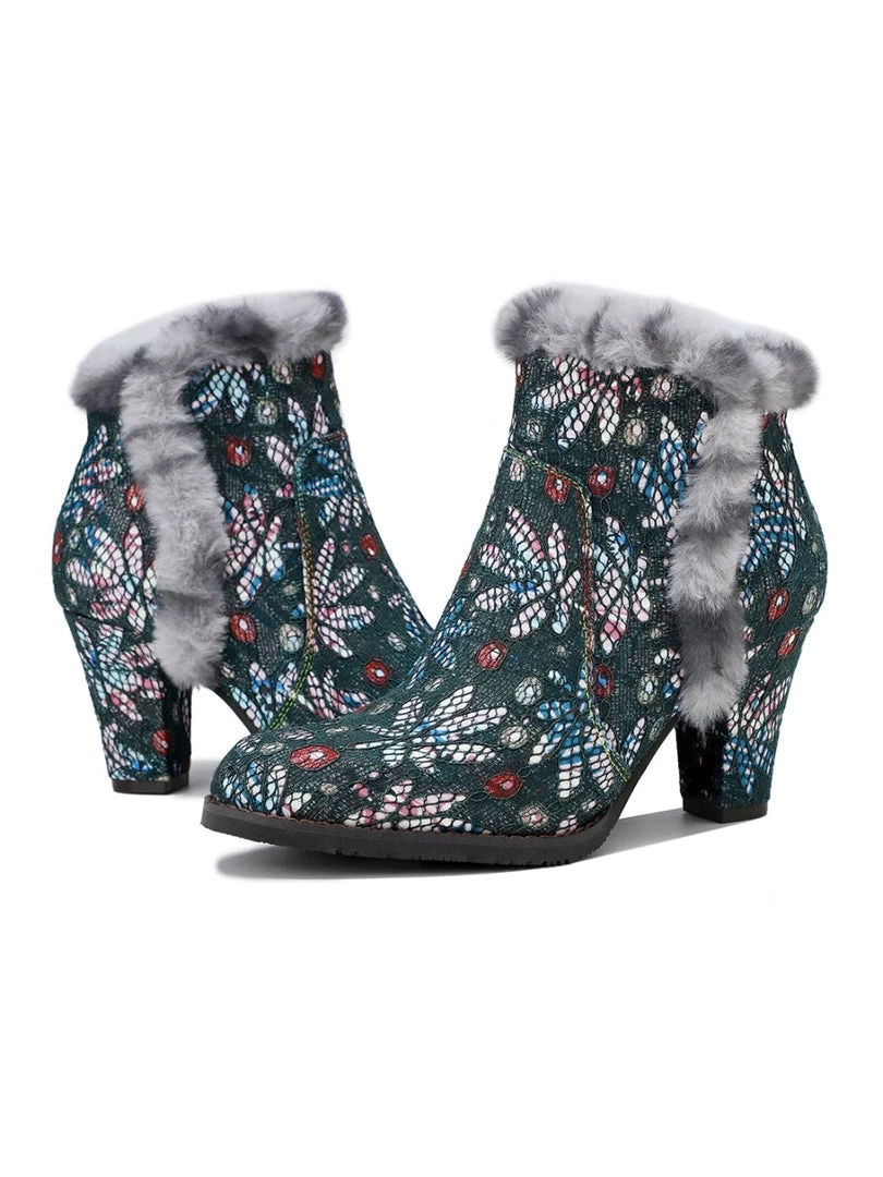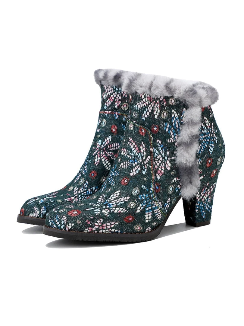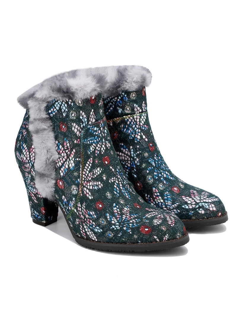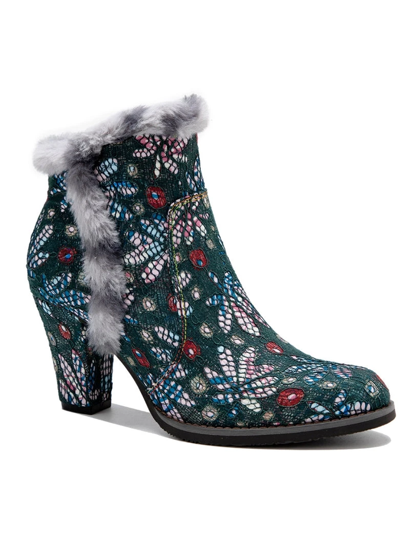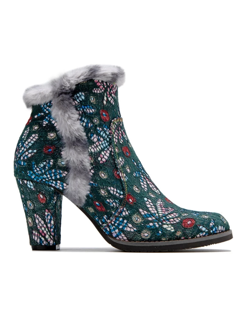 Style your simple, casual look with these can’t-miss elegant leather boots designed with a faux fur trim and lux looking lace with an intricate floral print.