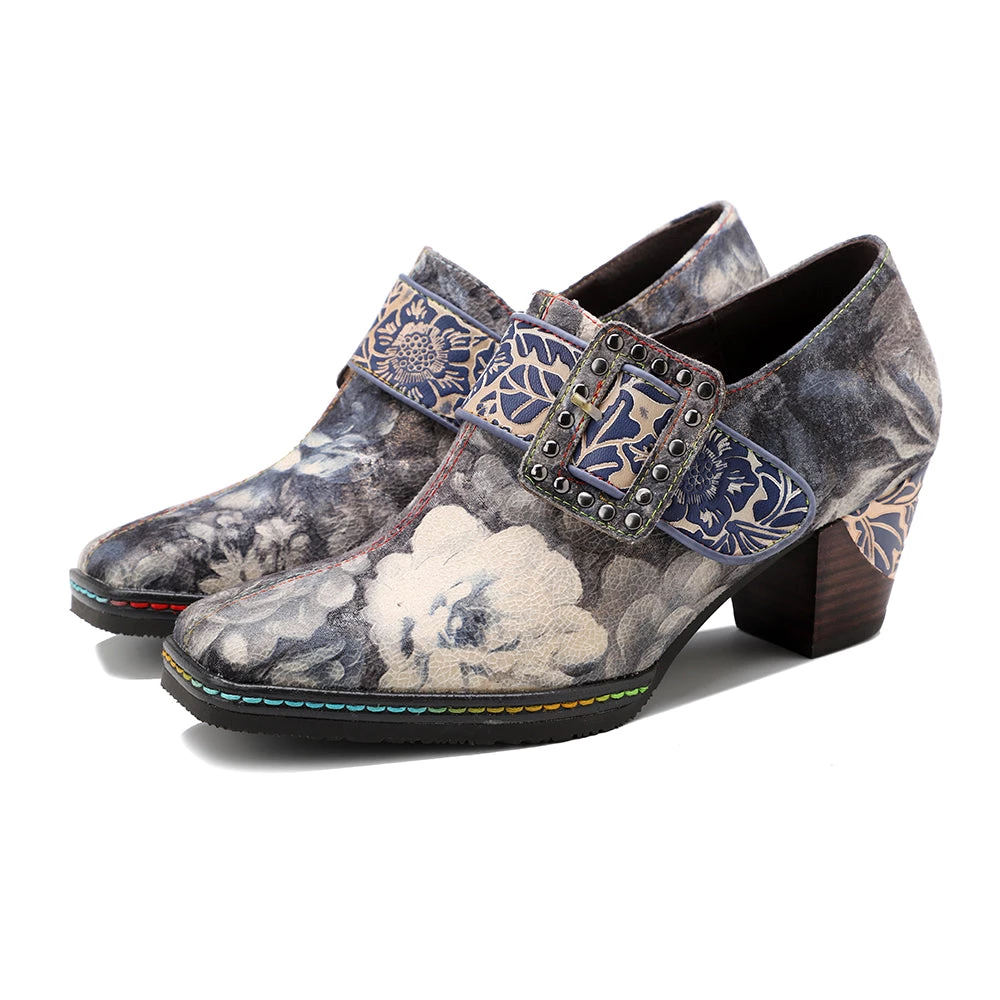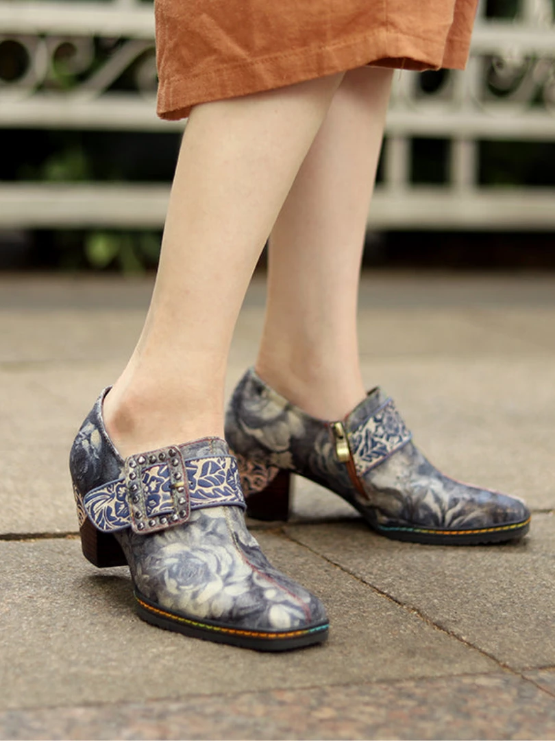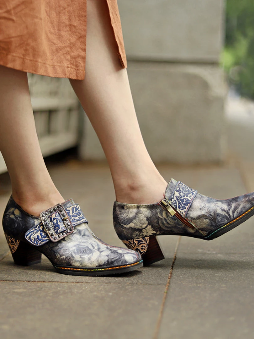 A striped design lends playful flair to these sleek genuine leather boots fashioned with embossed straps and decorative heel chains.