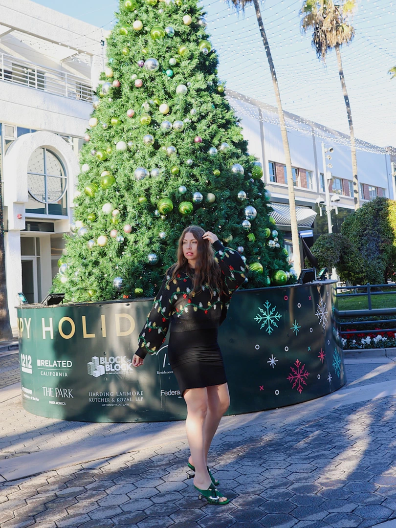 Celebrate in festive style with this playful holiday-themed sweater done in a light comfy knit.