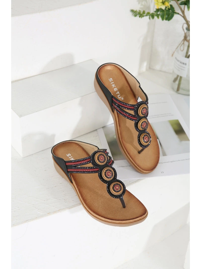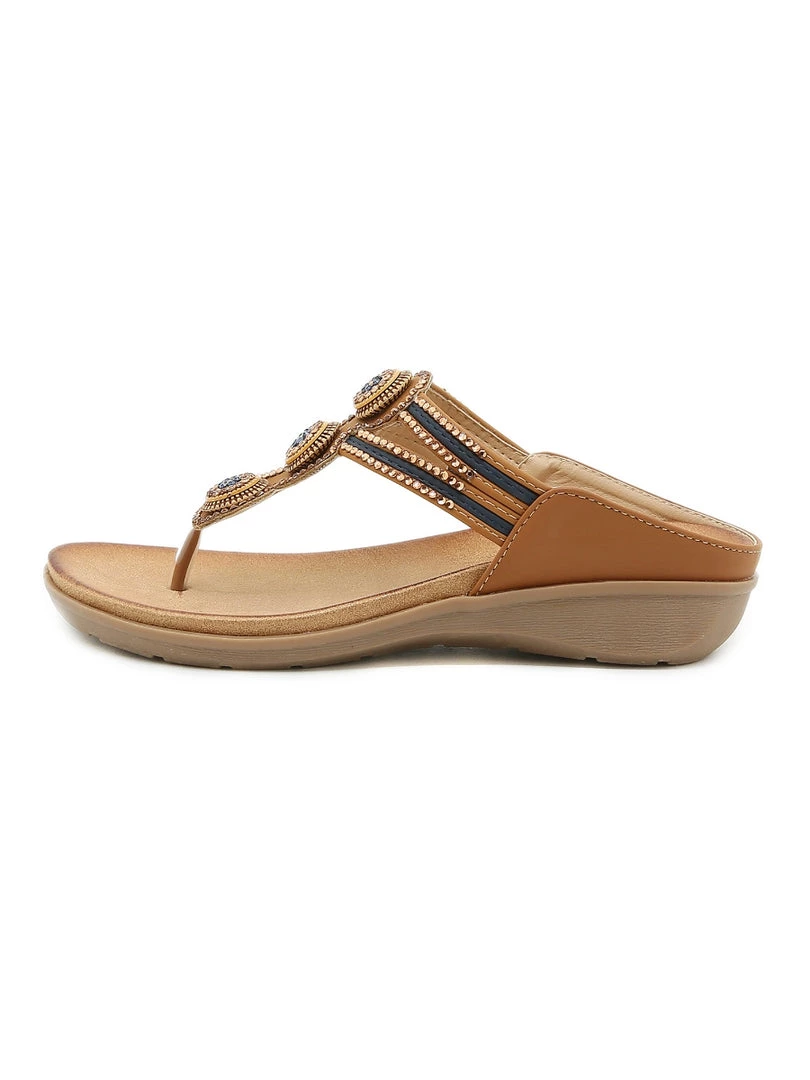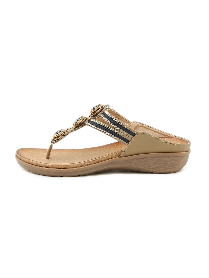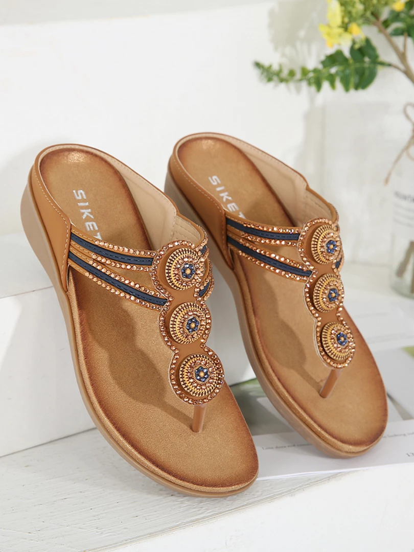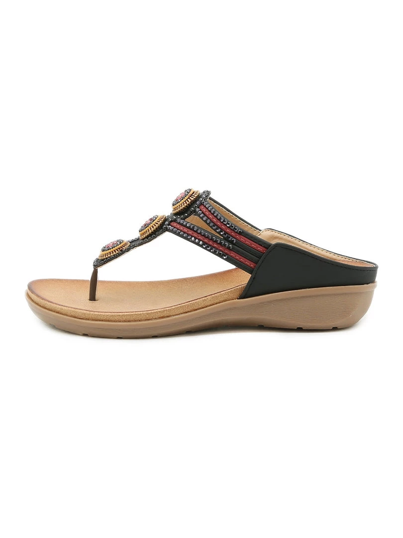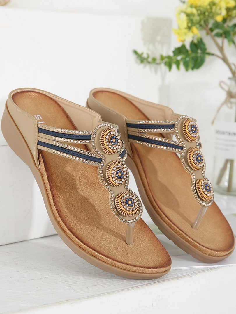 Add a pop of dazzle to your warm-weather ensemble with these sandals that boast a playful beaded and rhinestone accent.