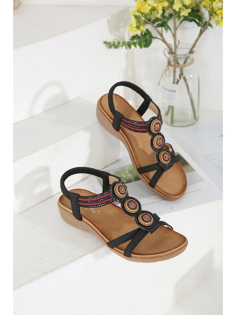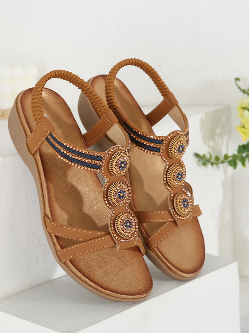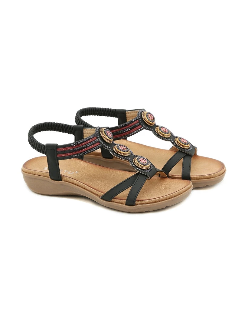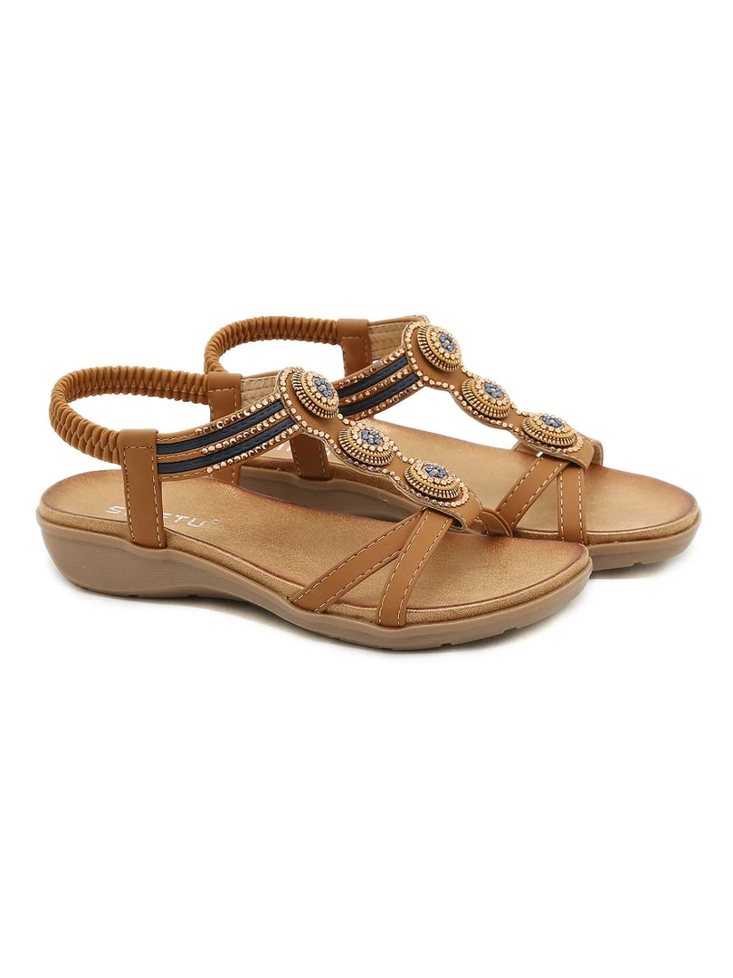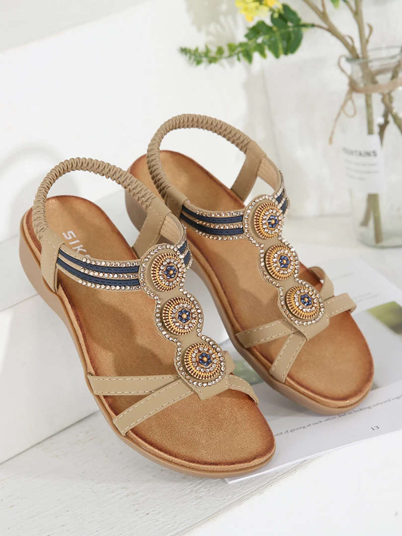Step with style wherever you travel in this cross strap sandal detailed with rhinestone-studded deco.