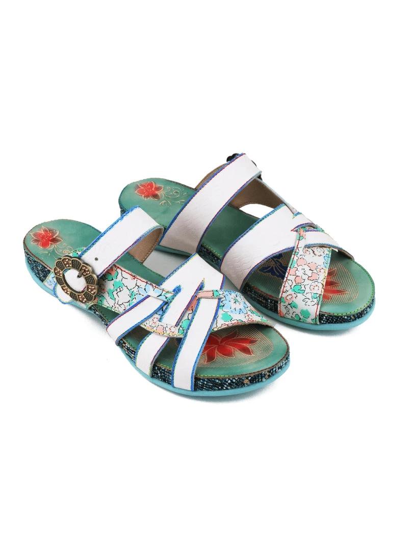 Unleash your inner joy with these vibrant shoes constructed of 100% cow leather, boasting a collage of colorful designs and beautiful patterns topped off with a side bronze metal.
