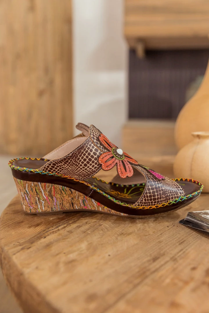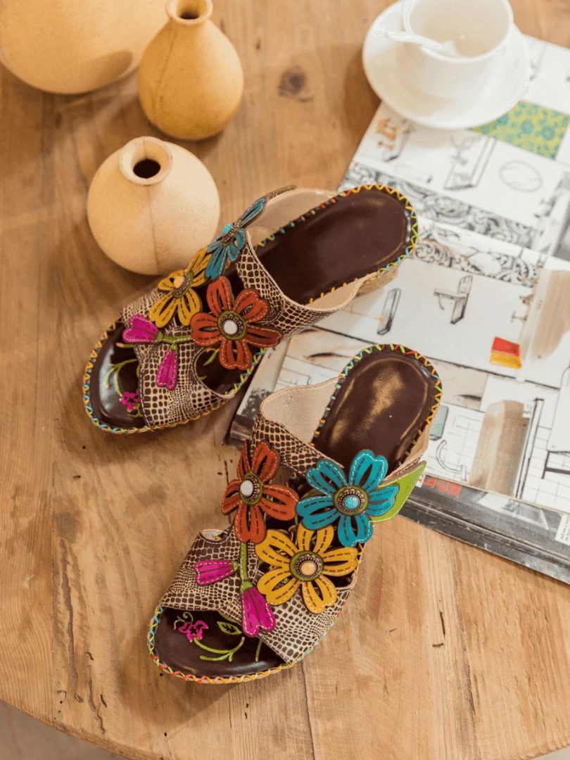 Put your fashionable foot forward in these floral wedge mule flaunting genuine leather and colorful appliqué for stylish sunny-day steps..