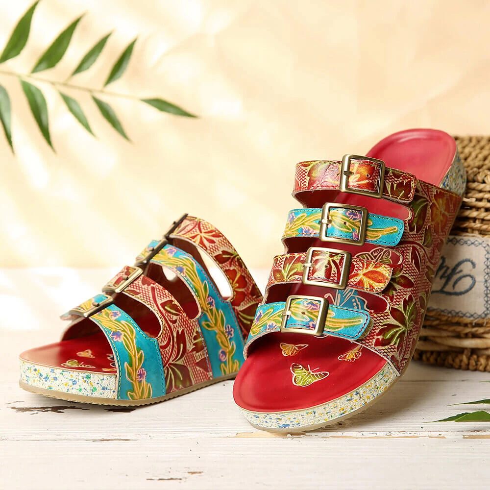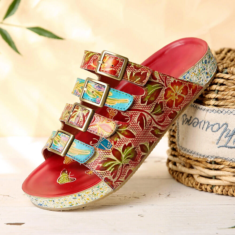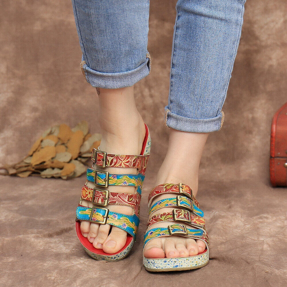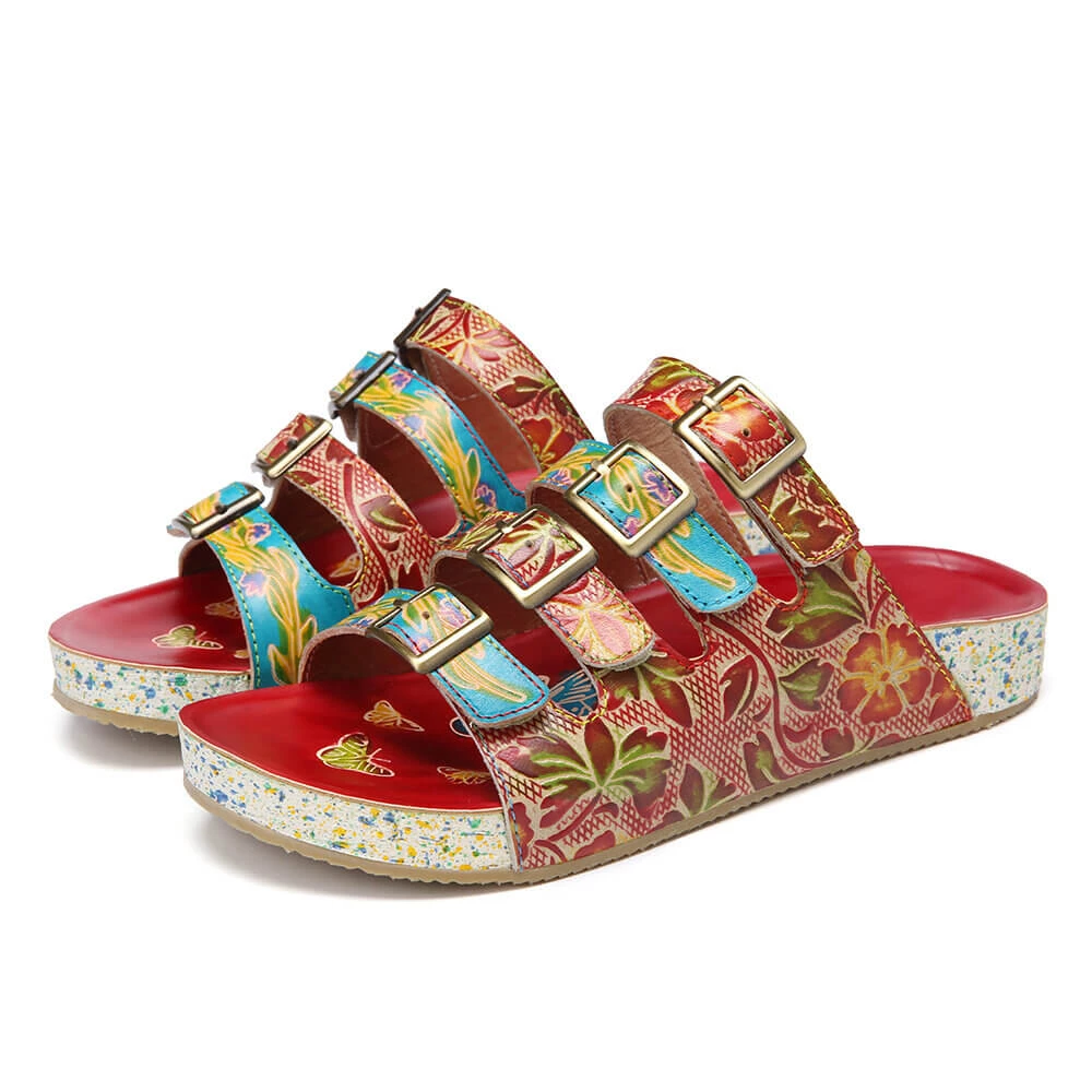 A bold, colorful pattern lends playful flair to these casual sandals boasting tri-straps design and leather uppers for all-day stylish comfort.