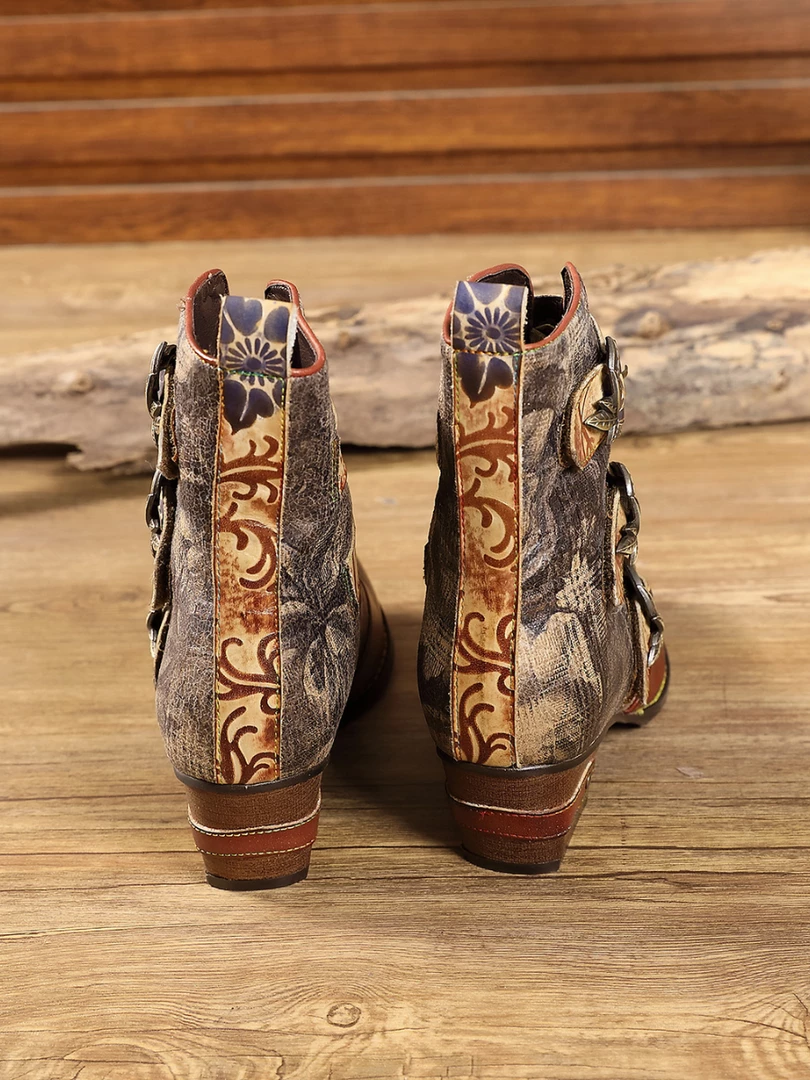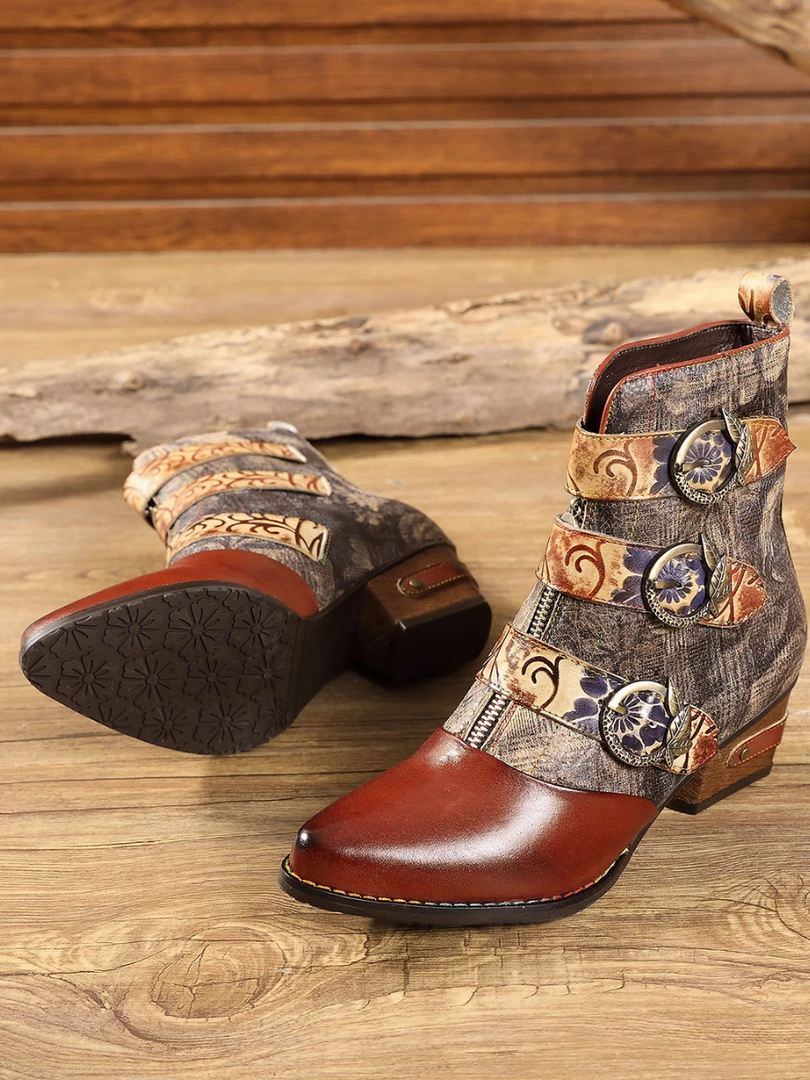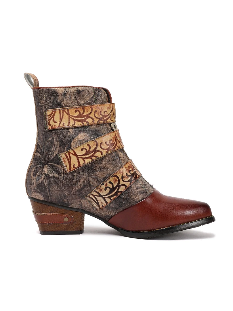 Make an artistic style statement in this durable leather ankle boot embellished with a tri-strap accent at the ankle and a vibrant mix of patterns and colors.