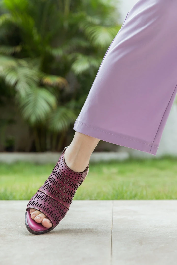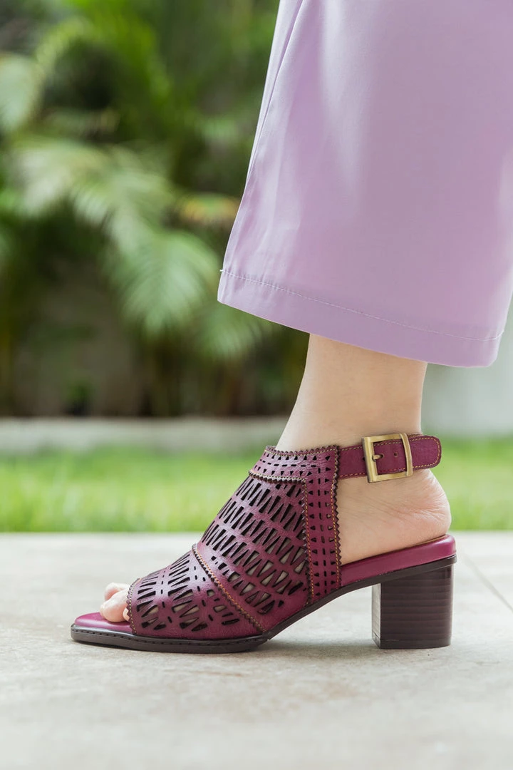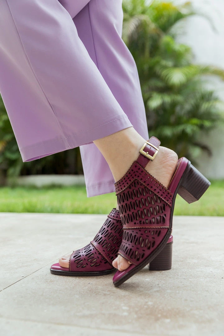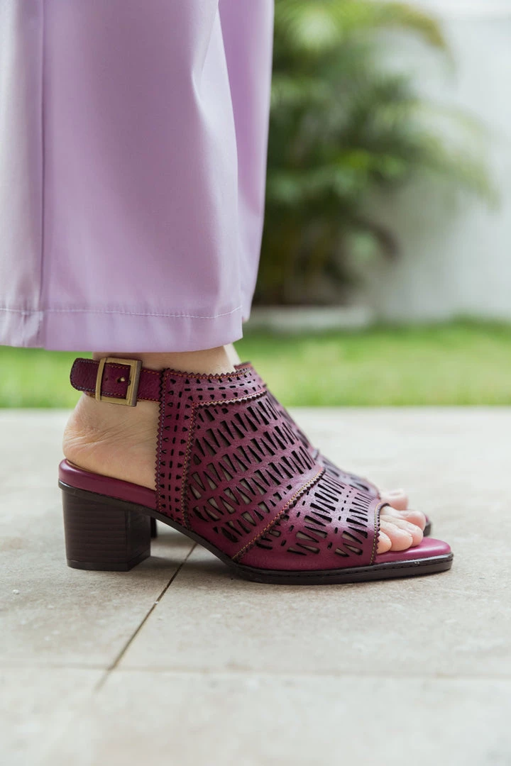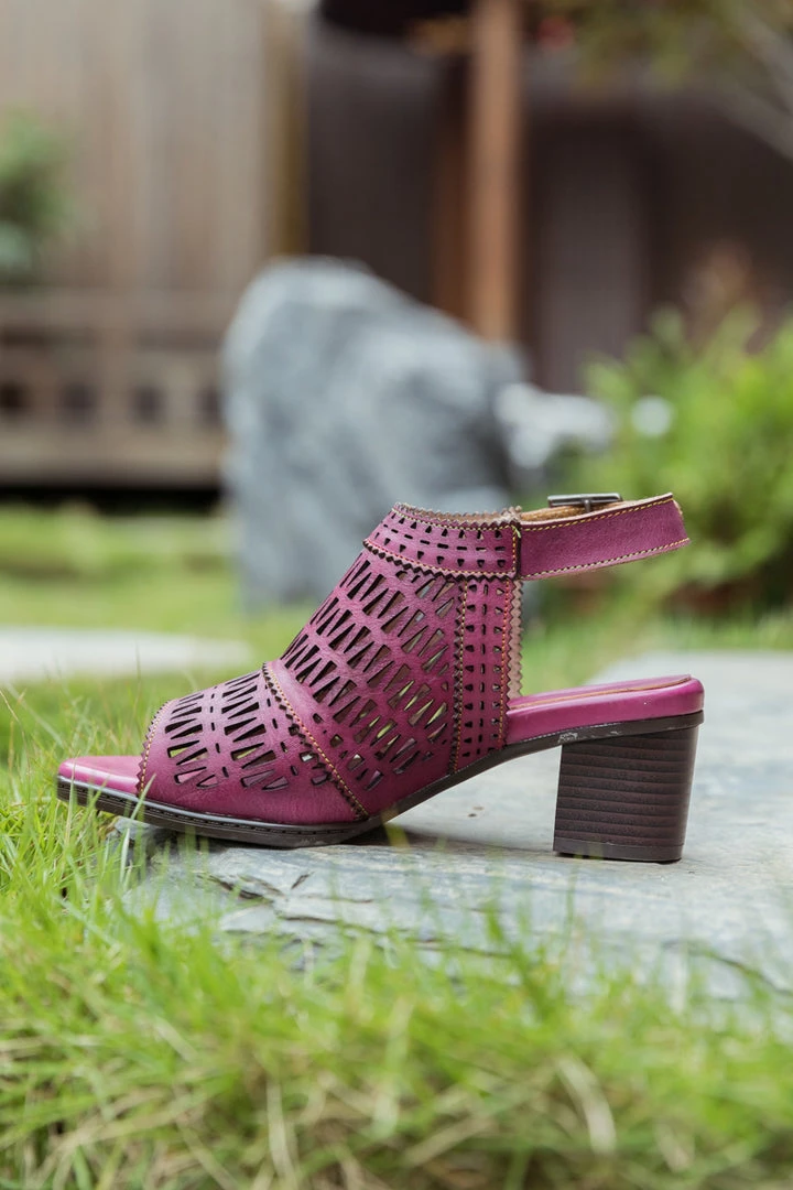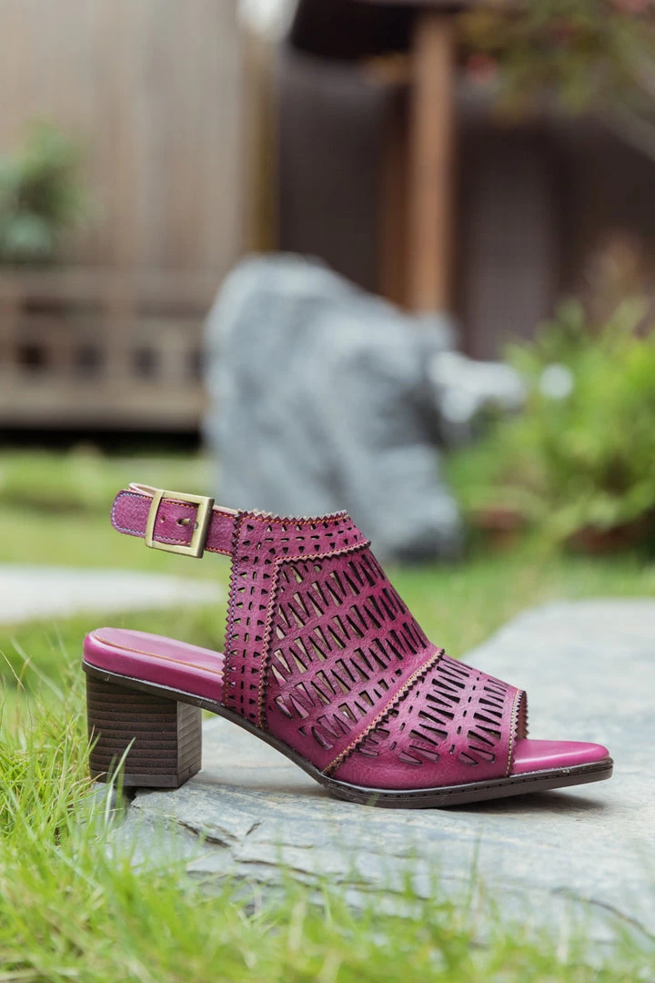 Bring an artistic touch to your ensemble with these vibrant leather sandals featuring a low heel and a durable sole for all-day wear.