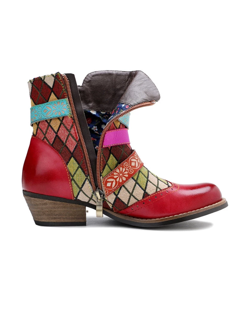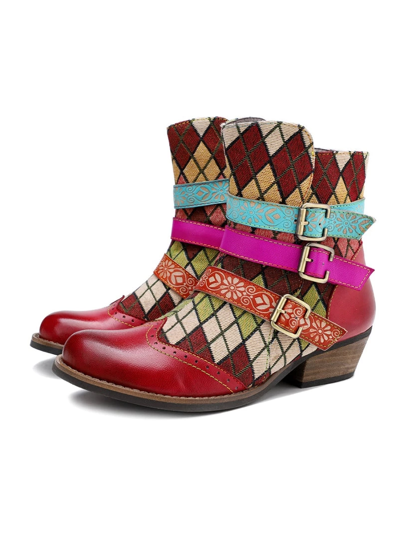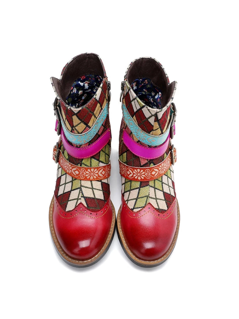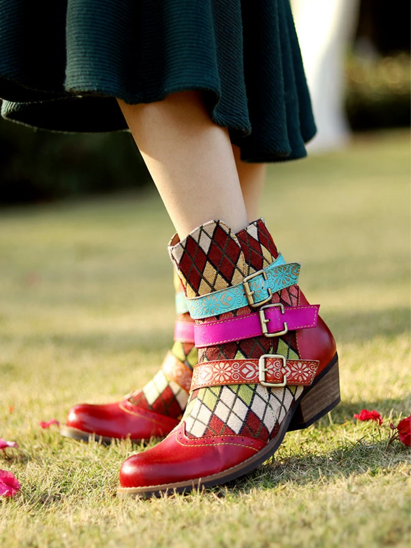 Make an artistic style statement in this durable leather ankle boot embellished with a crisscross buckle strap at the ankle and a vibrant mix of patterns and colors.