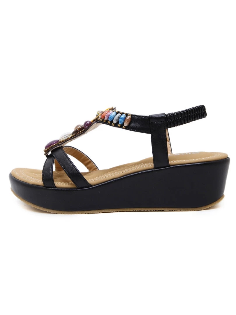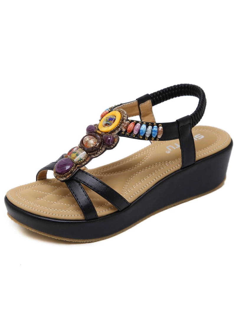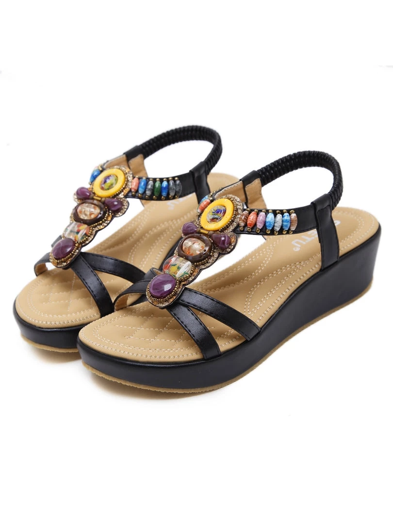 Add eye-catching detail to ensembles with the bold embellished straps of these comfortable wedge sandals. An anti-skid sole provides ground-gripping traction.