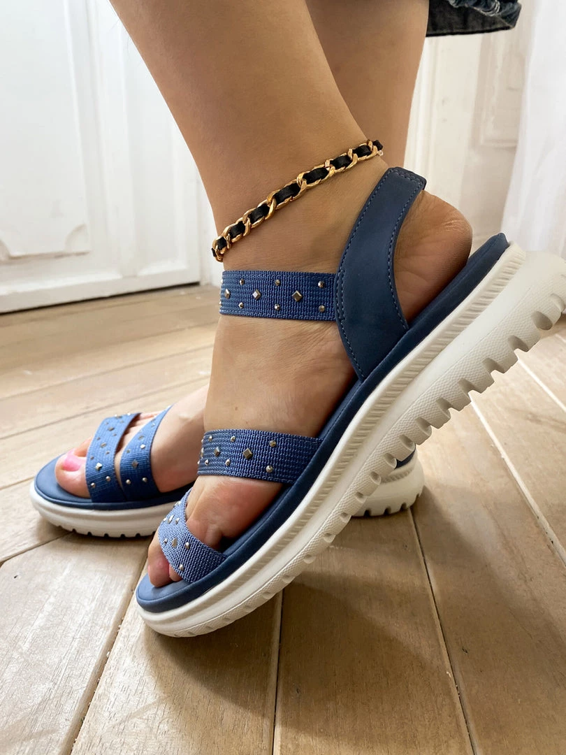 Enjoy laid-back style with dramatic lift when you step out in this studded detail strappy sandal with cushioned footbed.