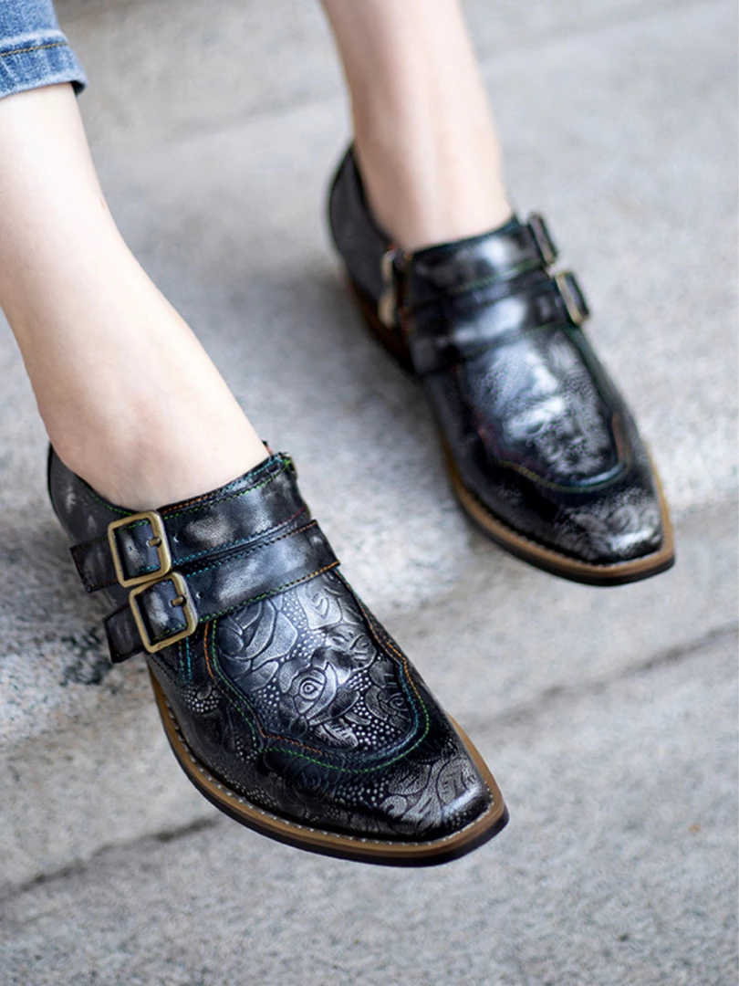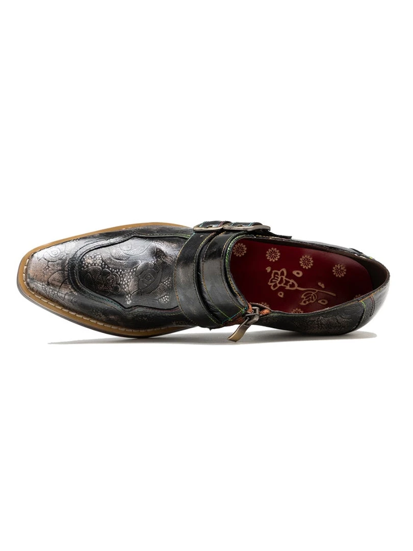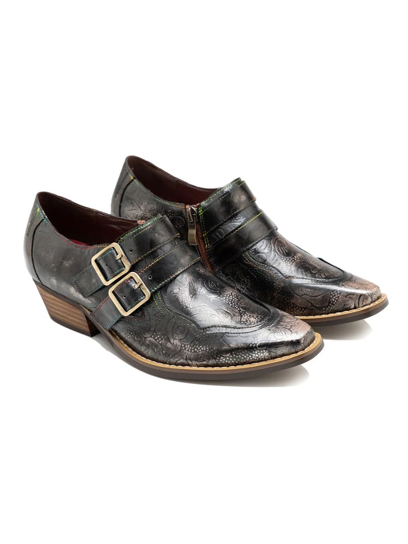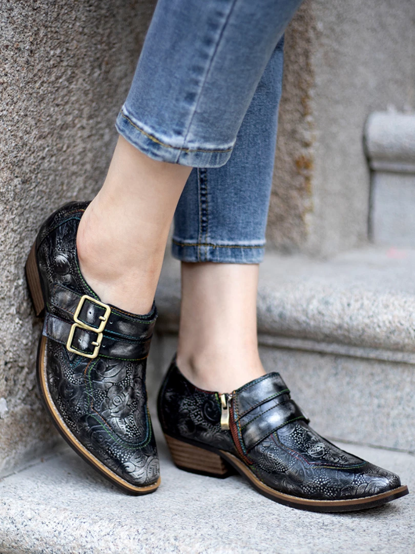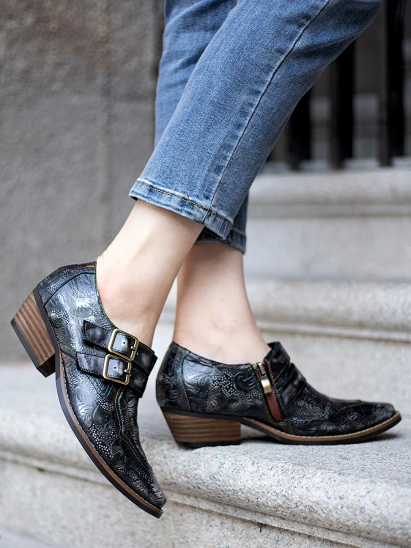 Remix your downtown looks with these show-stopping pump bootie, made with the finest leather upper and floral embossed craft for an eclectic take on modern style. Stacked heels complete the pair with a walkable boost of height.
