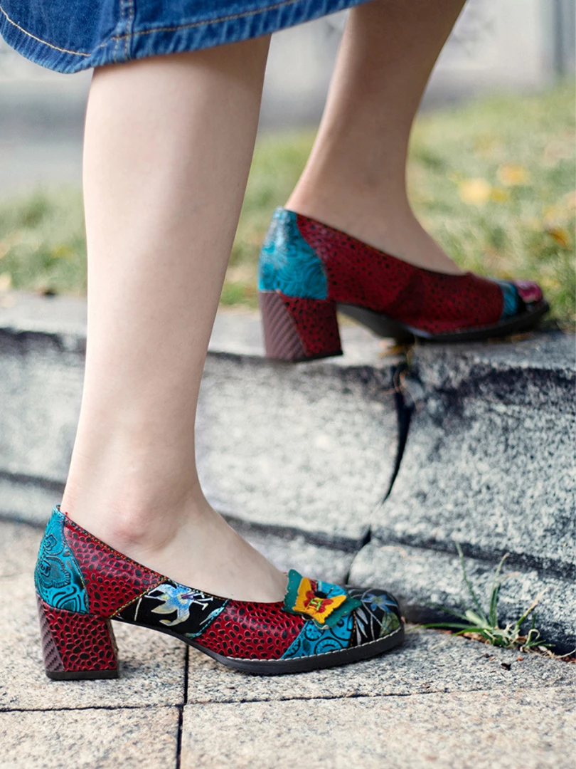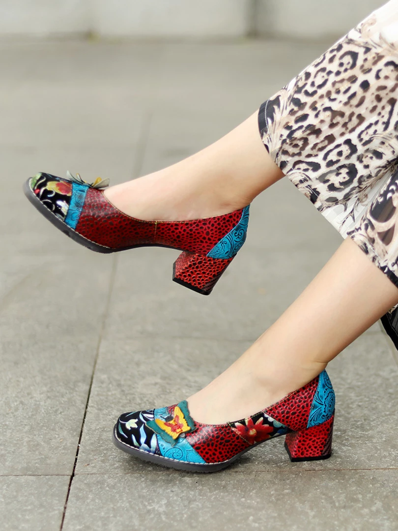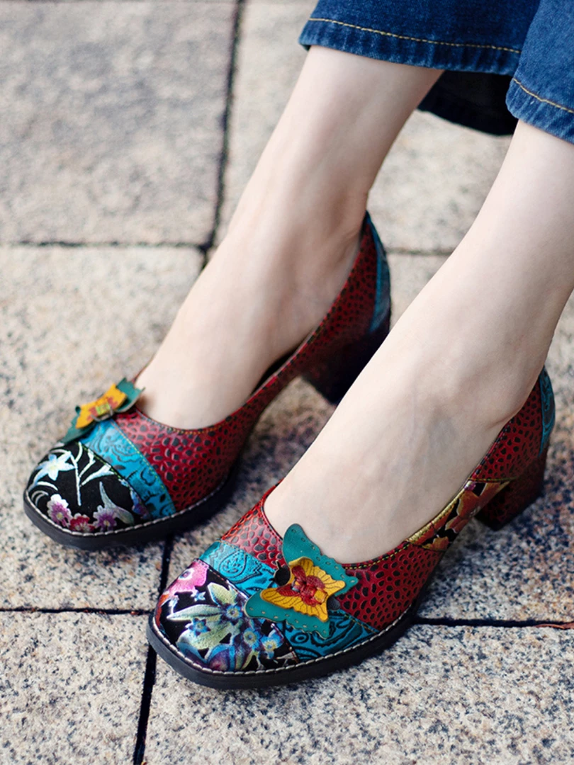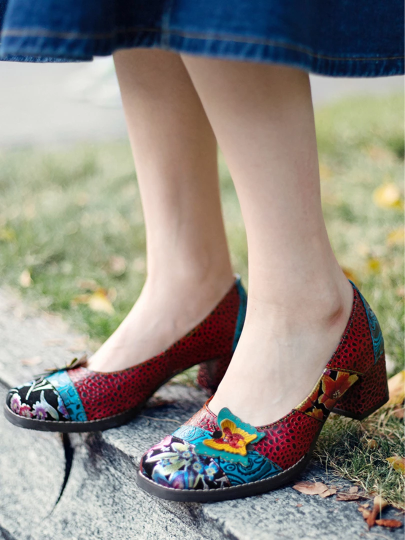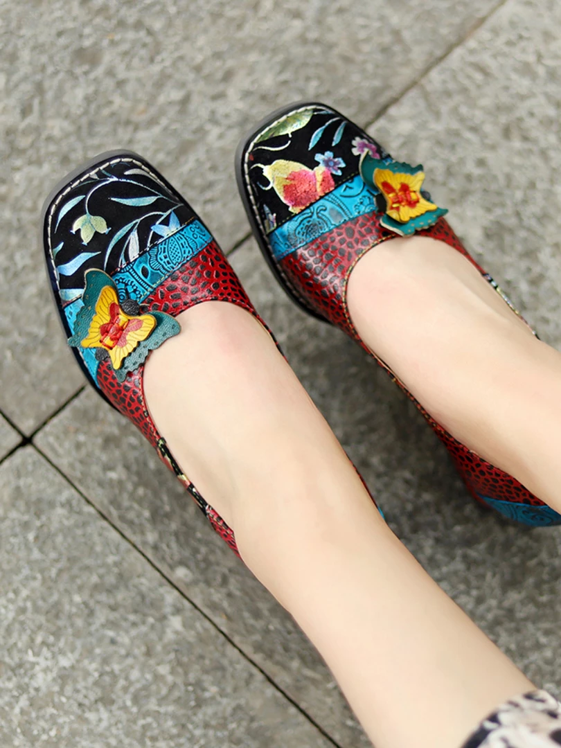 Give casual strides a stylish boost with this leather pump showing off an assortment of lively hues and butterfly applique design.