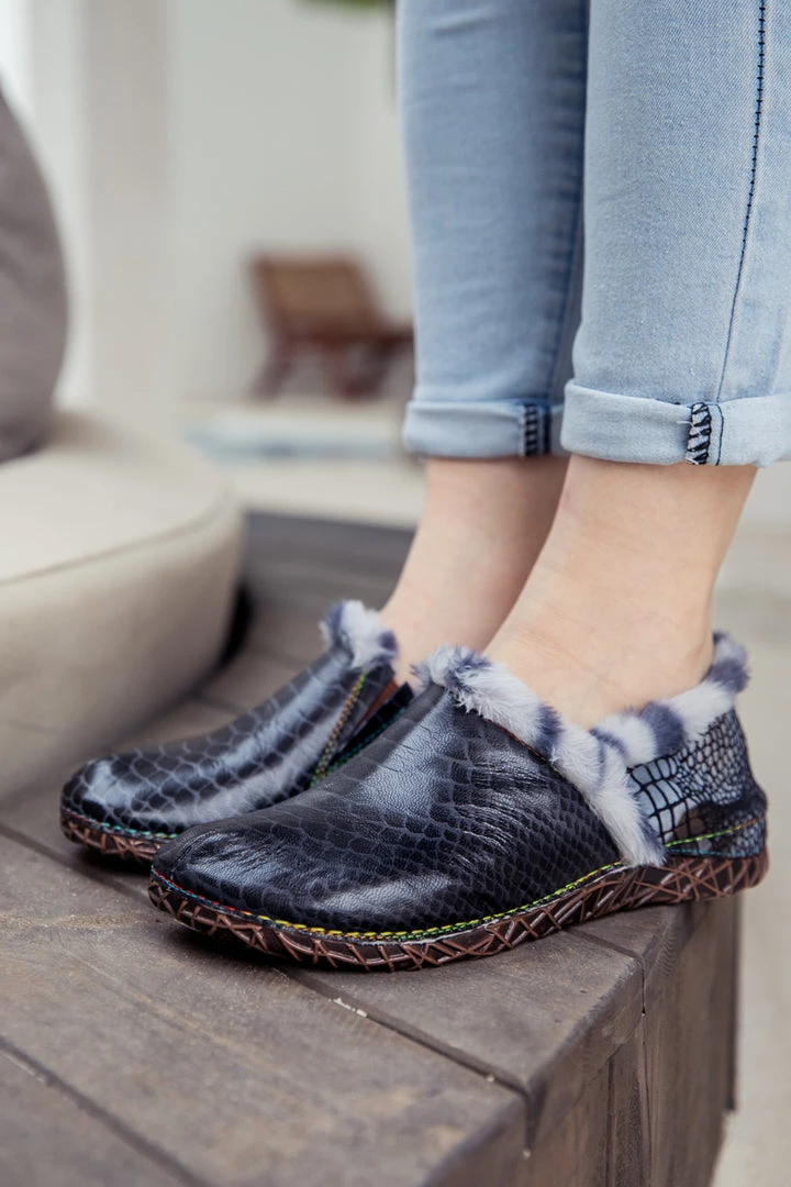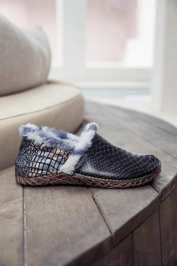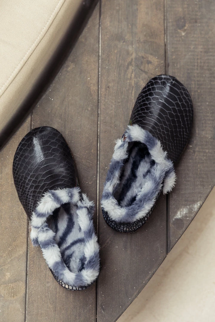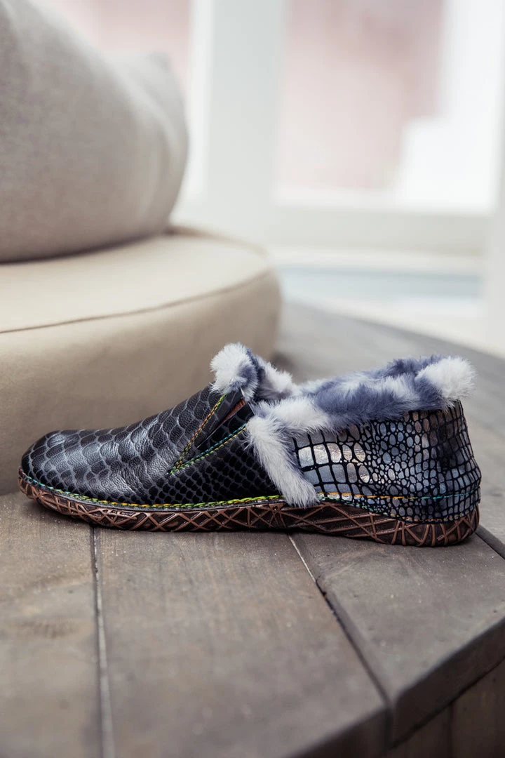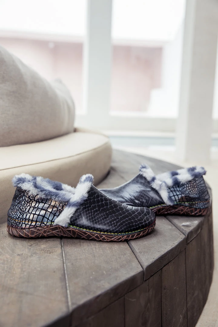 Give your casual and laundry strides a stylish look with this leather wool lined slipper loafer showing off a fish scales print and sequins back heel design.