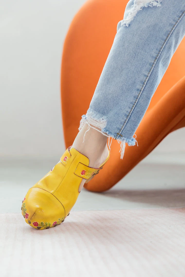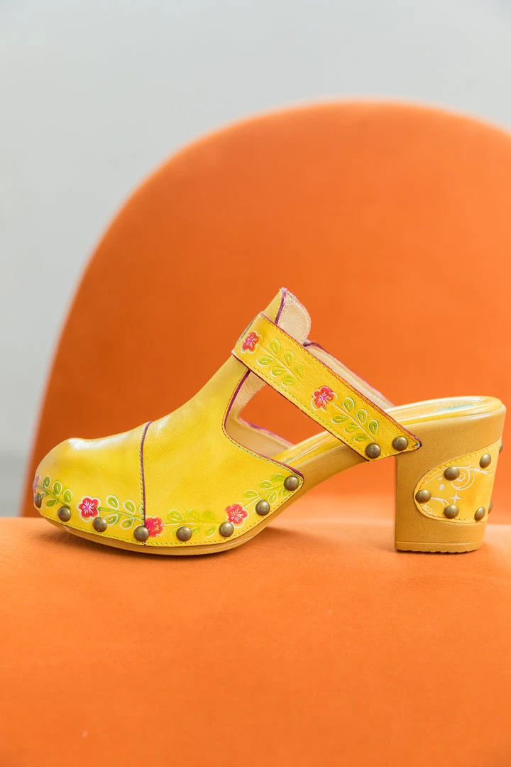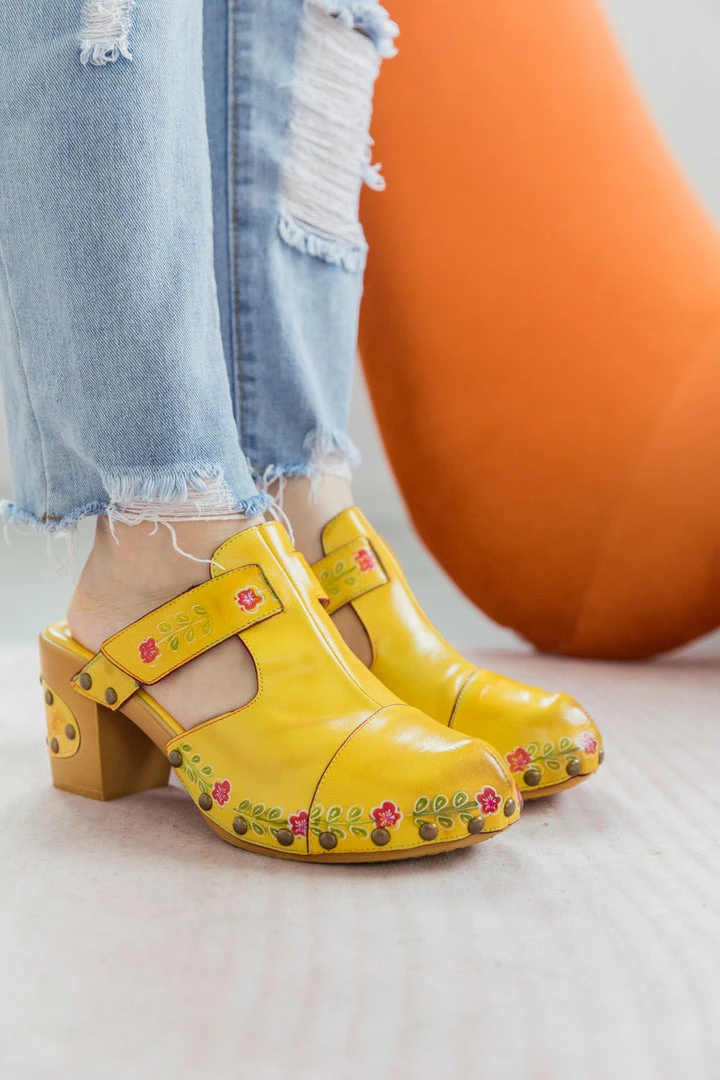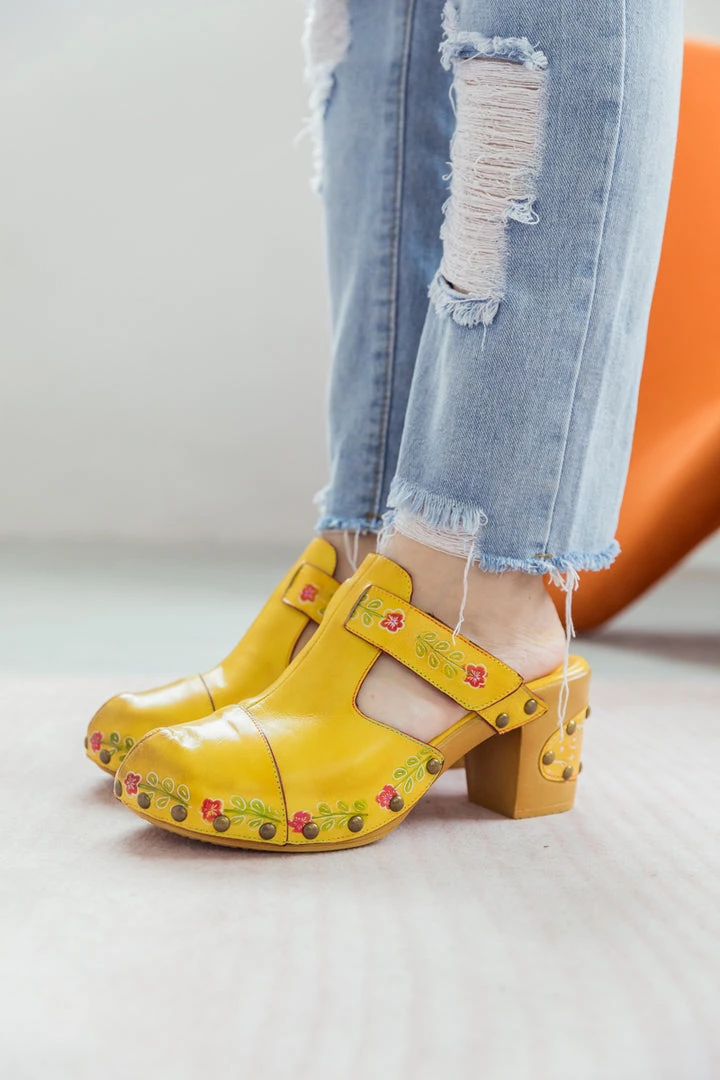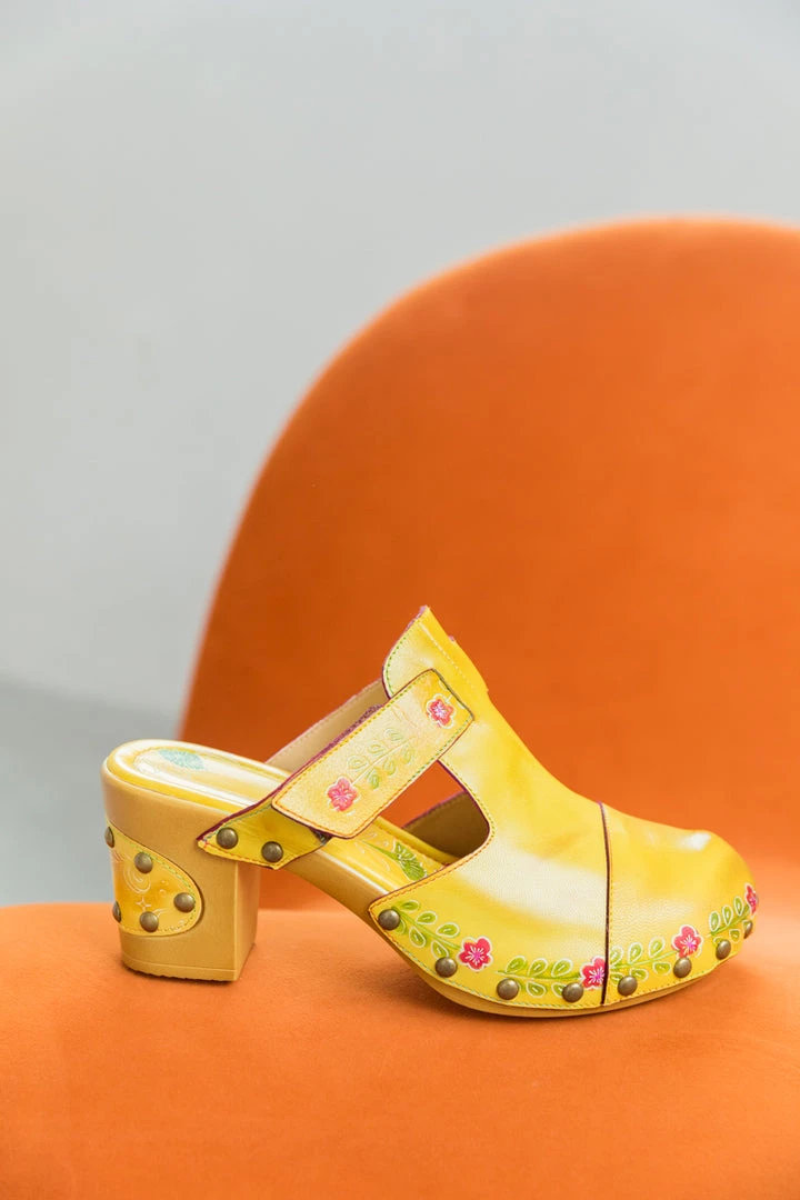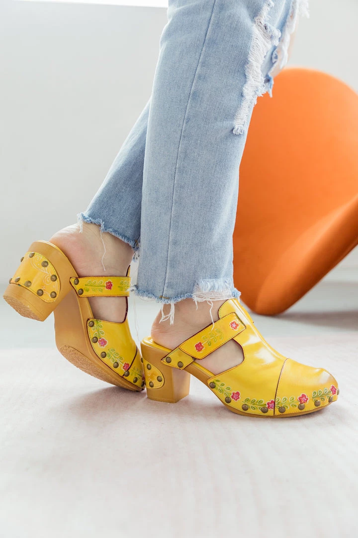 Channel vintage-inspired vibes when you step out in this luxe pair of clog boasting a supple embossed leather and chic golden studs design . Pair our favorite flowy dress with these block heel sandals fashioned with comfy soft leather uppers and contrasting solid hues for simple styling.