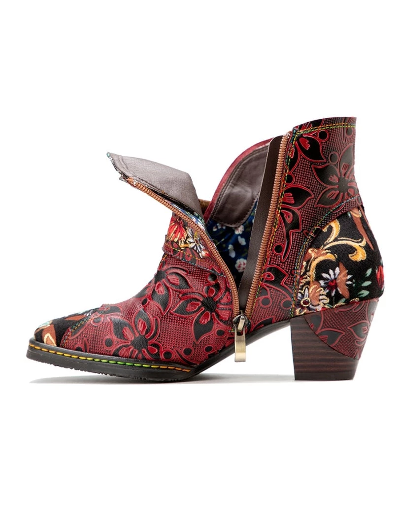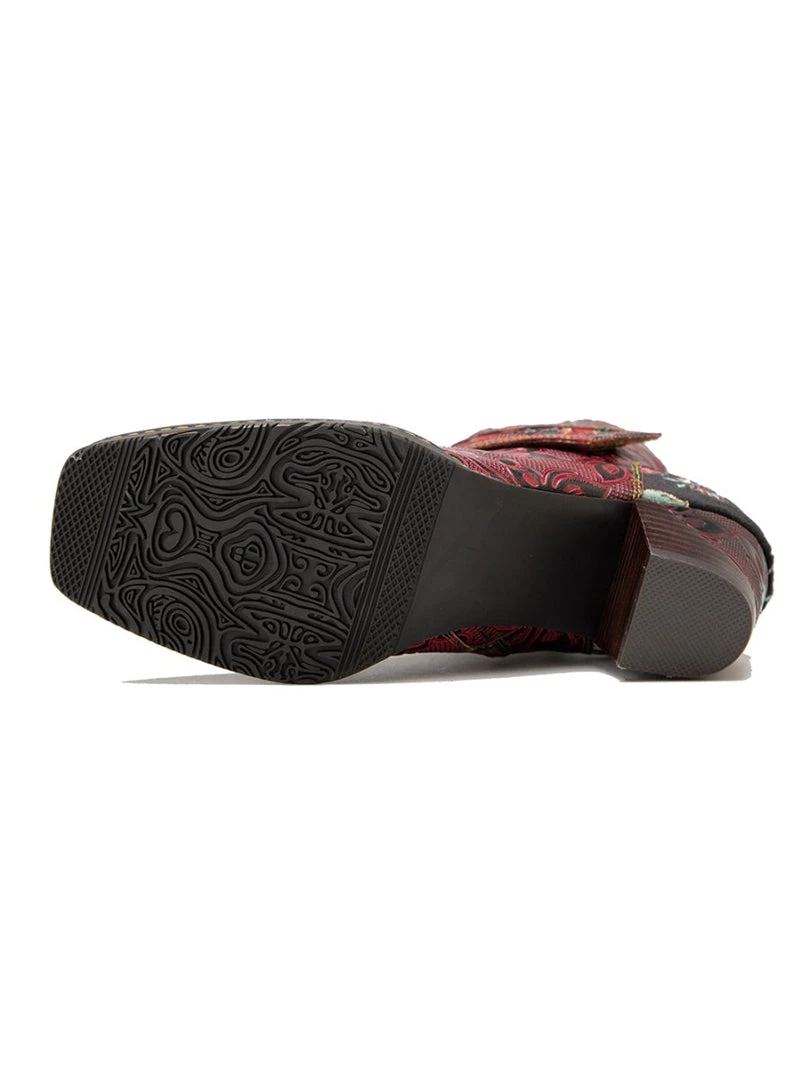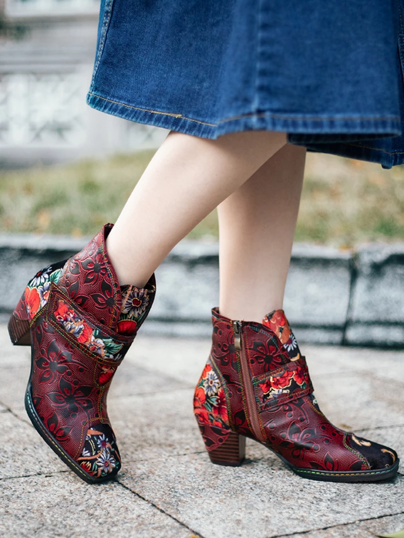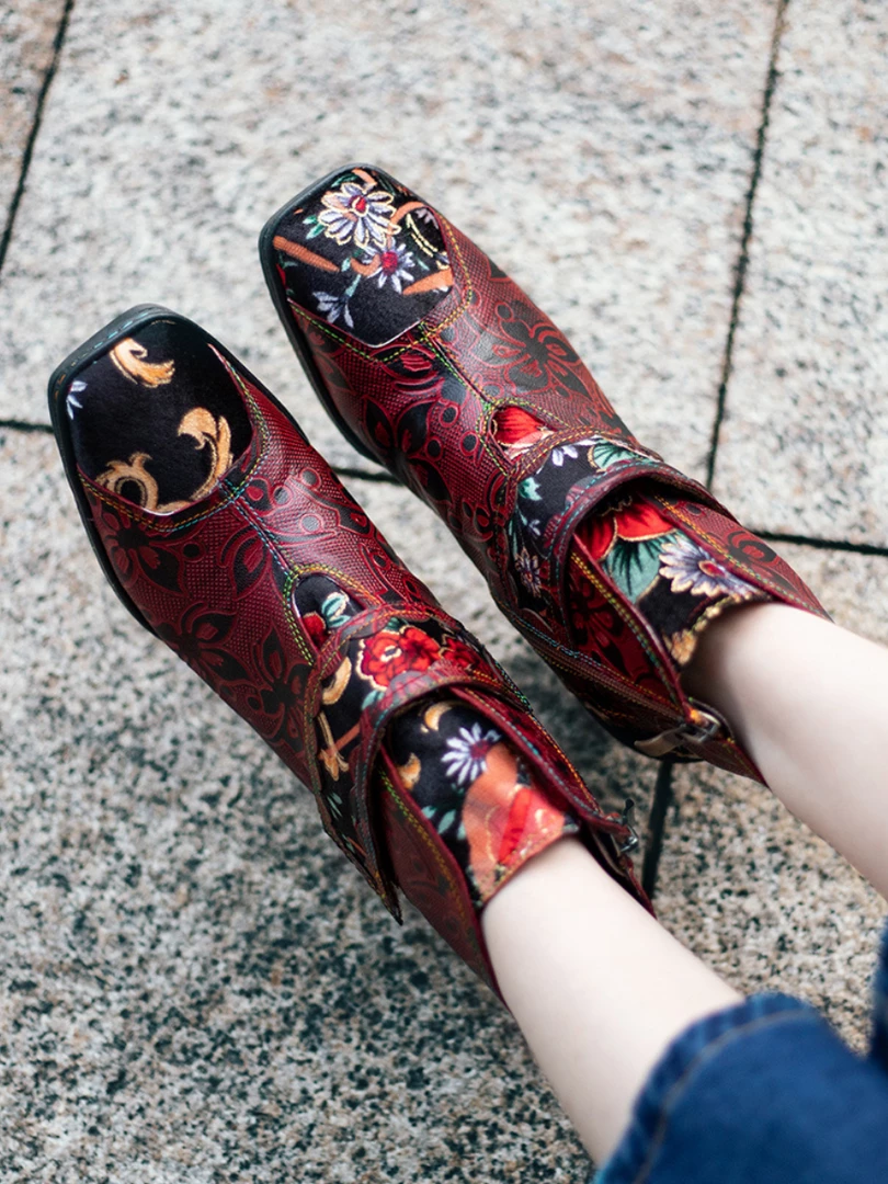 These colorful ankle boots feature playful orchid along the upper and bold buckles around the top for added oomph.