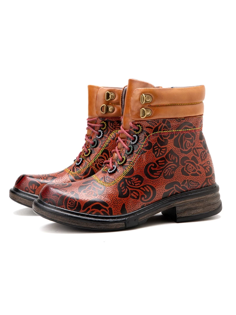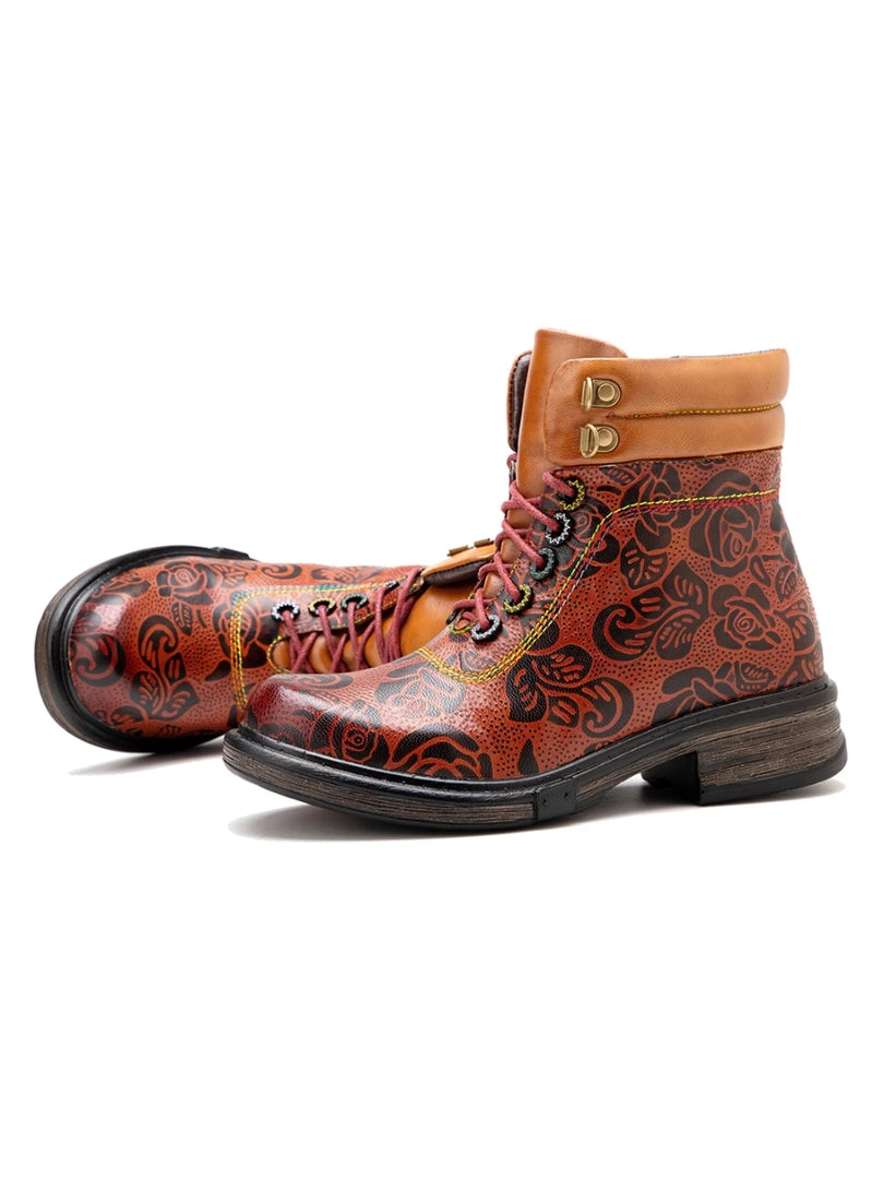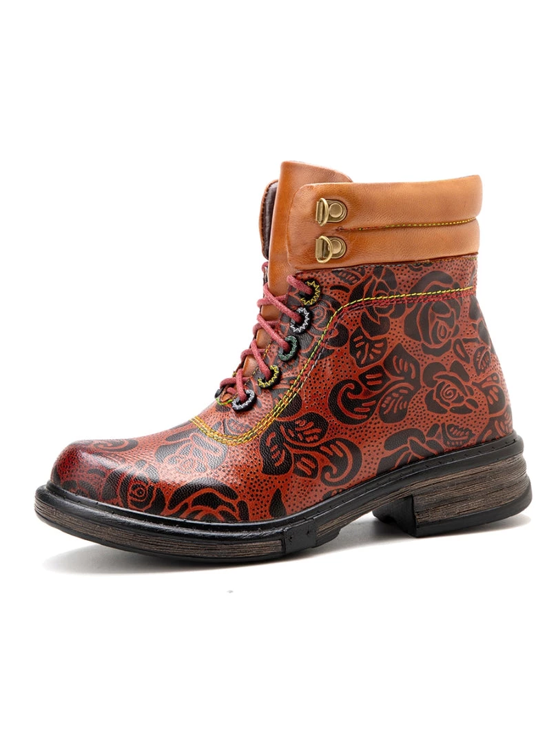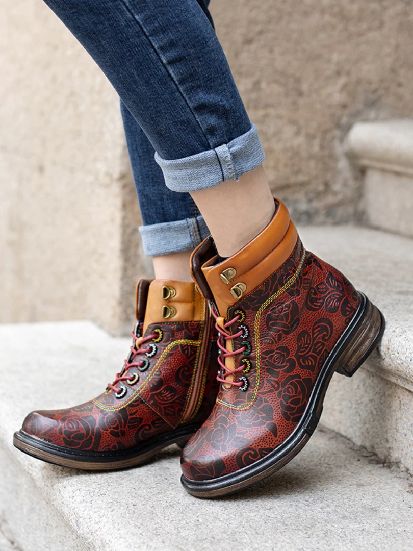 Revamp your boot rotation with this lace-up leather pair boasting open zip trimed shafts and floral prints for stylish strides that pair effortlessly with jeans or leggings.