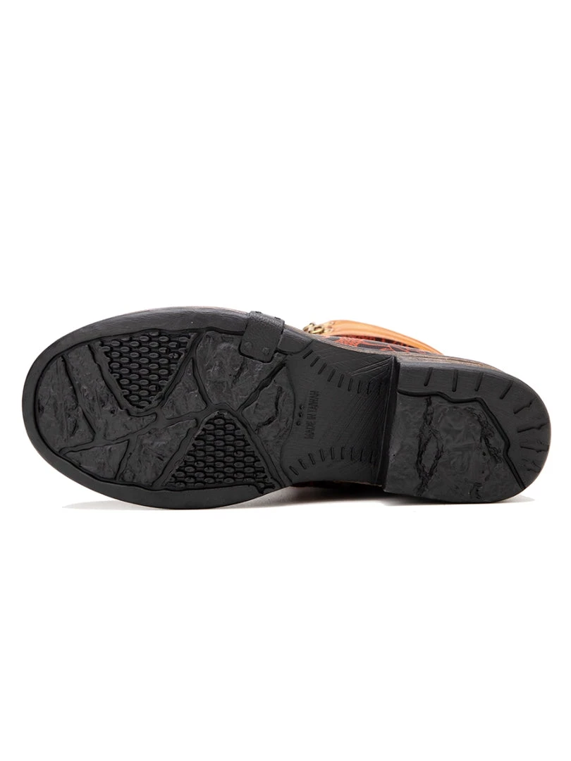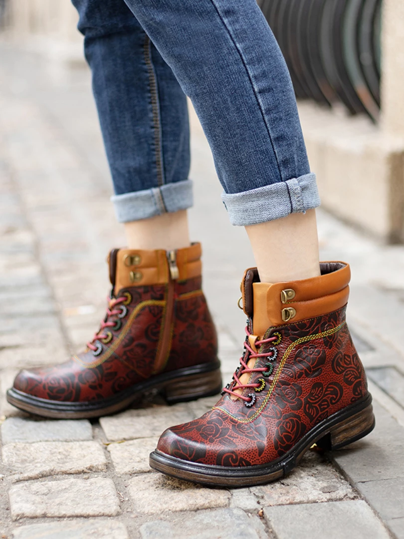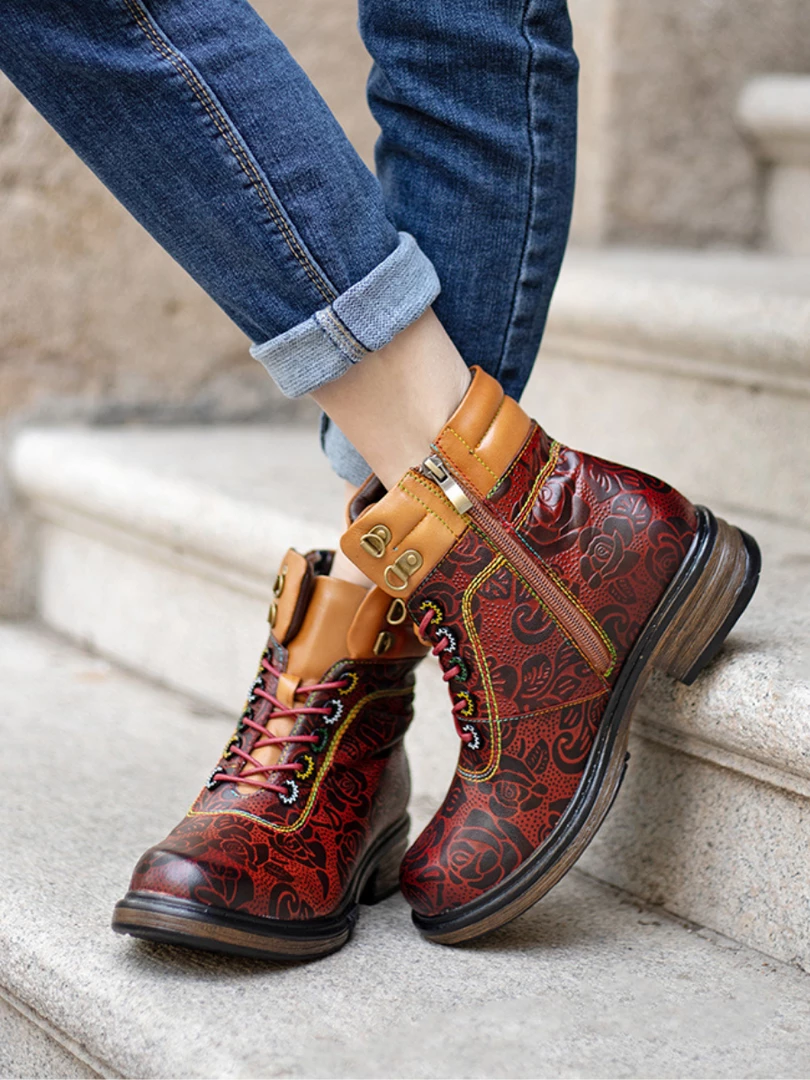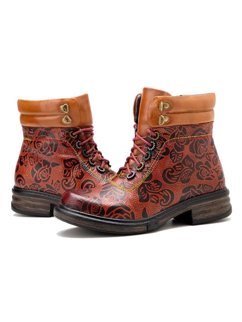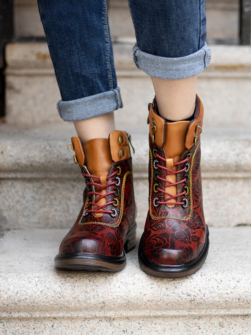 Revamp your boot rotation with this lace-up leather pair boasting open zip trimed shafts and floral prints for stylish strides that pair effortlessly with jeans or leggings.