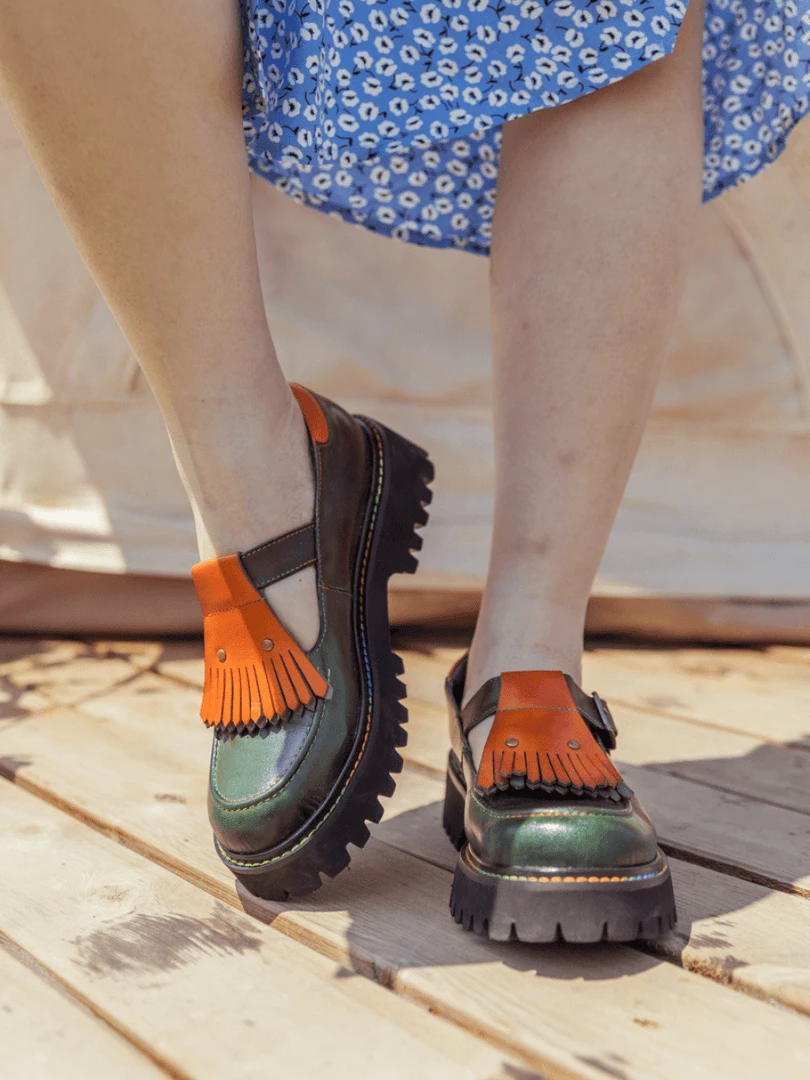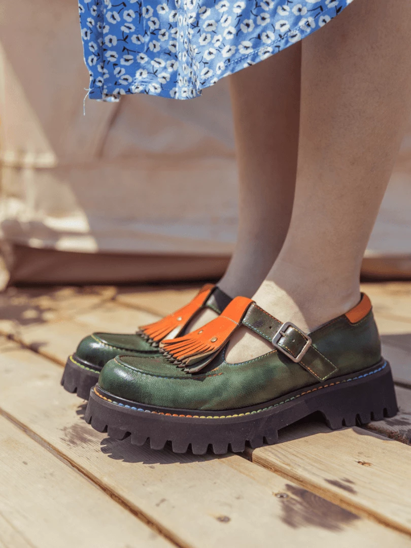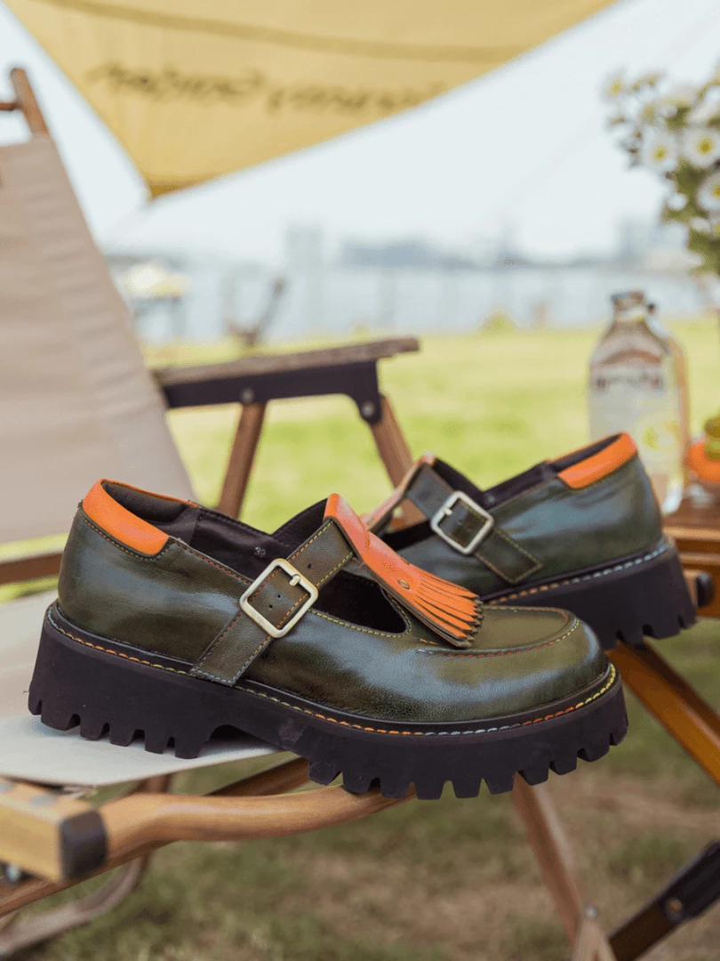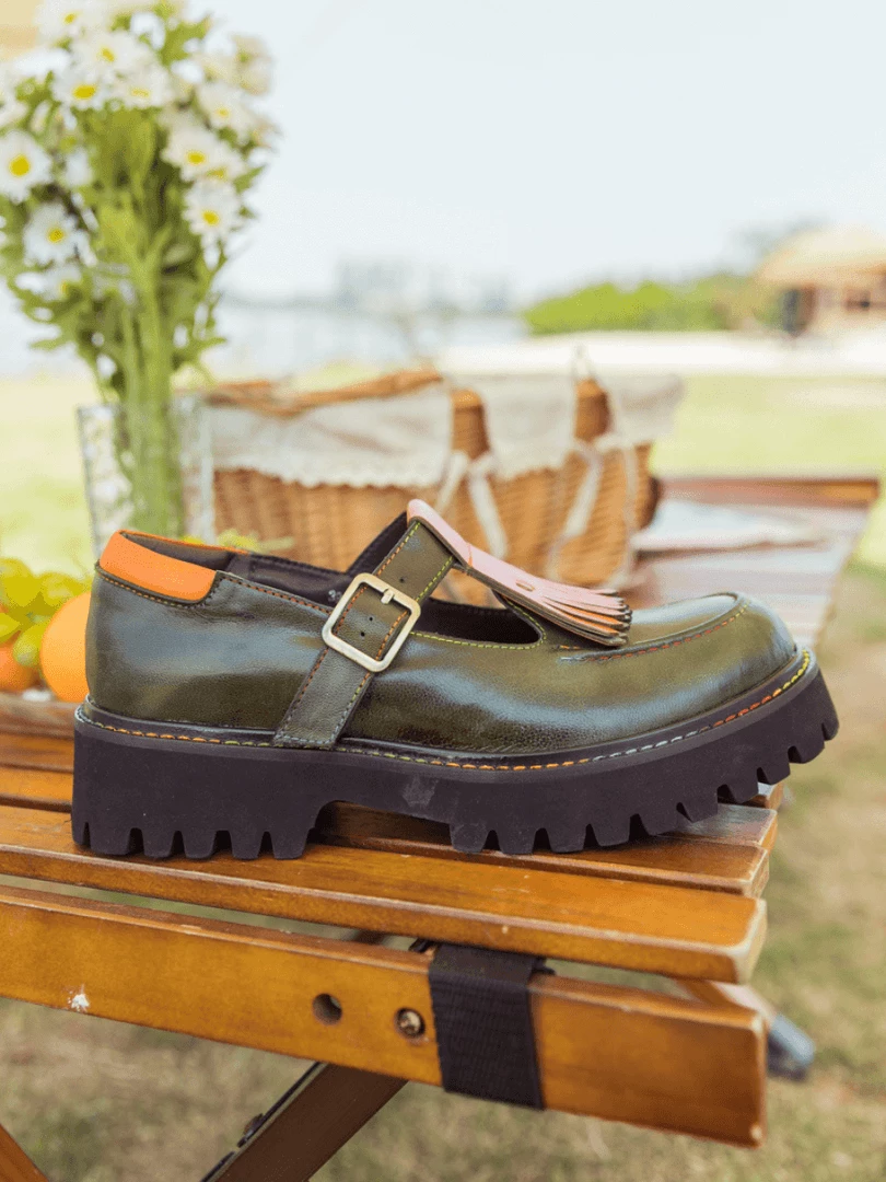 Highlight your warm-weather looks with this leather loafer boasting an elegant seaweed tone and classic Mary Jane designs and orange tassel.