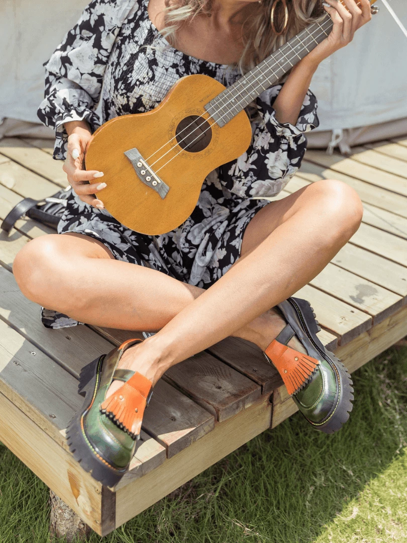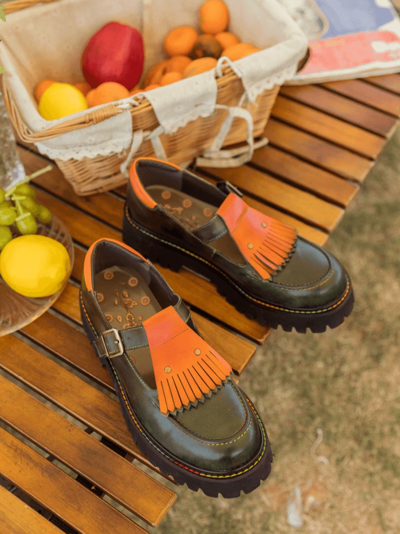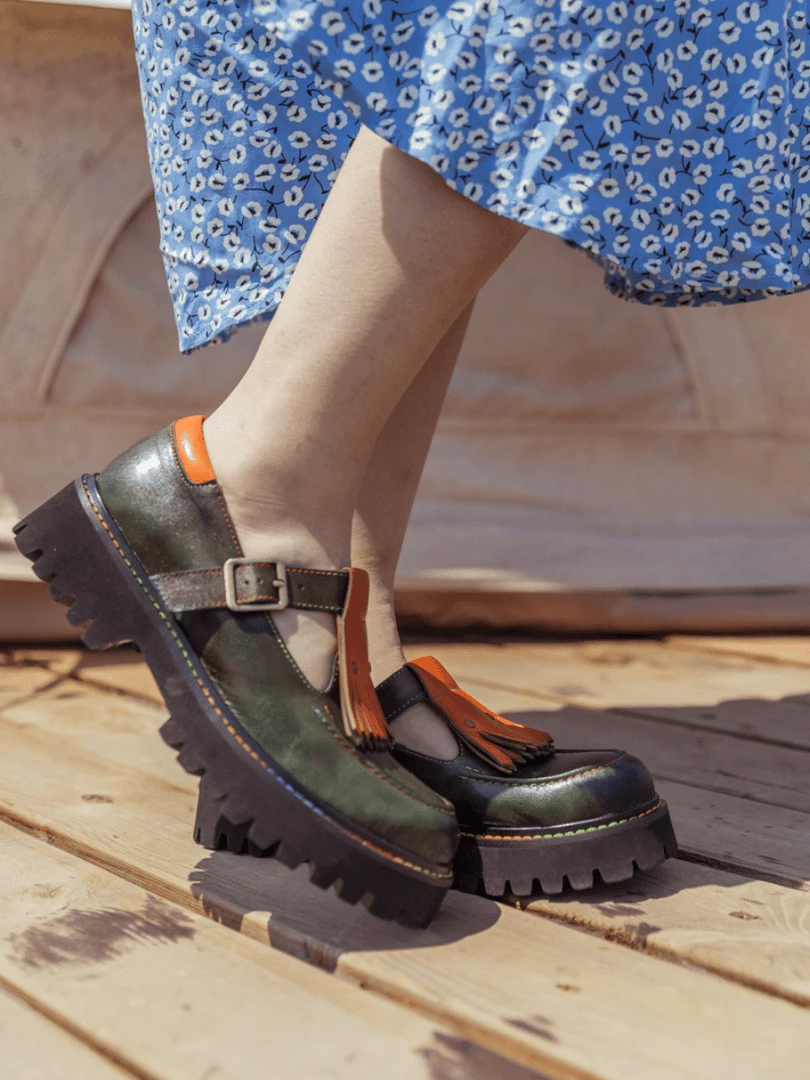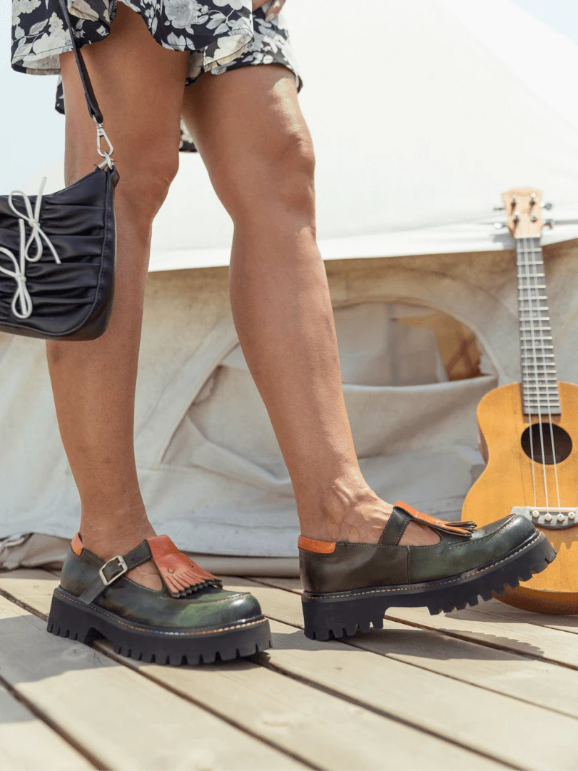 Highlight your warm-weather looks with this leather loafer boasting an elegant seaweed tone and classic Mary Jane designs and orange tassel.