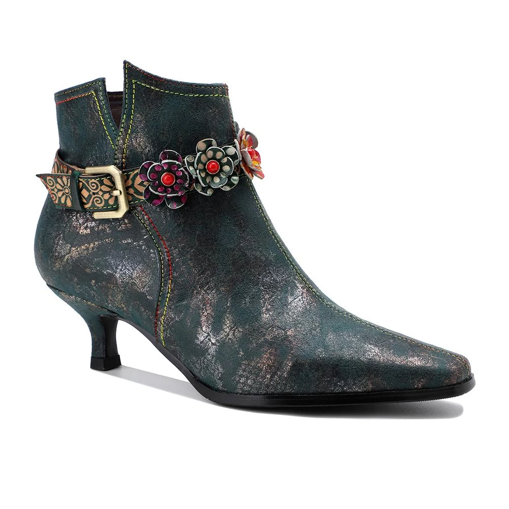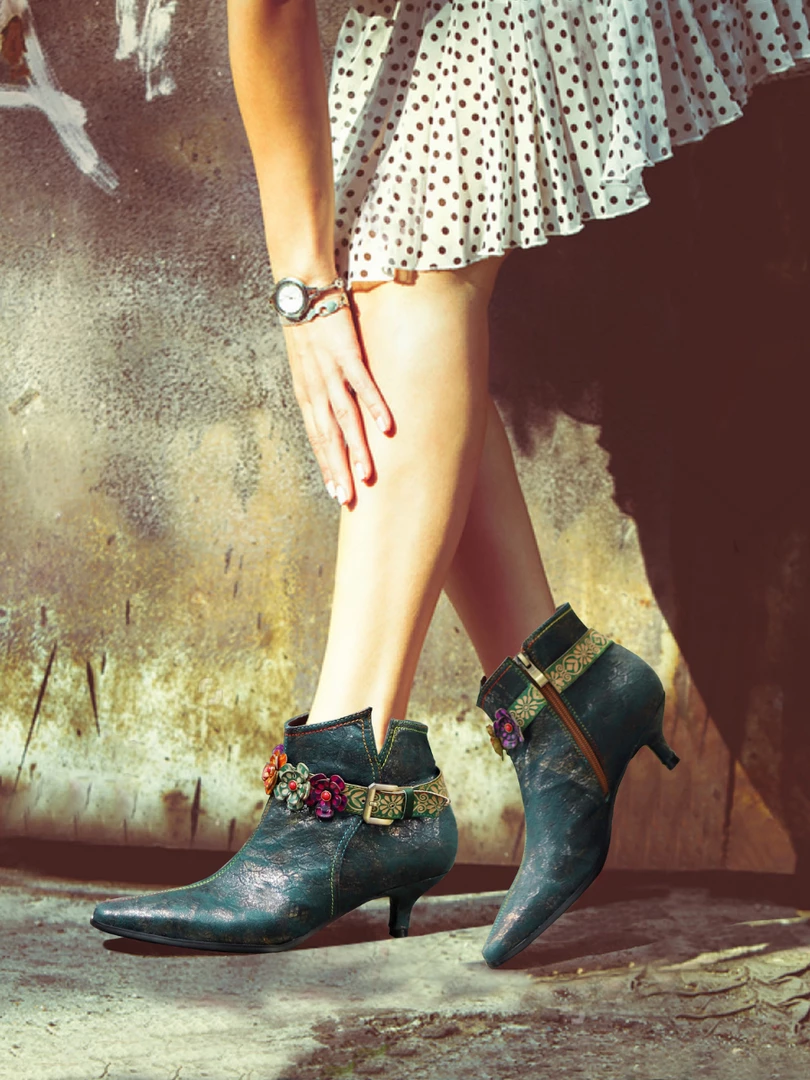 Give your footwear collection a stylish boost with this slightly-lifted bootie showing off a deep hue and floral buckle strap.