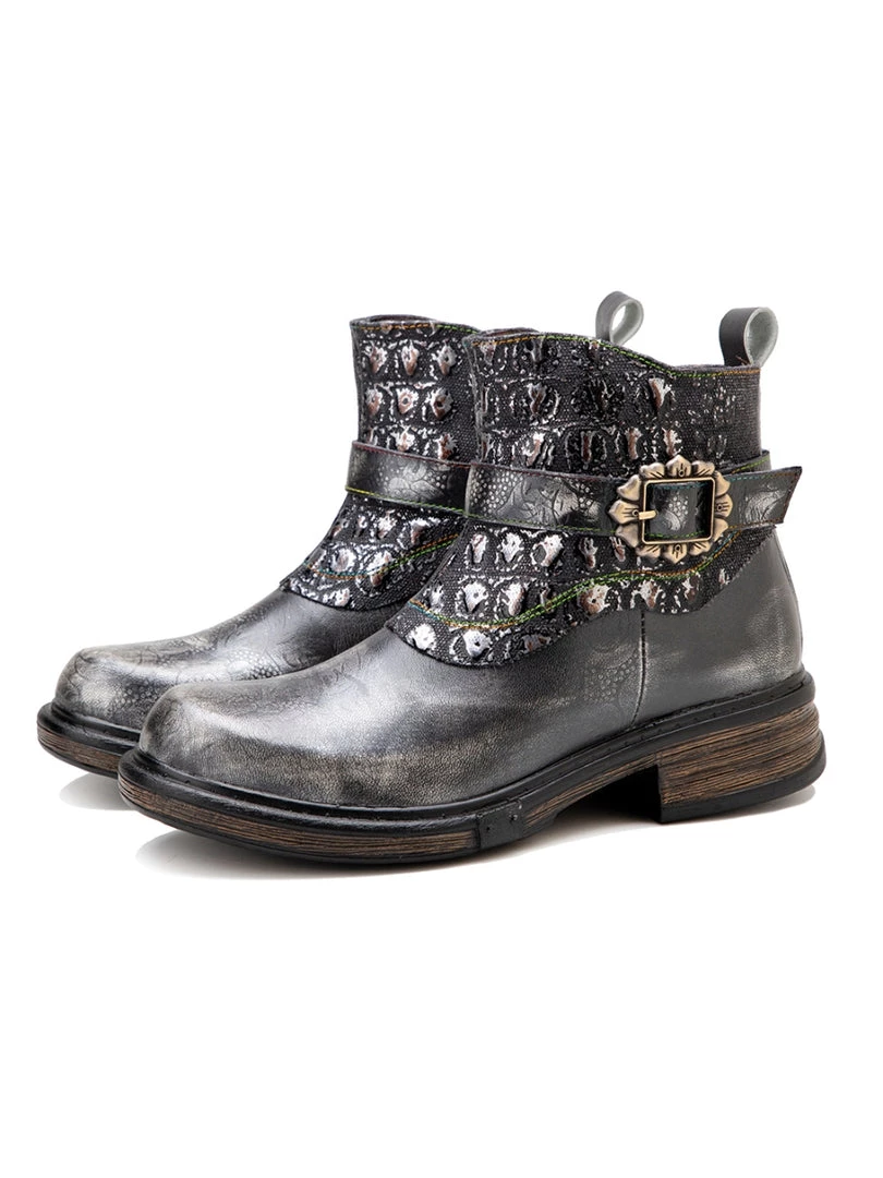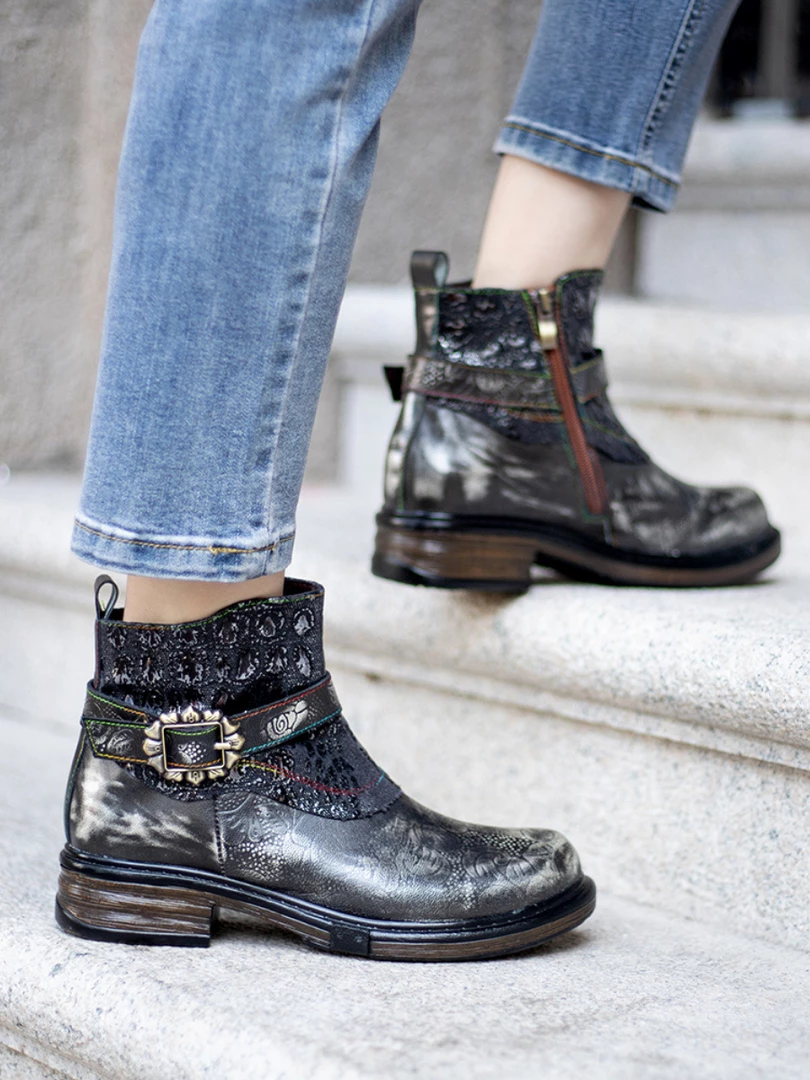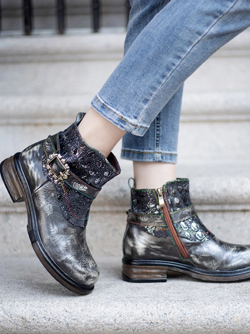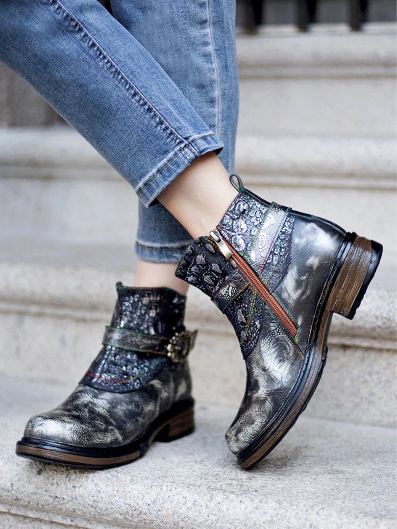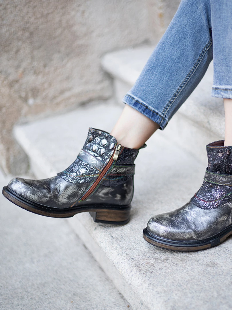 Revamp your boot rotation with this meteorite leather pair boasting floral embossed shafts and chunky treaded soles for stylish strides that pair effortlessly with jeans or leggings.