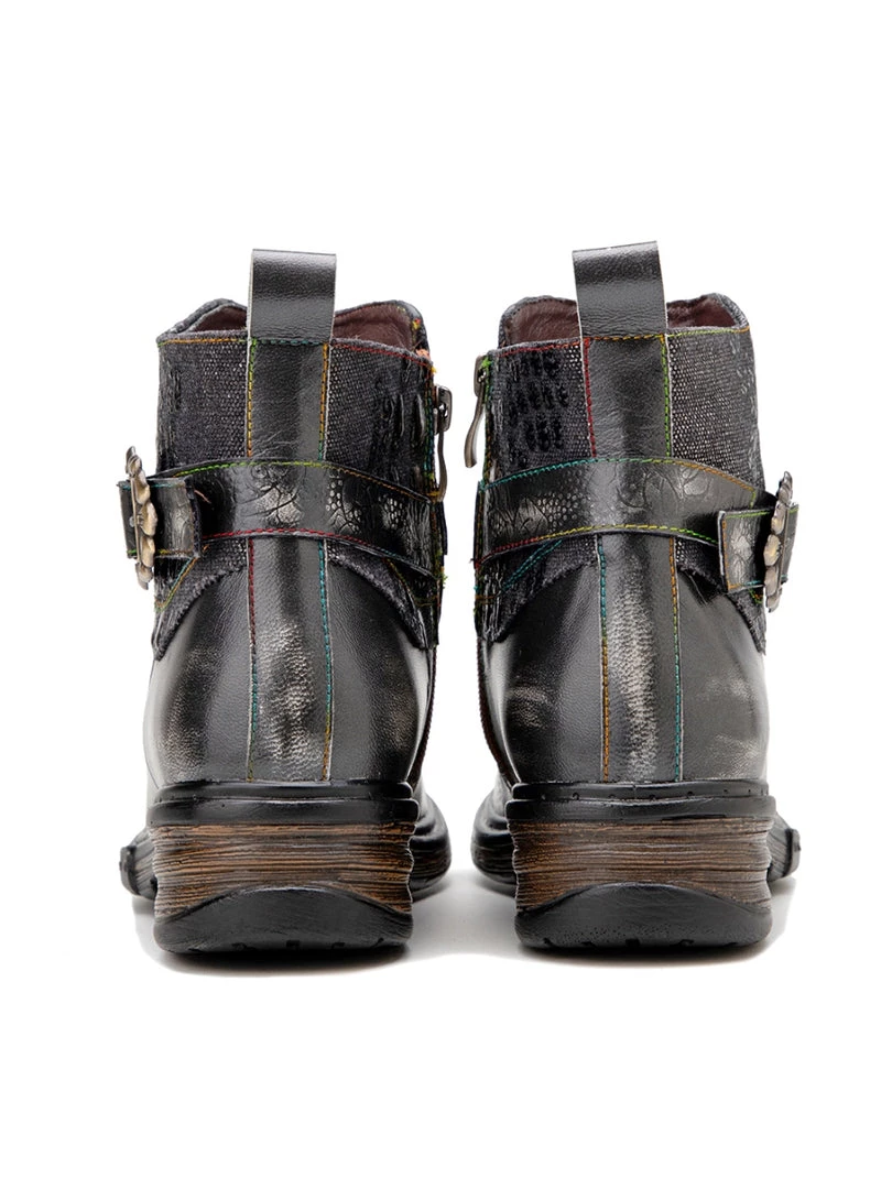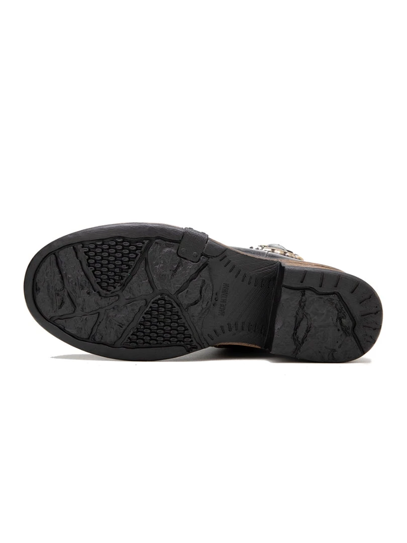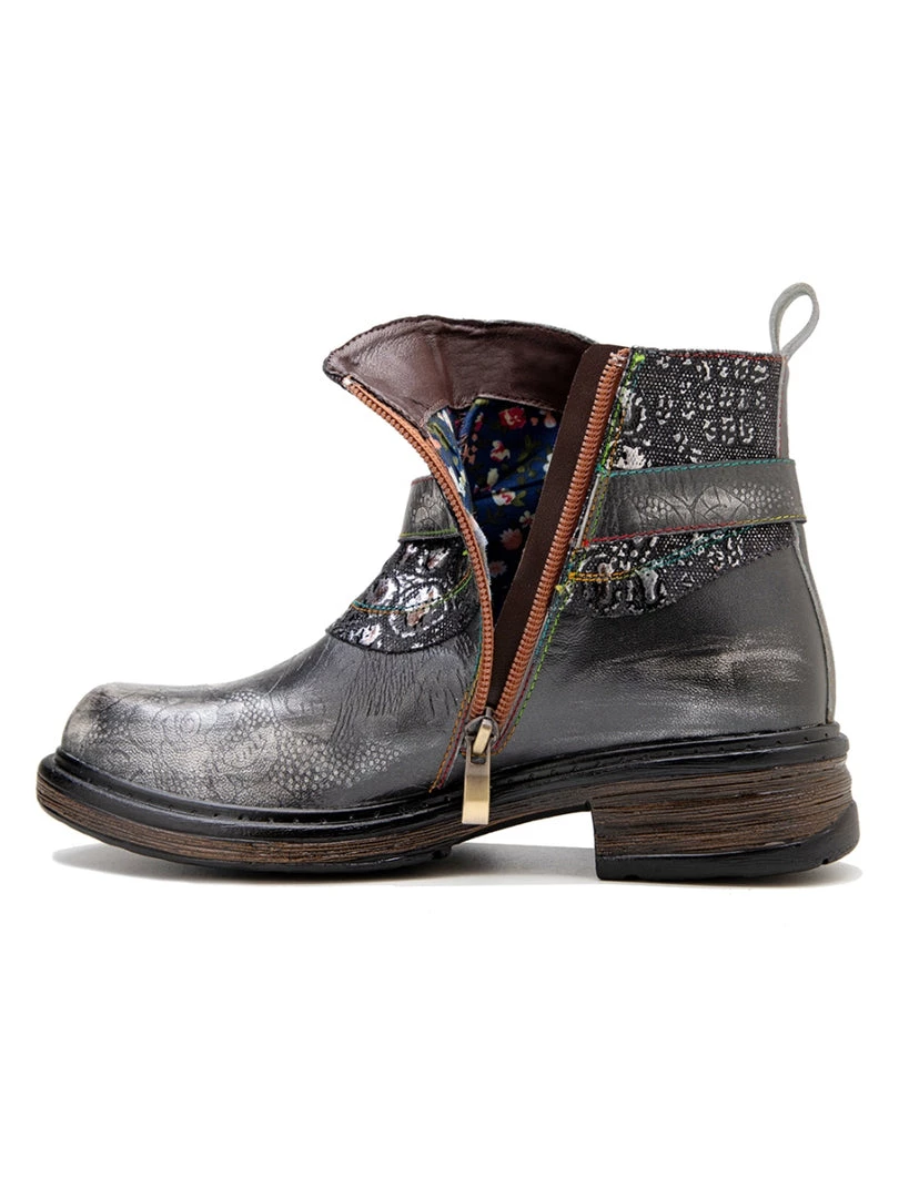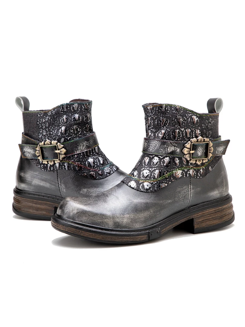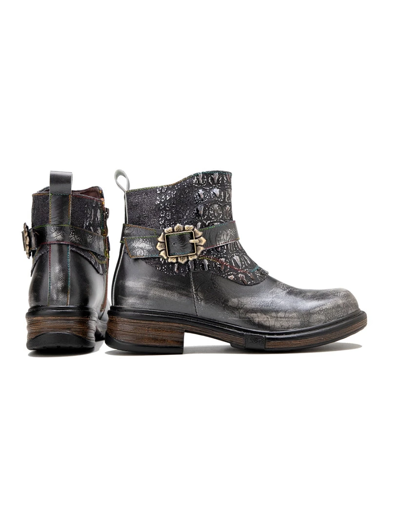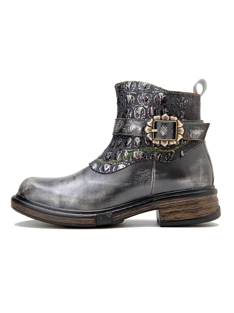 Revamp your boot rotation with this meteorite leather pair boasting floral embossed shafts and chunky treaded soles for stylish strides that pair effortlessly with jeans or leggings.
