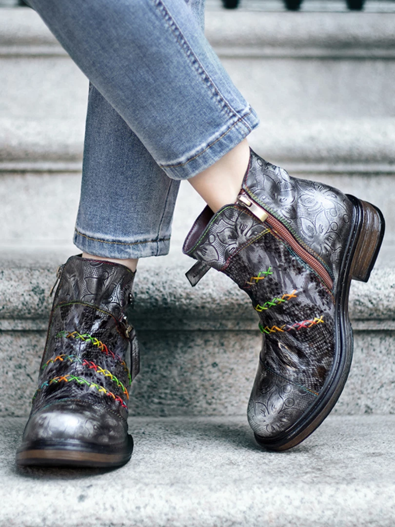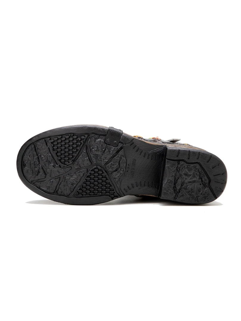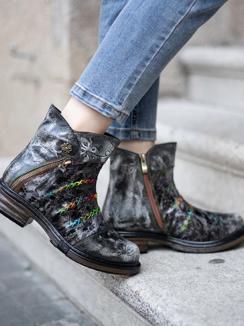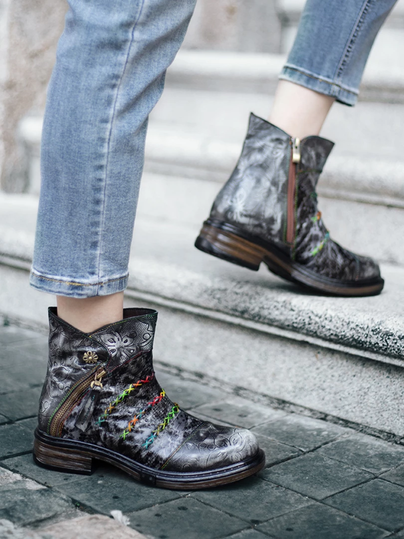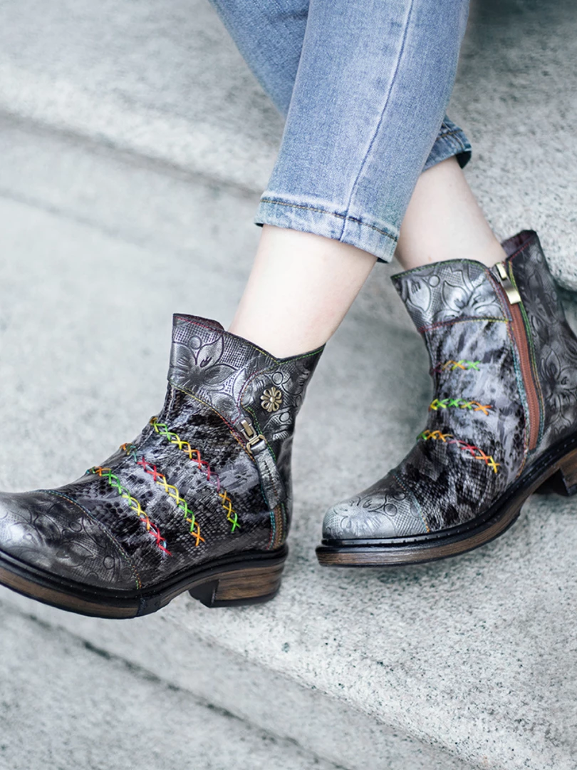 Designed to be a work of art that you can wear, these finest cow leather boots feature an intricate embossed floral design in vibrant hues with multi color stitch for a elegant looking.