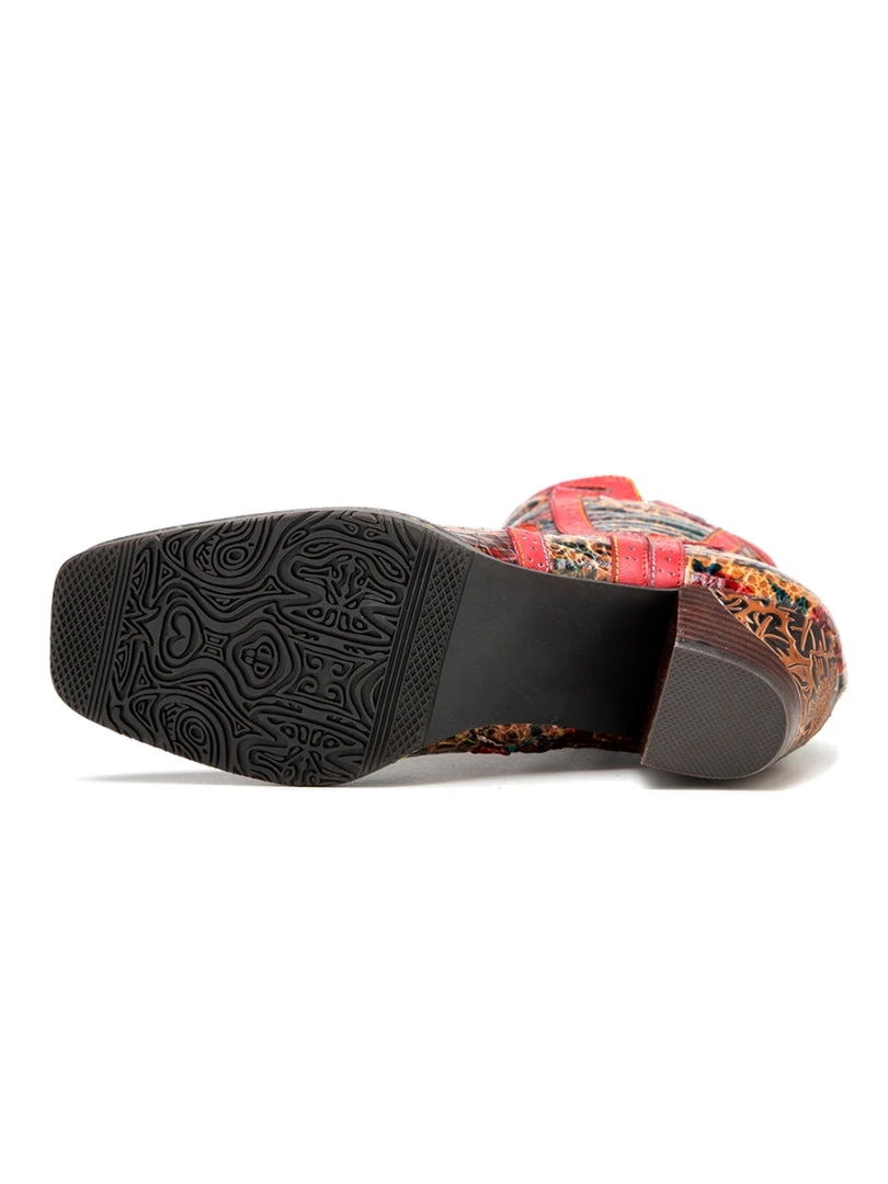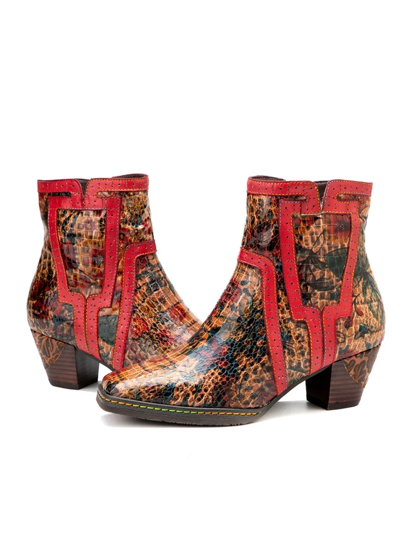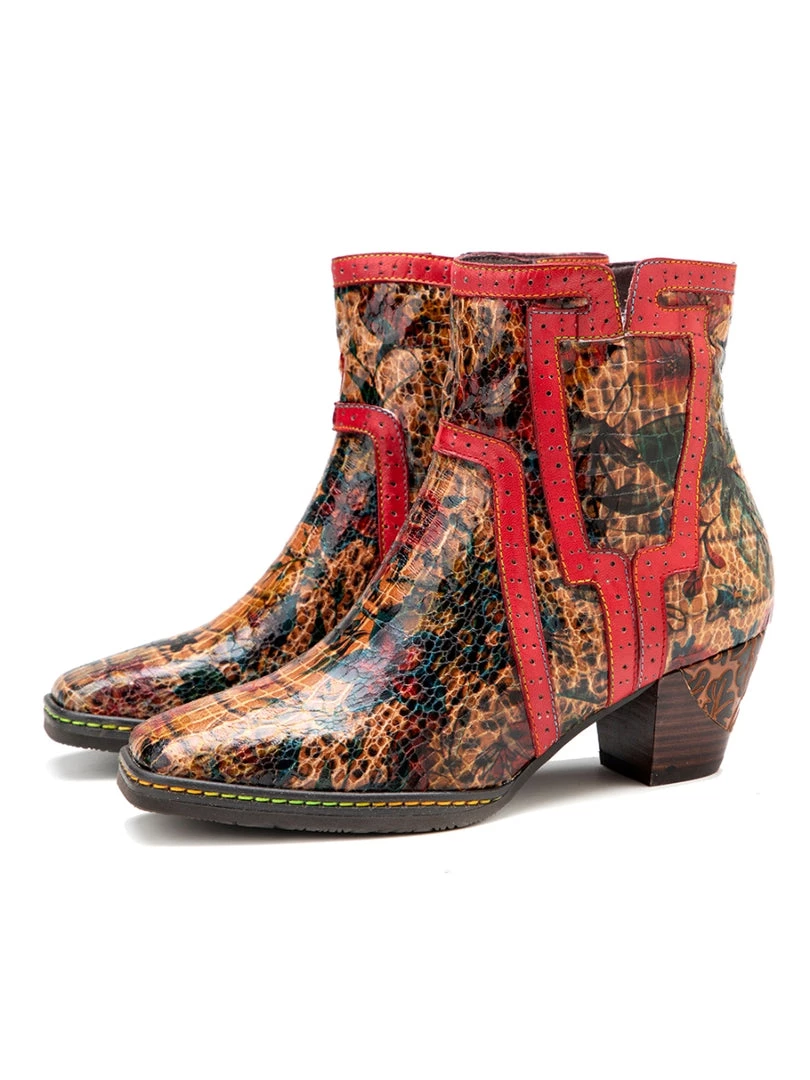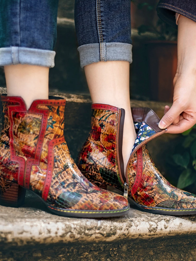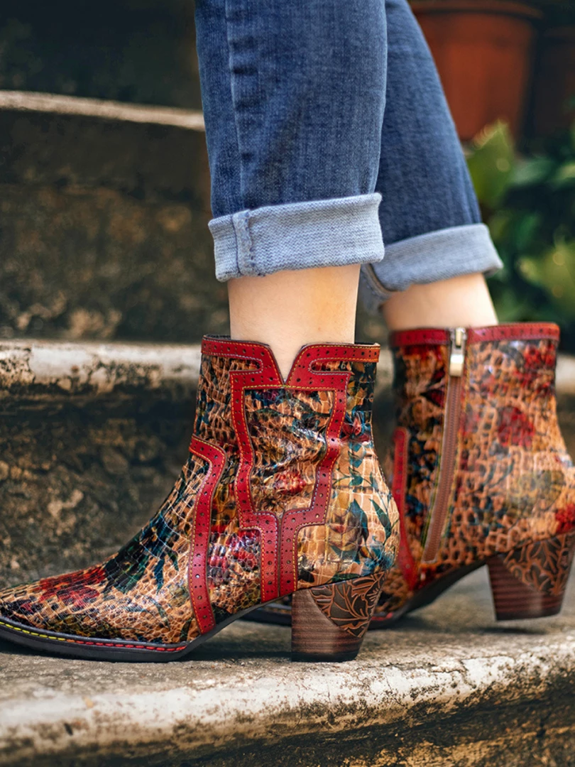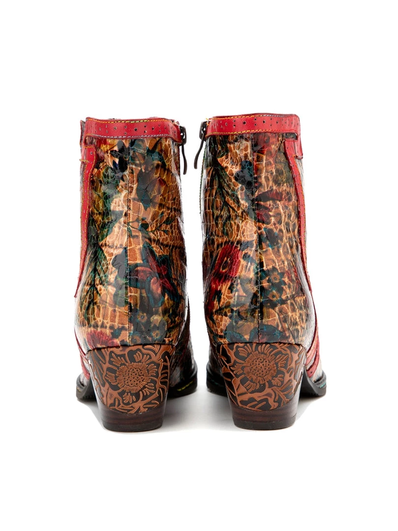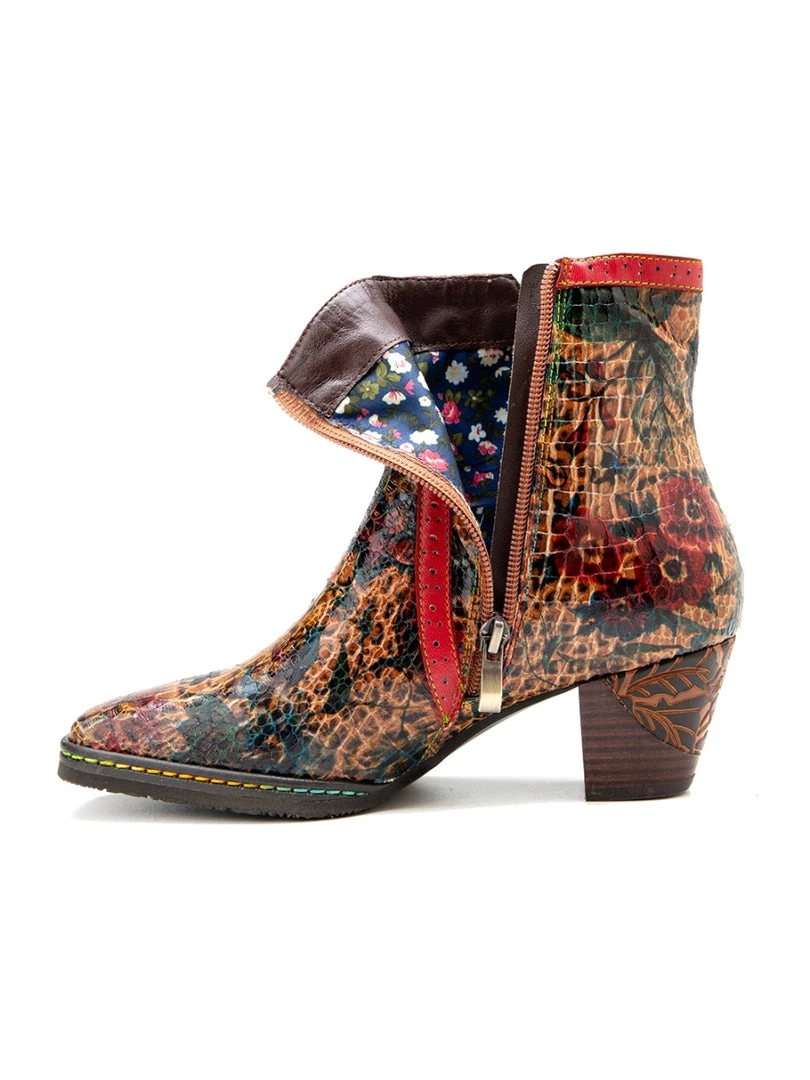 These colorful ankle boots feature playful ancient terracotta print along the upper and back floral embossed block heel for added oomph.