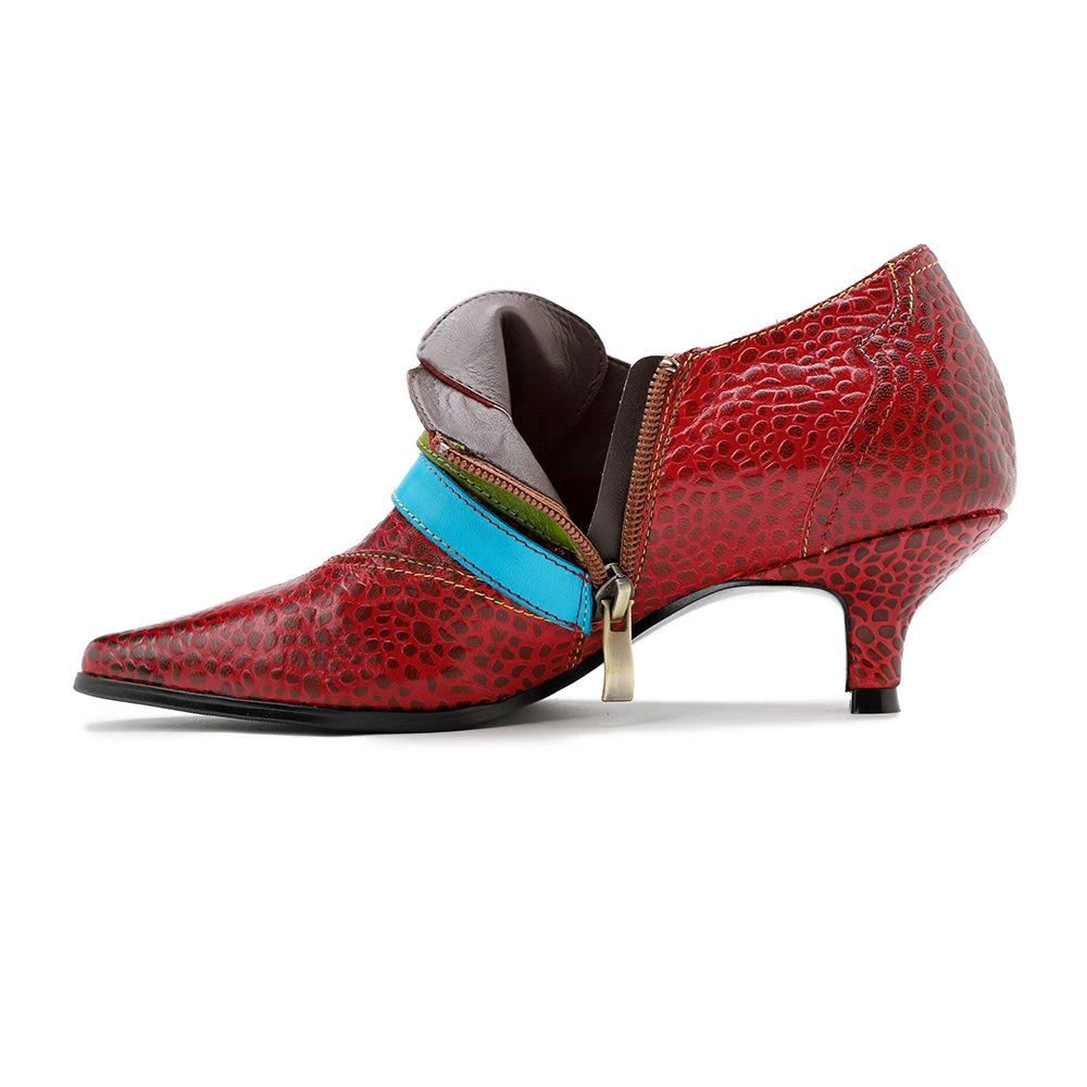 Bring your looks to life with the vintage-inspired style of this luxe leather bootie enhanced with rich colors and sculpted reliefs details.