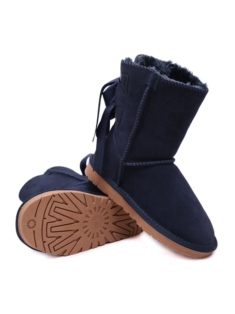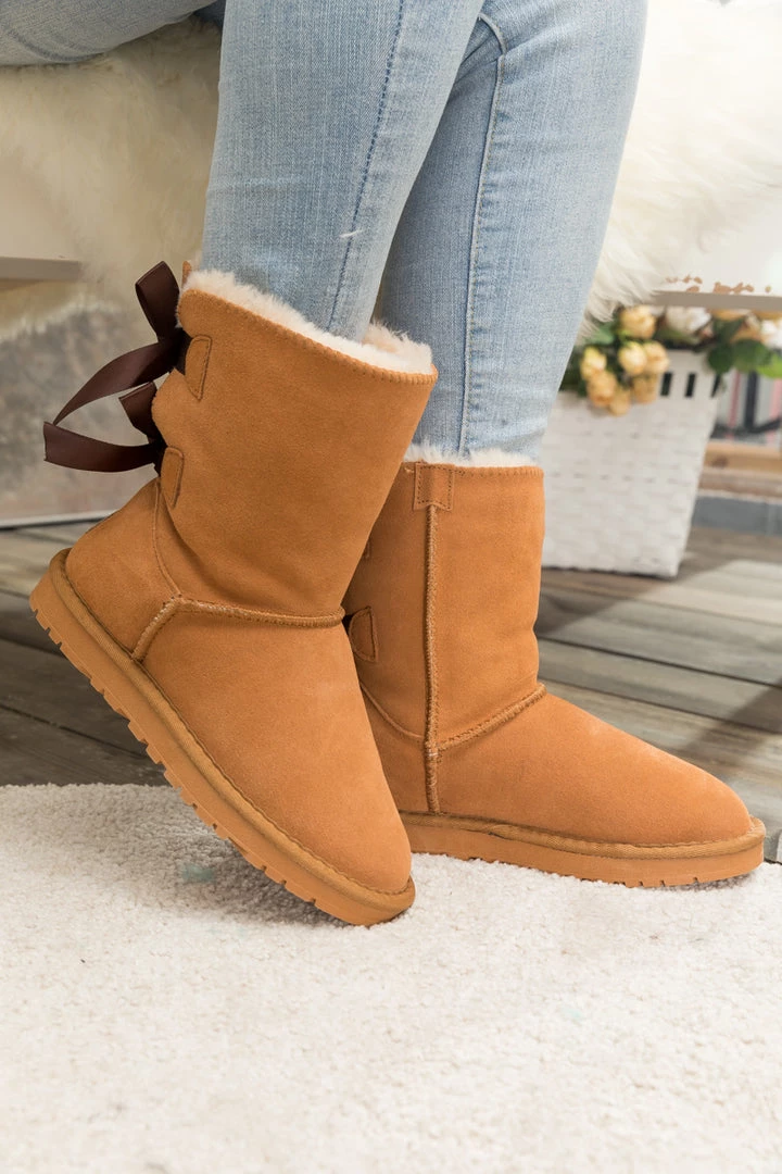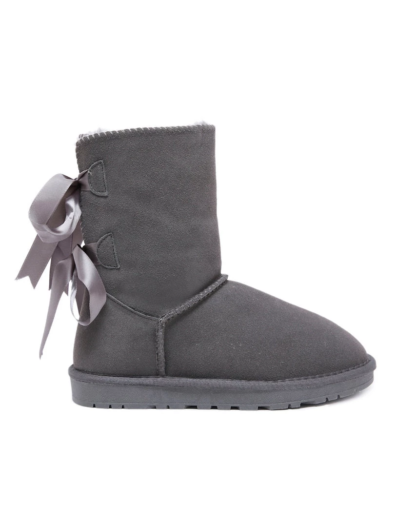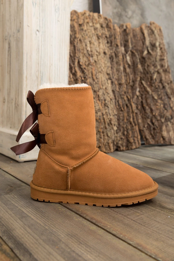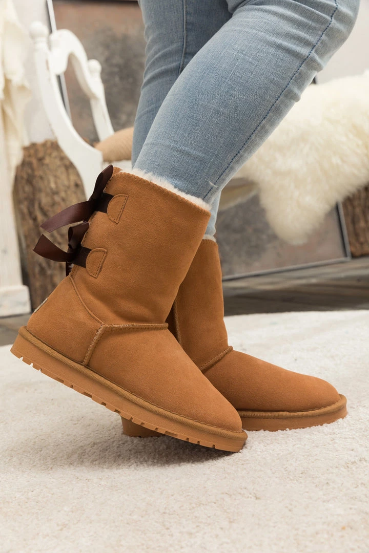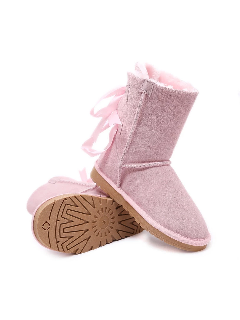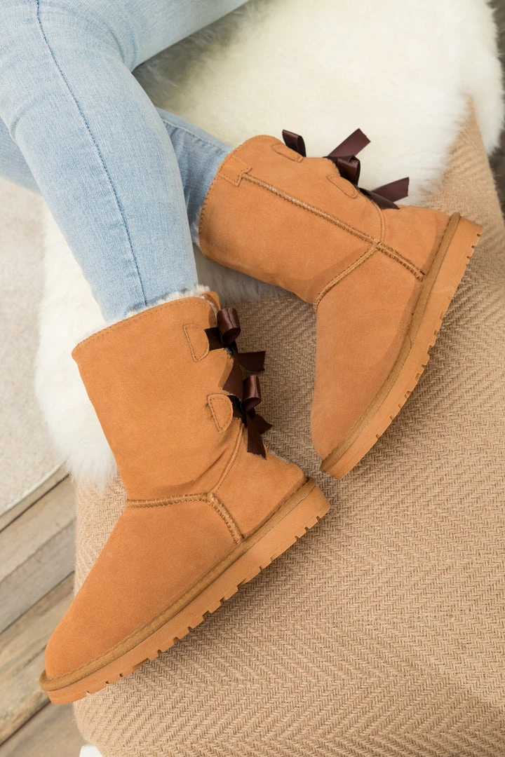A bold double-bow detail in back puts a fun feminine twist on the classic shearling style in these genuine suede boots. A plush faux fur lining cushions your feet in supreme softness and warmth.