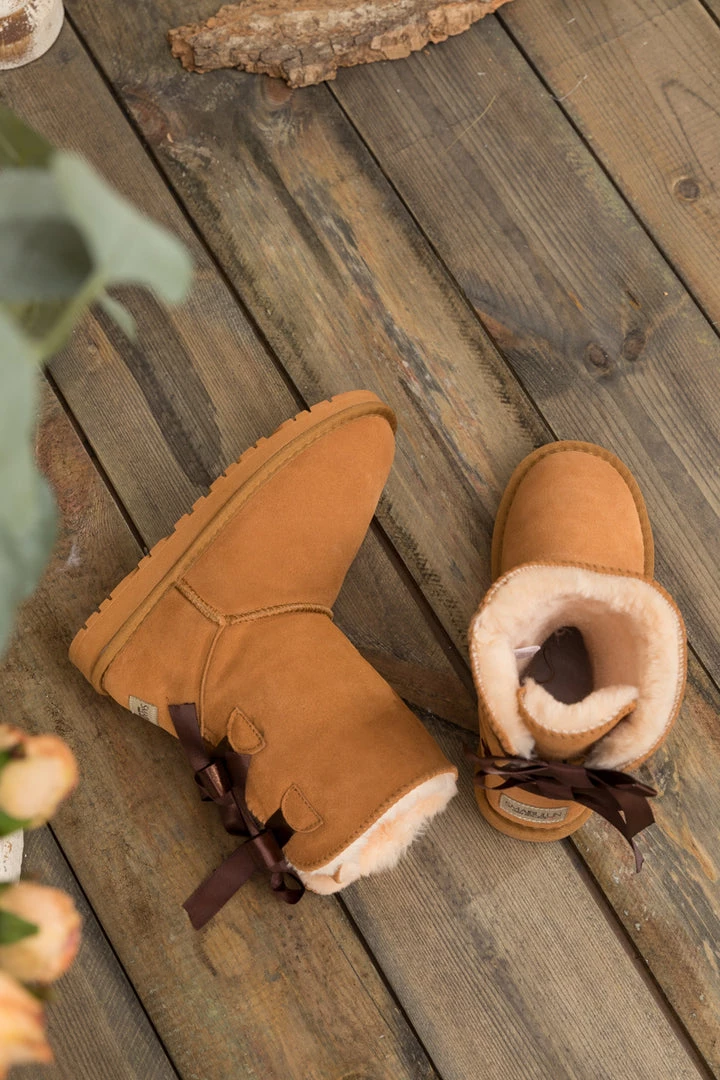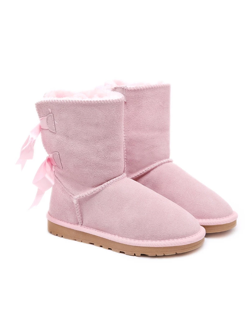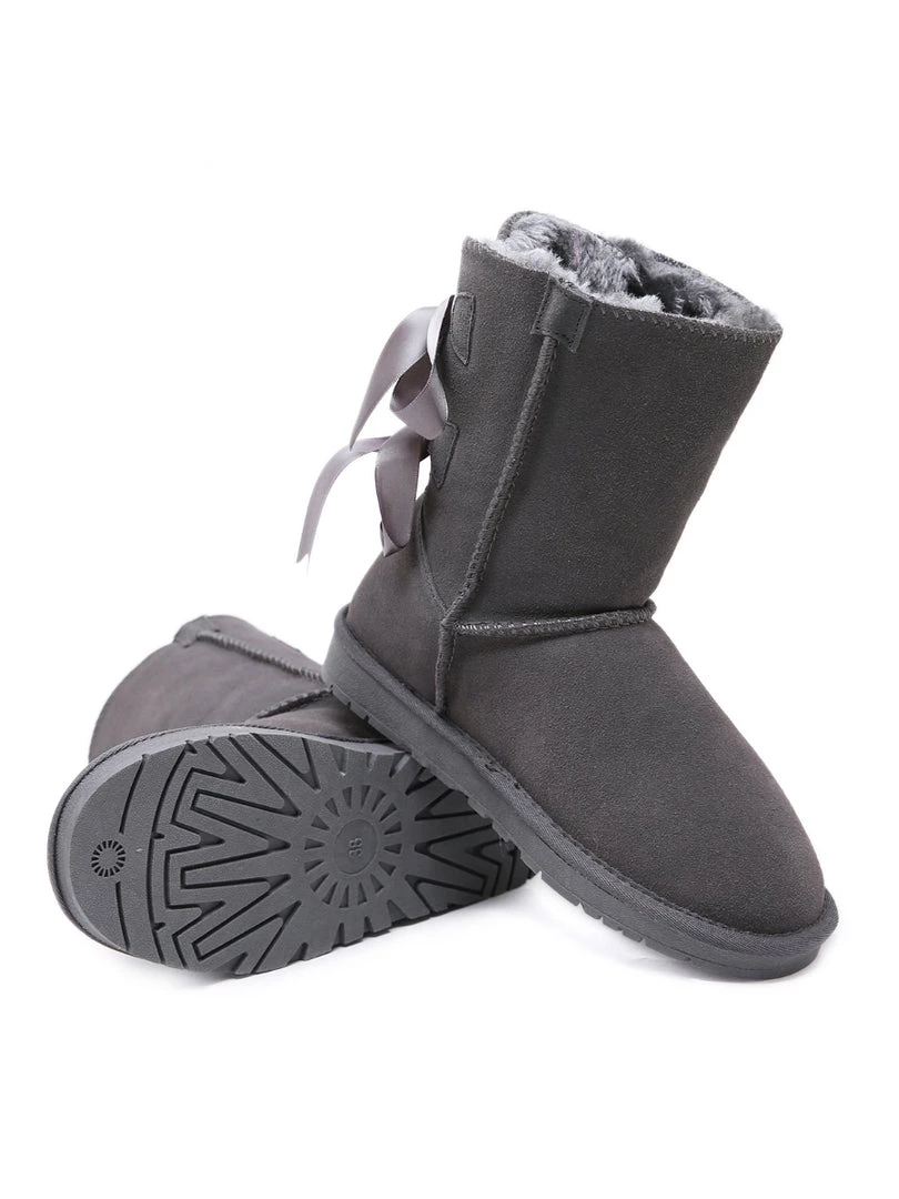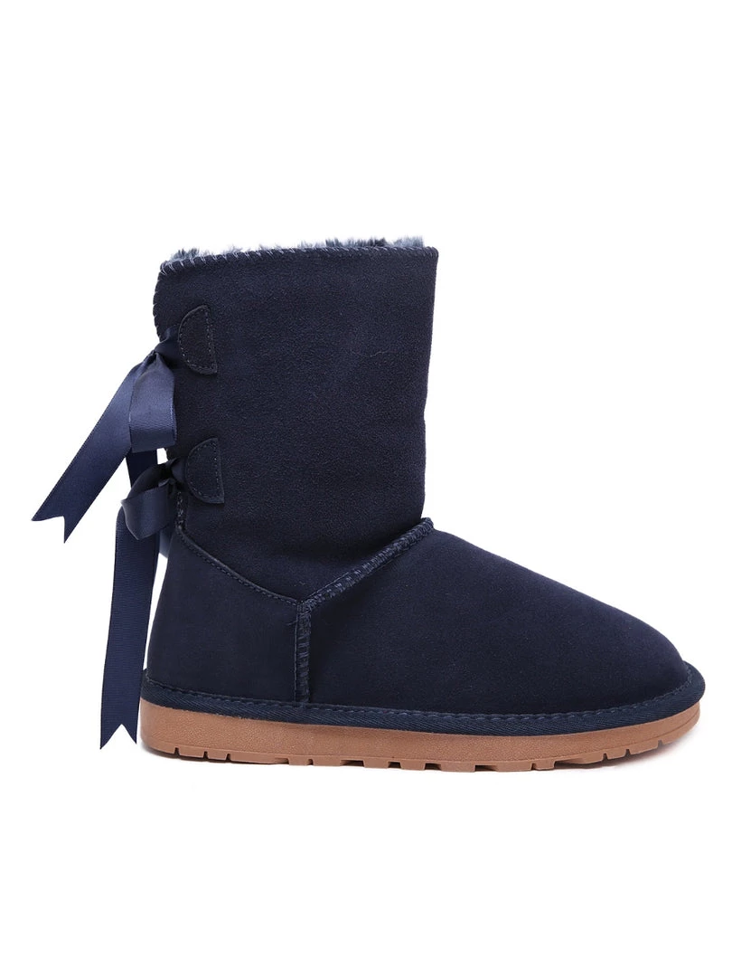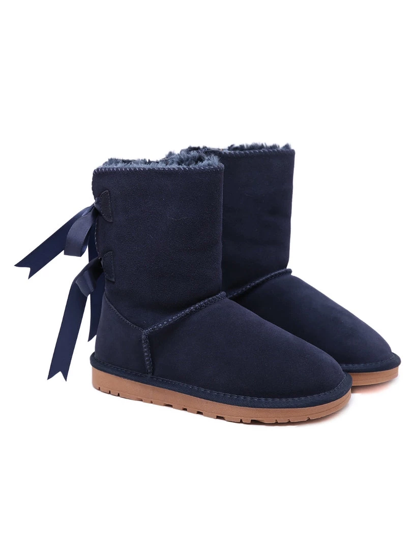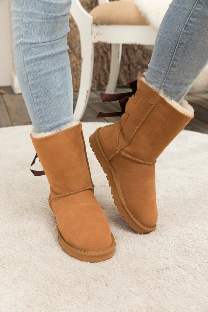 A bold double-bow detail in back puts a fun feminine twist on the classic shearling style in these genuine suede boots. A plush faux fur lining cushions your feet in supreme softness and warmth.
