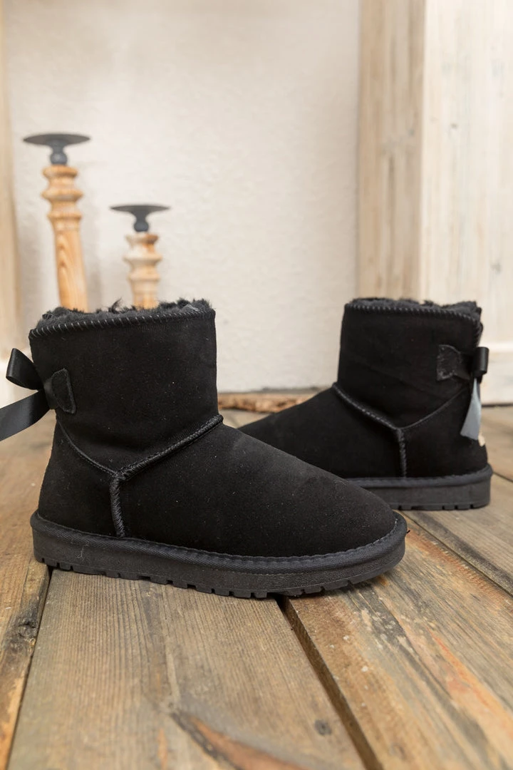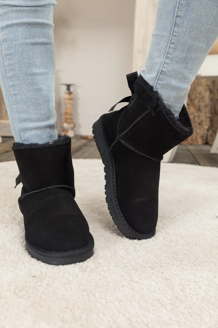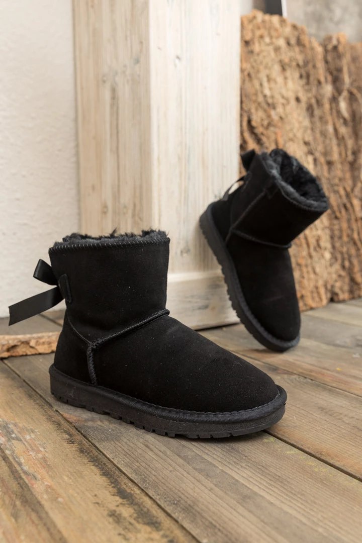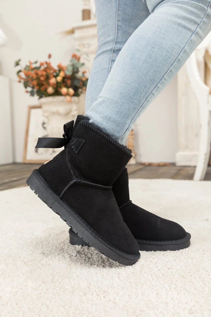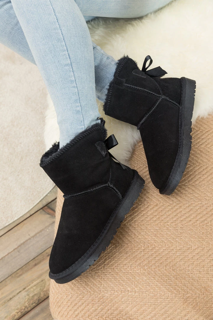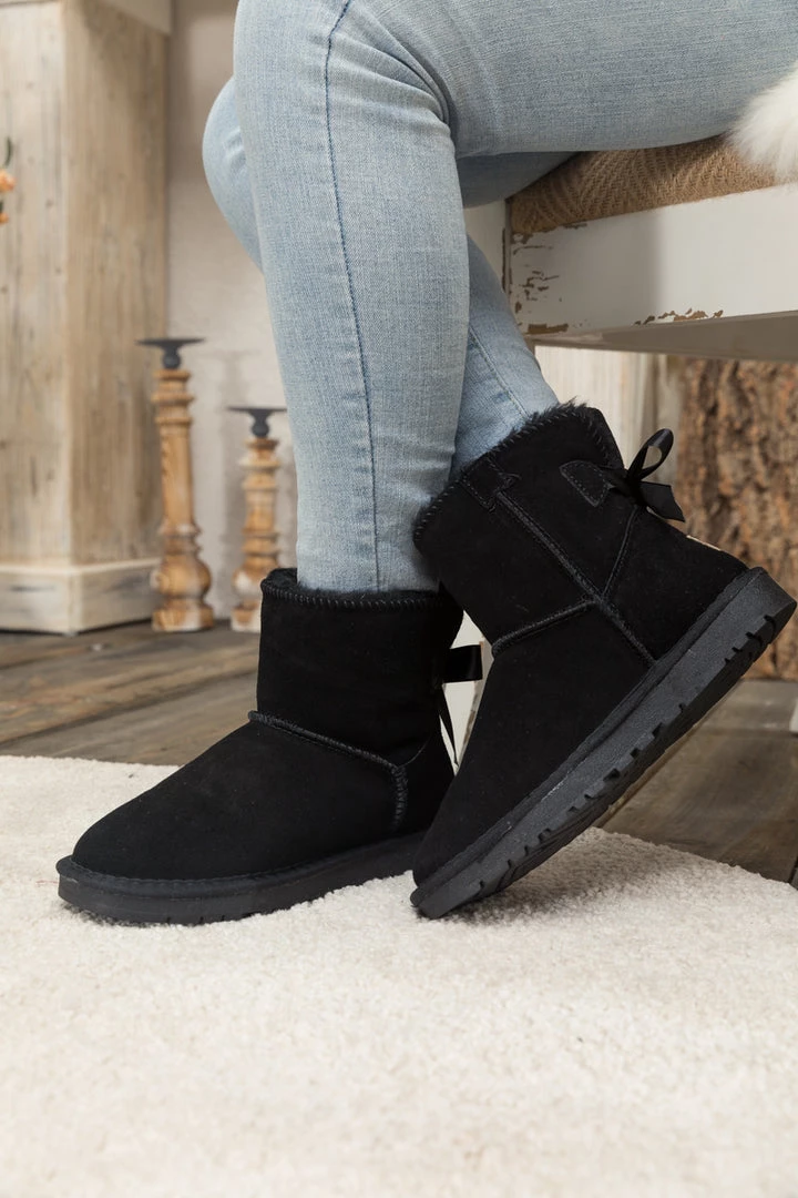A bold bow detail in back puts a fun feminine twist on the classic shearling style in these genuine suede boots. A plush faux fur lining cushions your feet in supreme softness and warmth.
