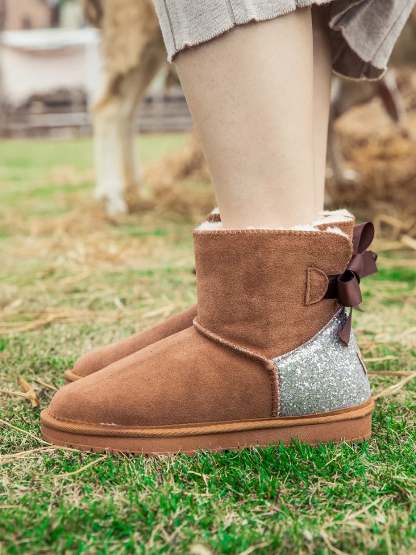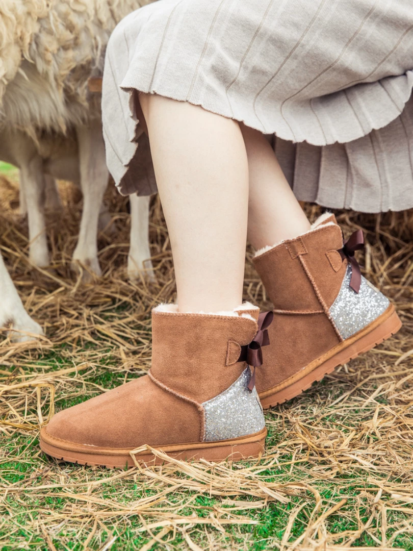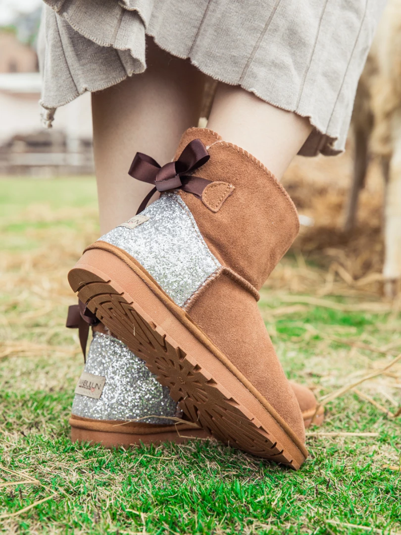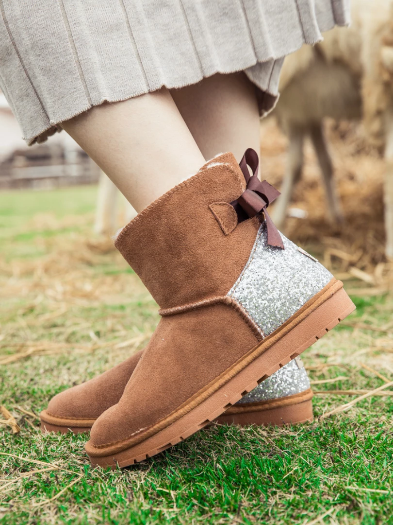 XH SMAIBULUN UGG™ | Back Sequins Ribbon Bow Faux Fur-Lined Suede Boots – Chestnut NEW ARRIVALS