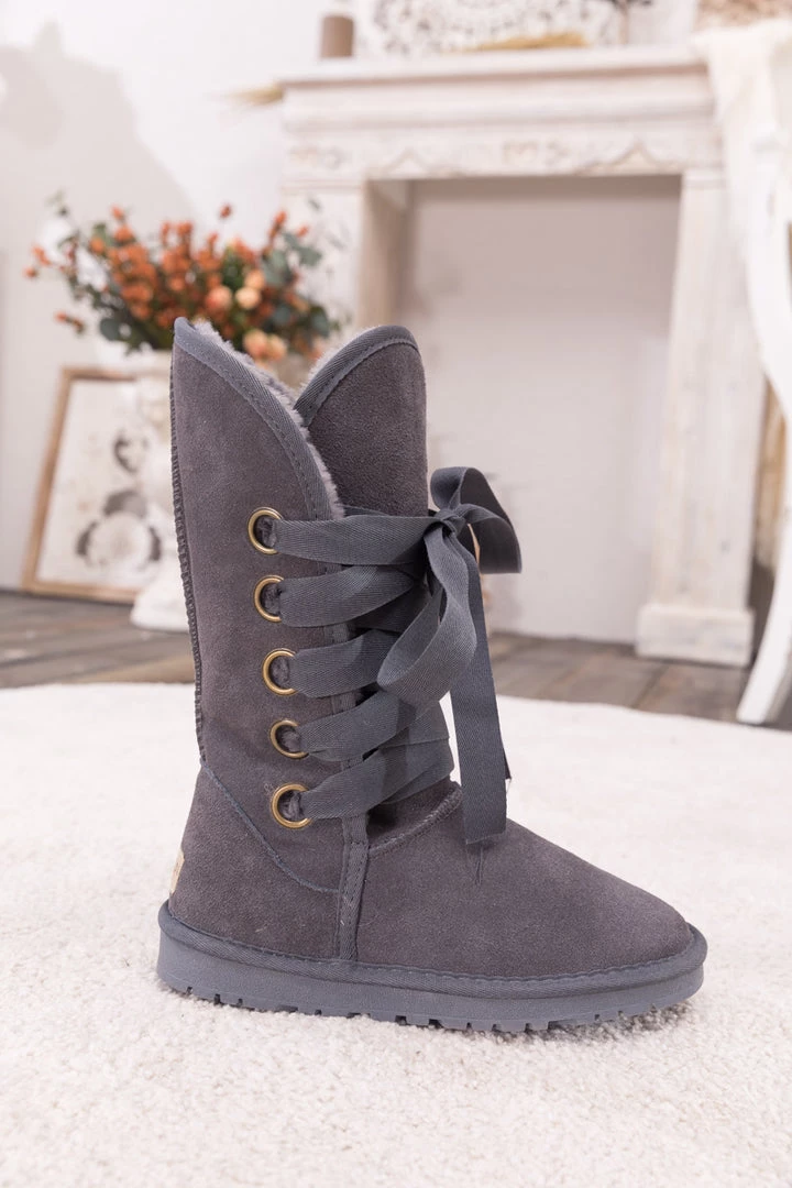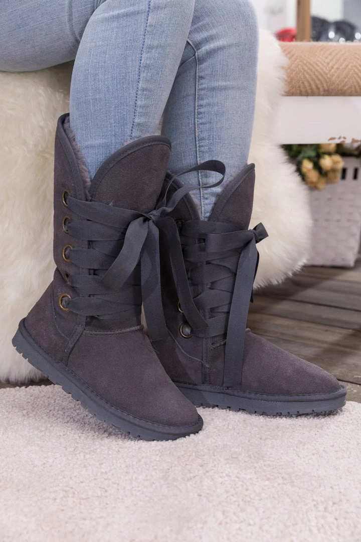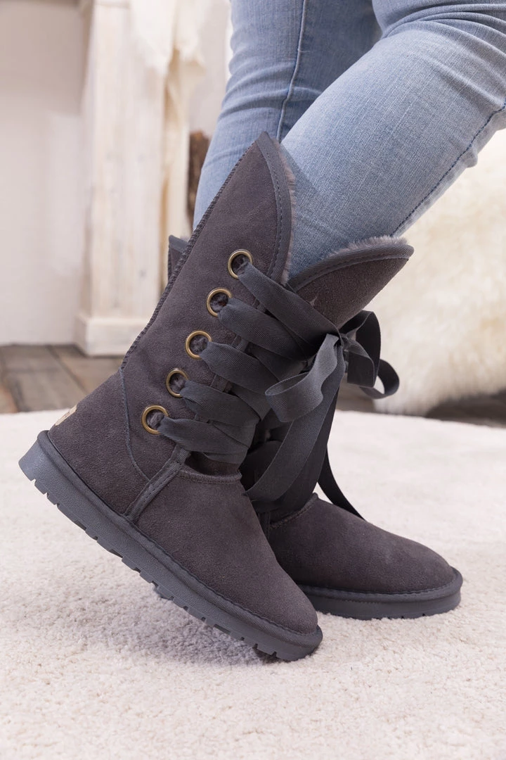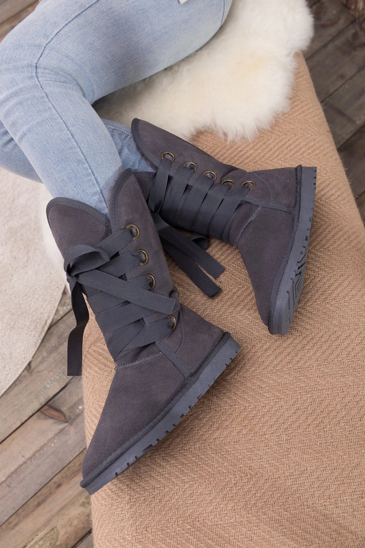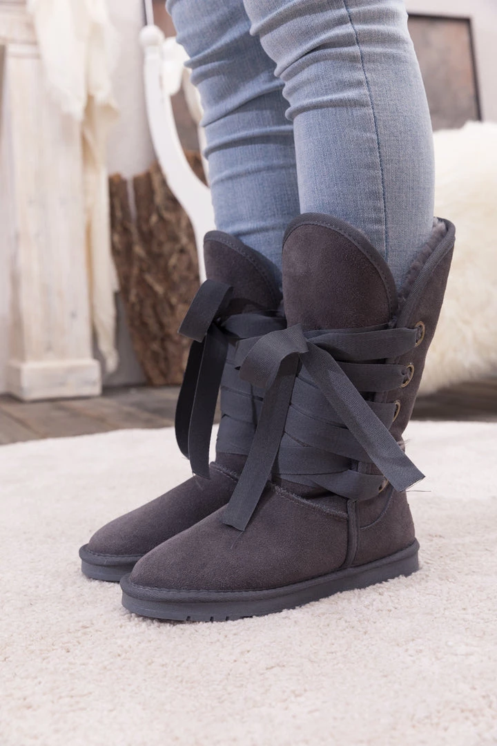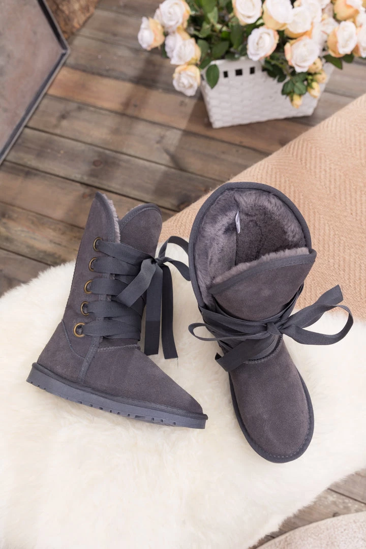Stay warm in chic, eye-catching style when you pull on these genuine suede boots featuring plush faux fur-lining and bold ribbon laces.
