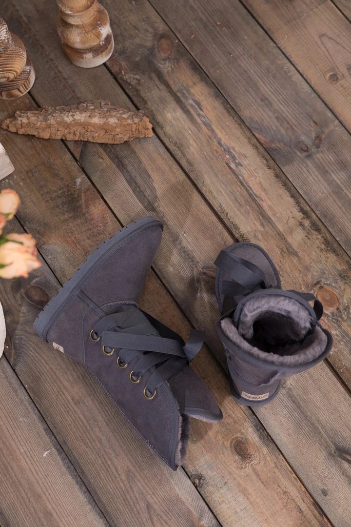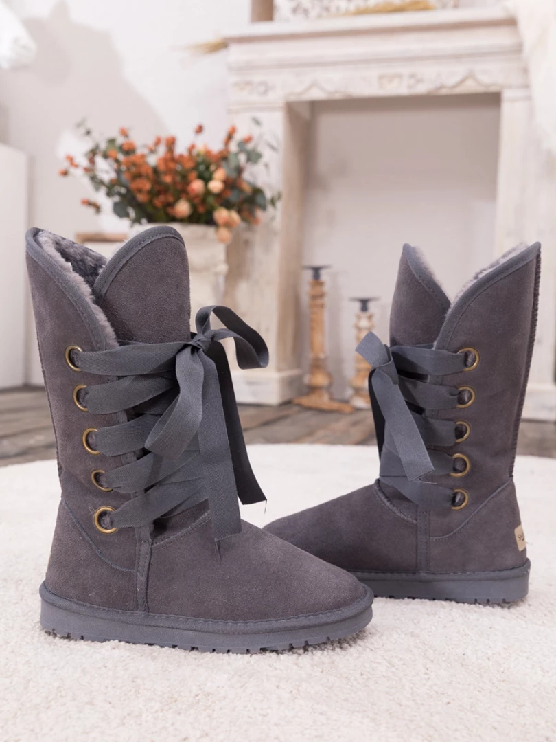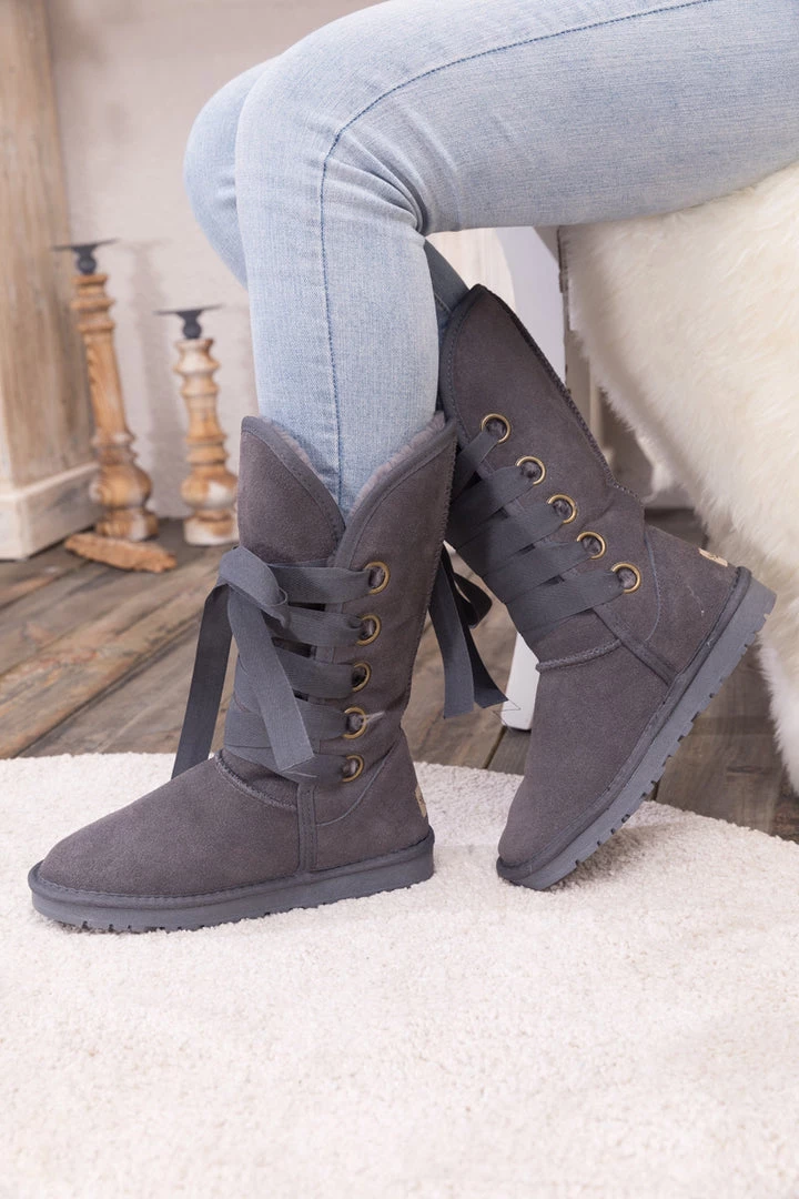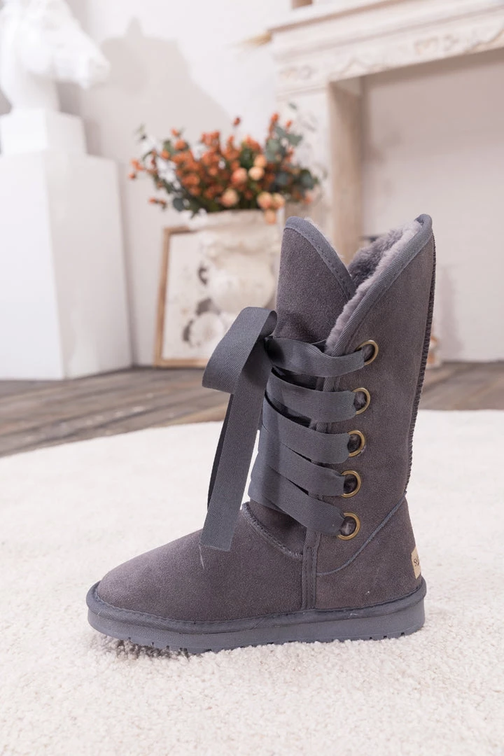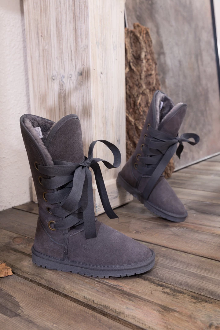 Stay warm in chic, eye-catching style when you pull on these genuine suede boots featuring plush faux fur-lining and bold ribbon laces.