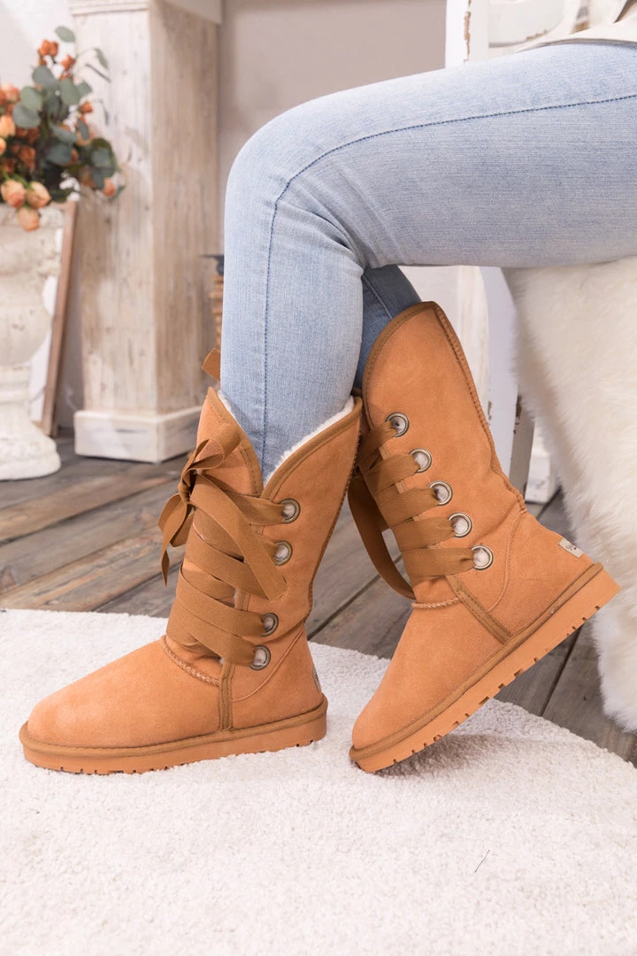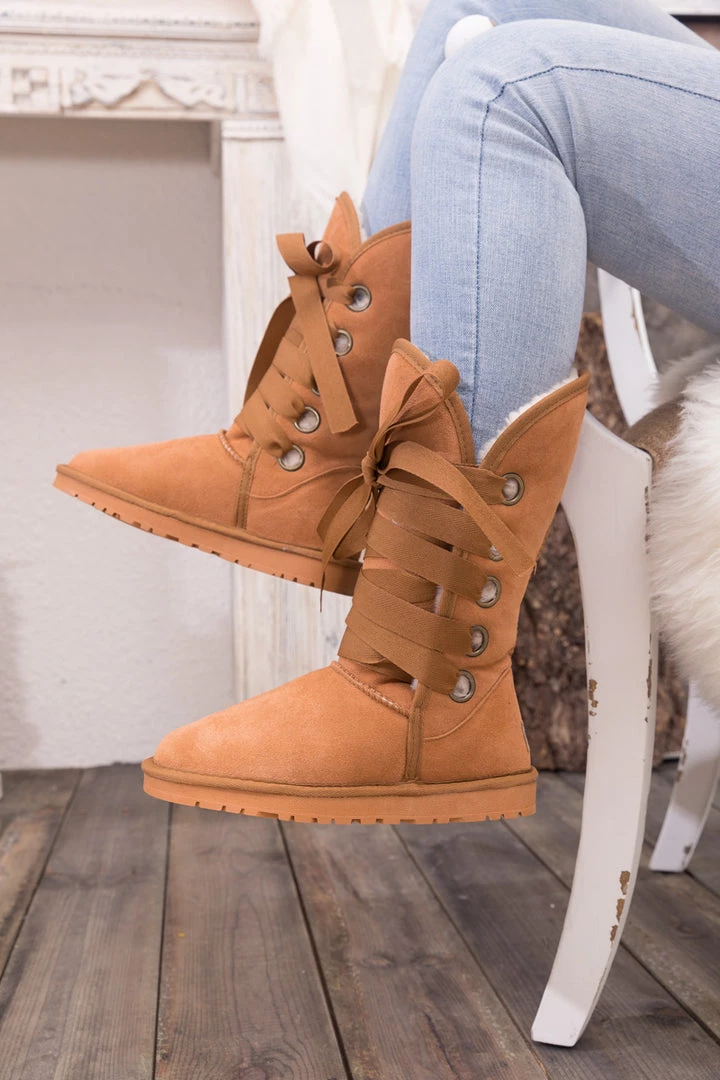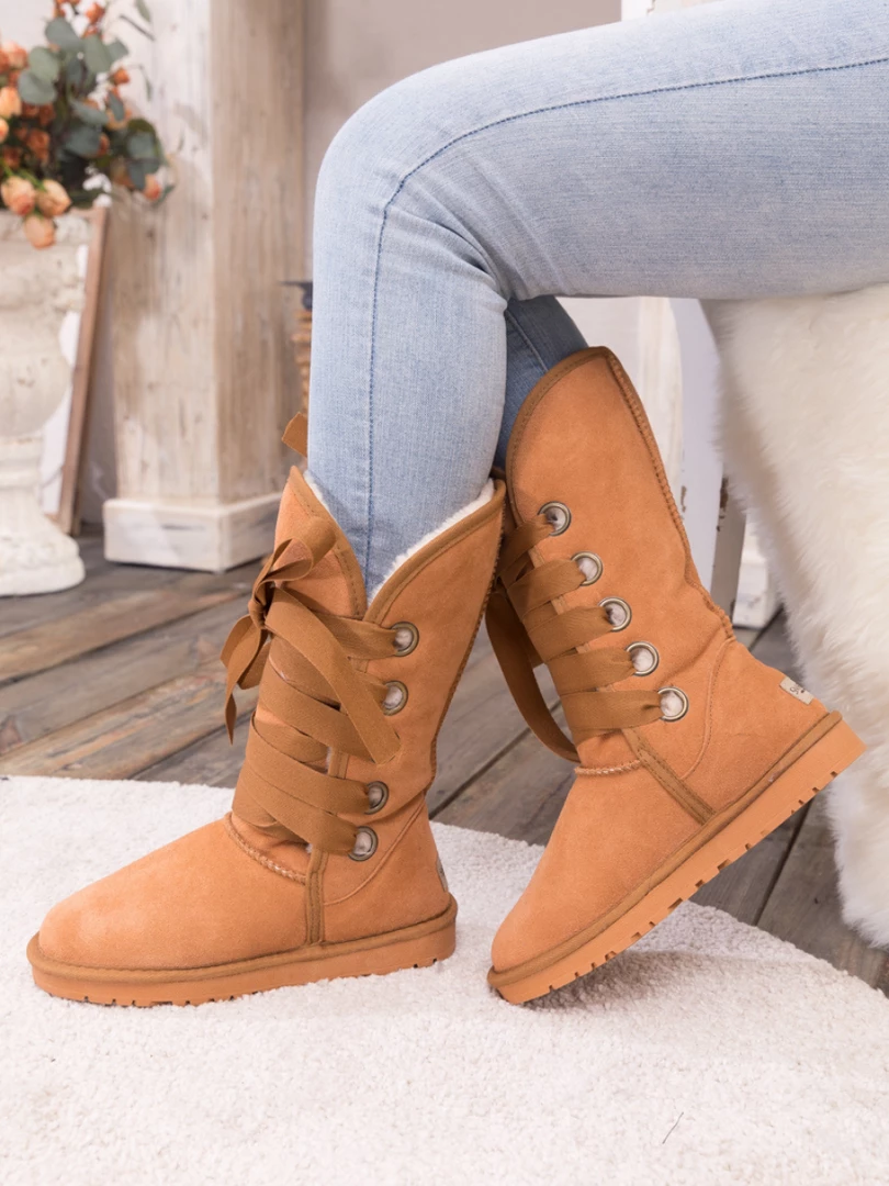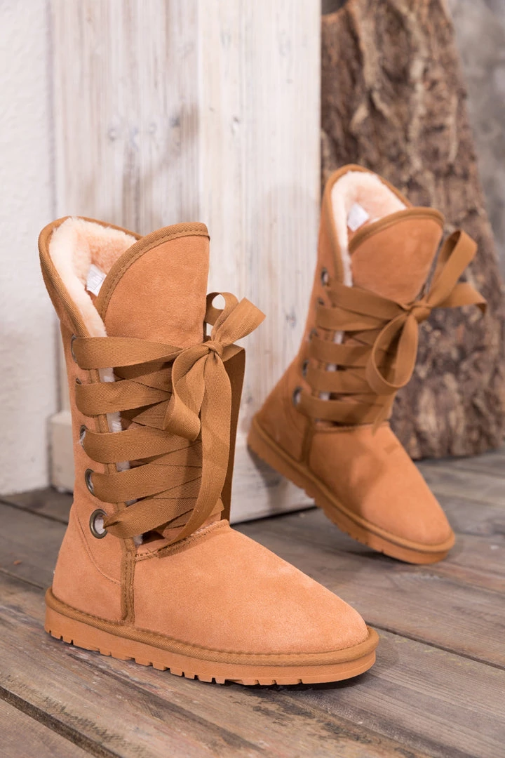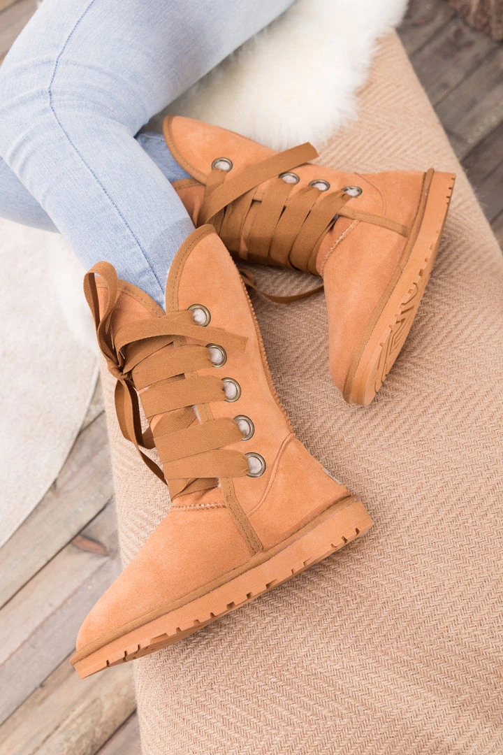 Stay warm in chic, eye-catching style when you pull on these genuine suede boots featuring plush faux fur-lining and bold ribbon laces.