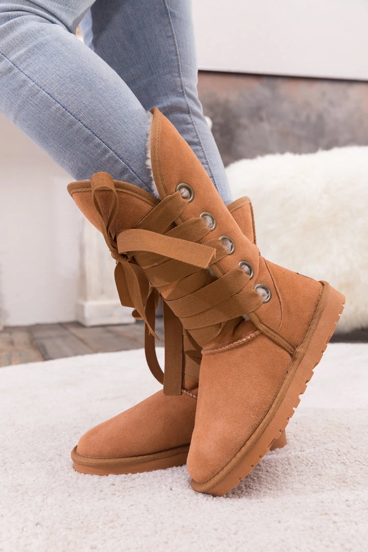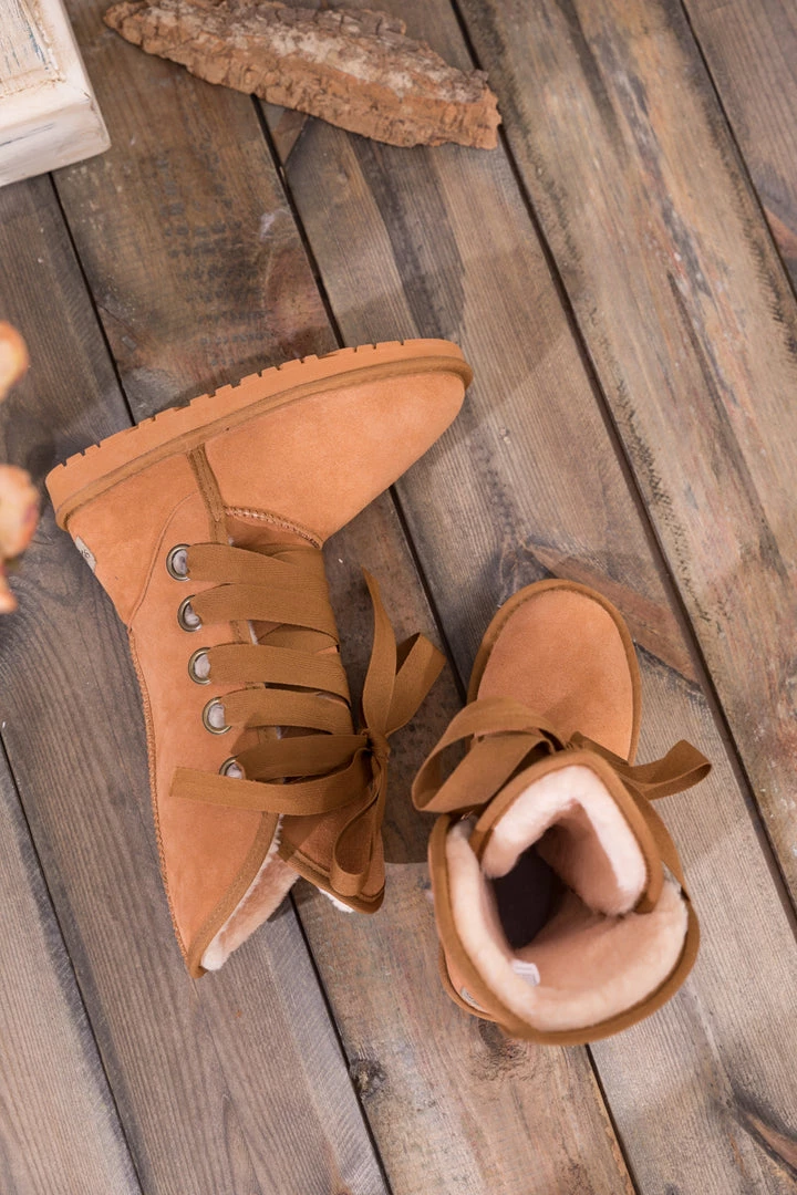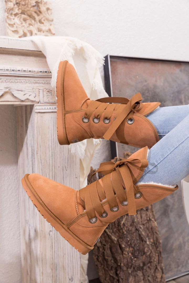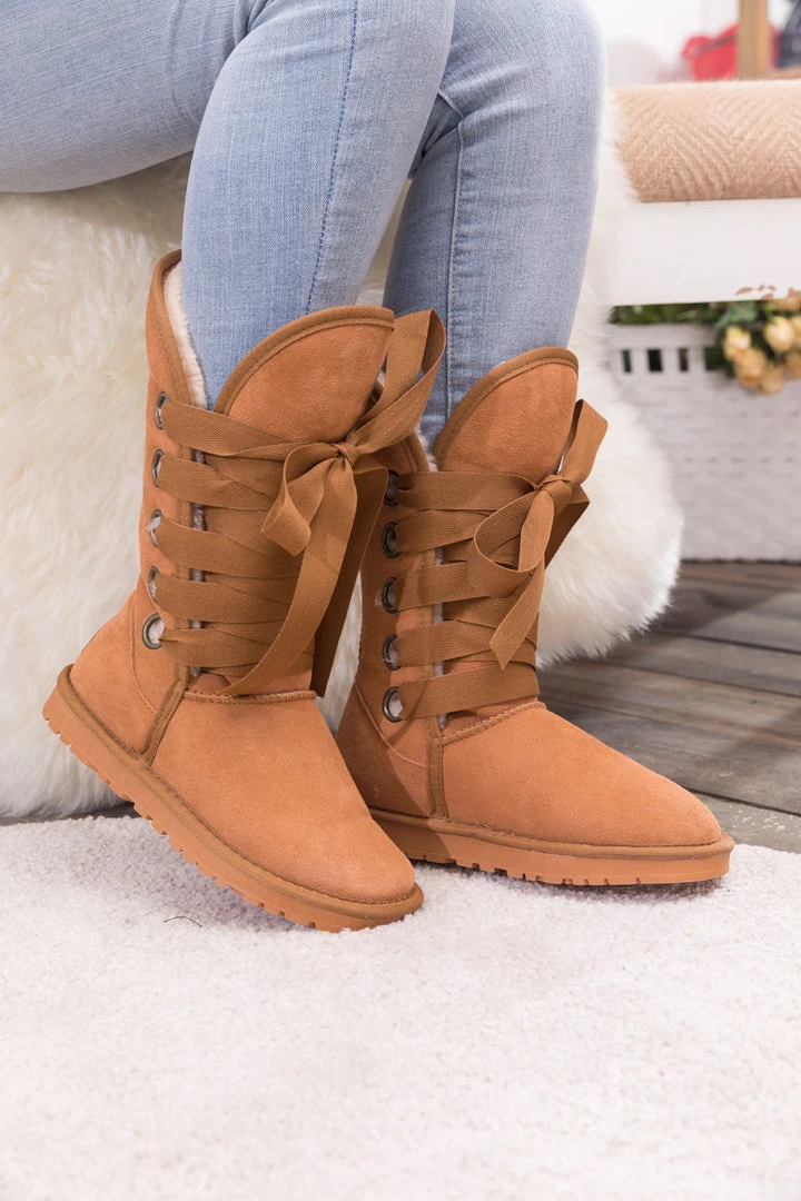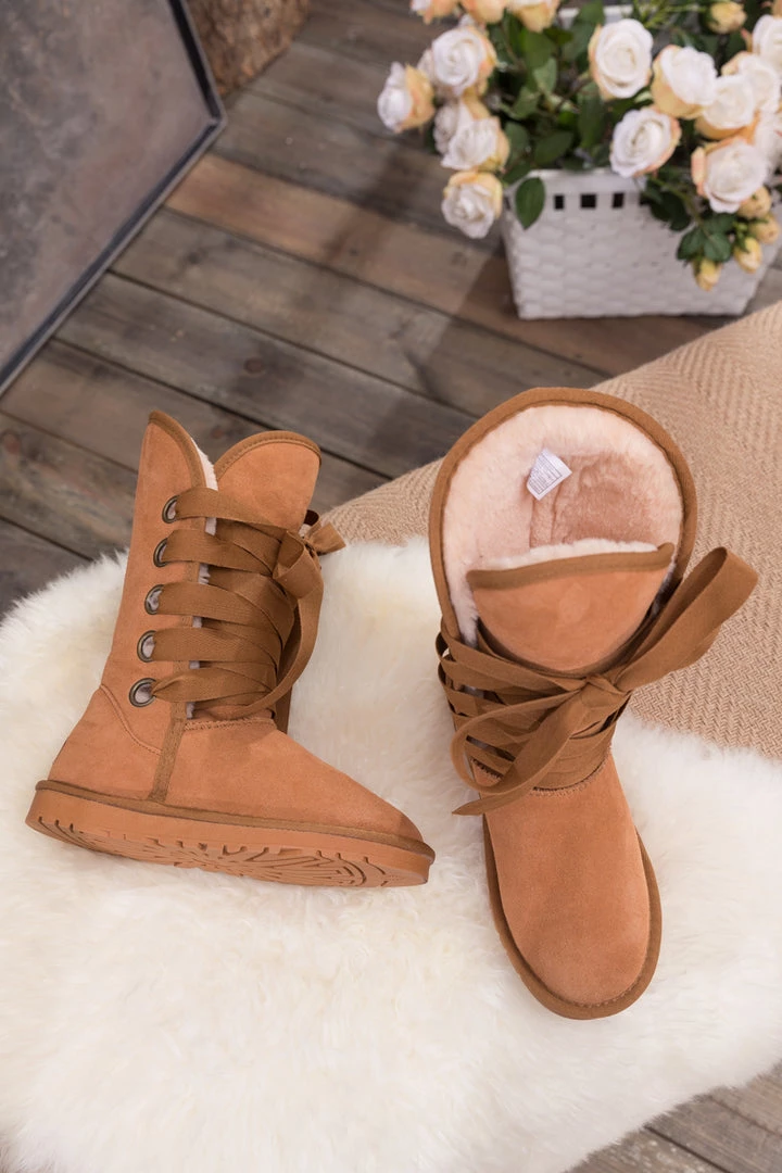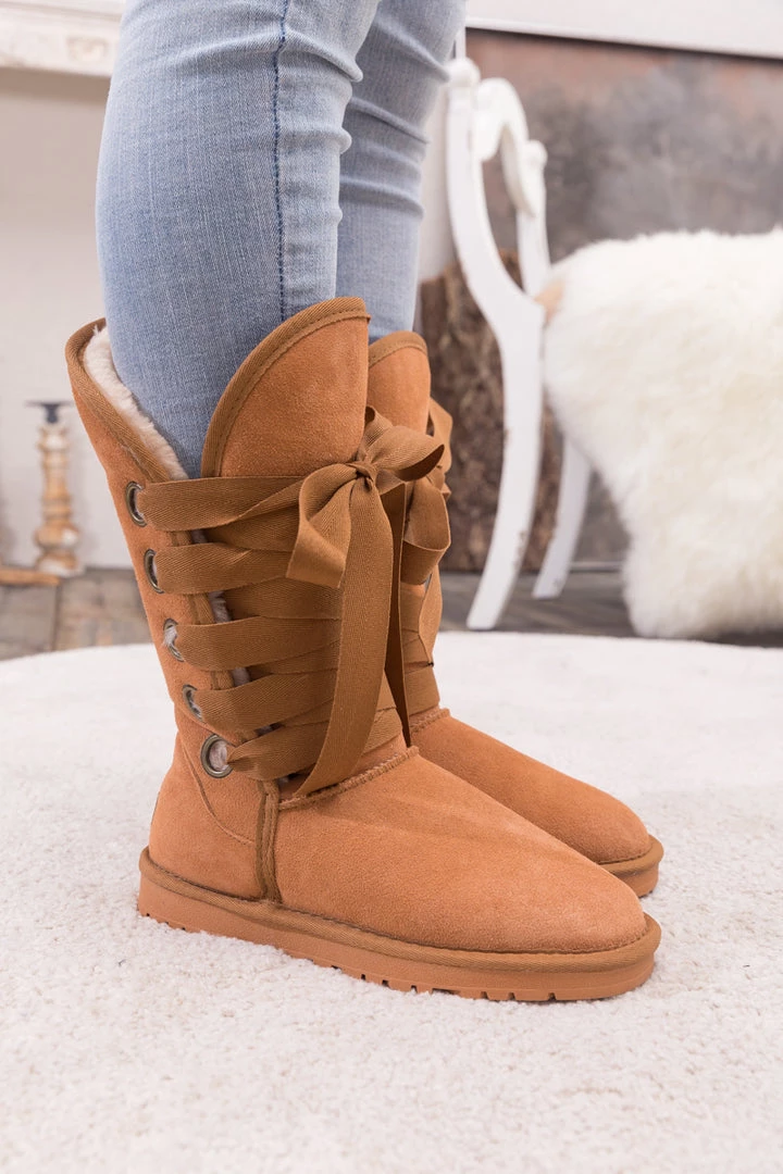 Stay warm in chic, eye-catching style when you pull on these genuine suede boots featuring plush faux fur-lining and bold ribbon laces.