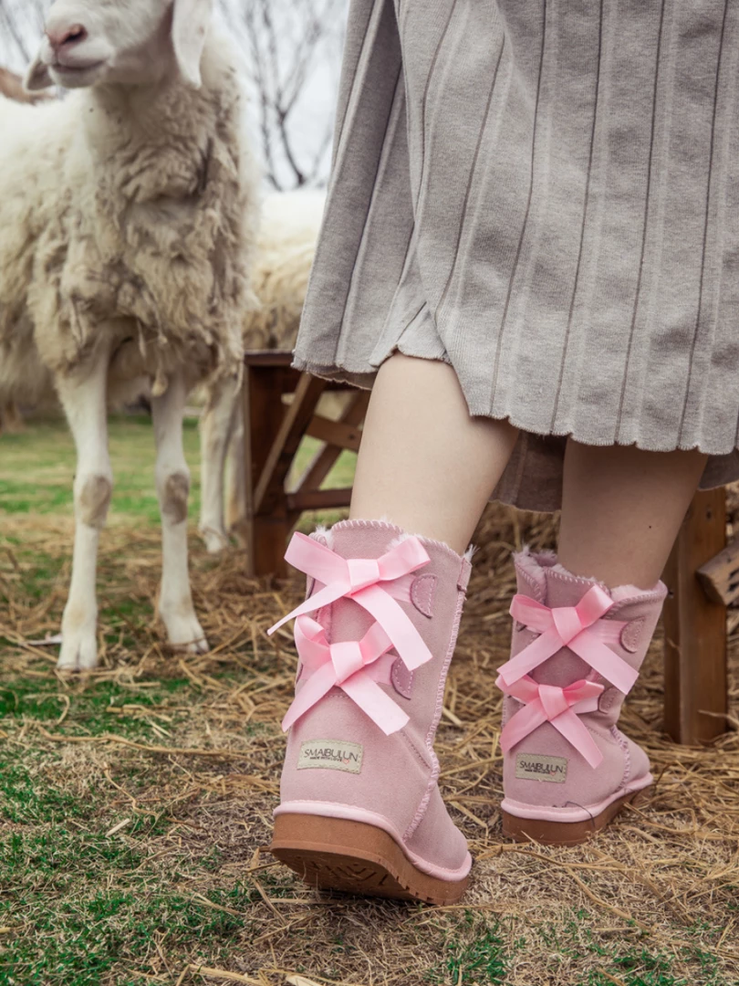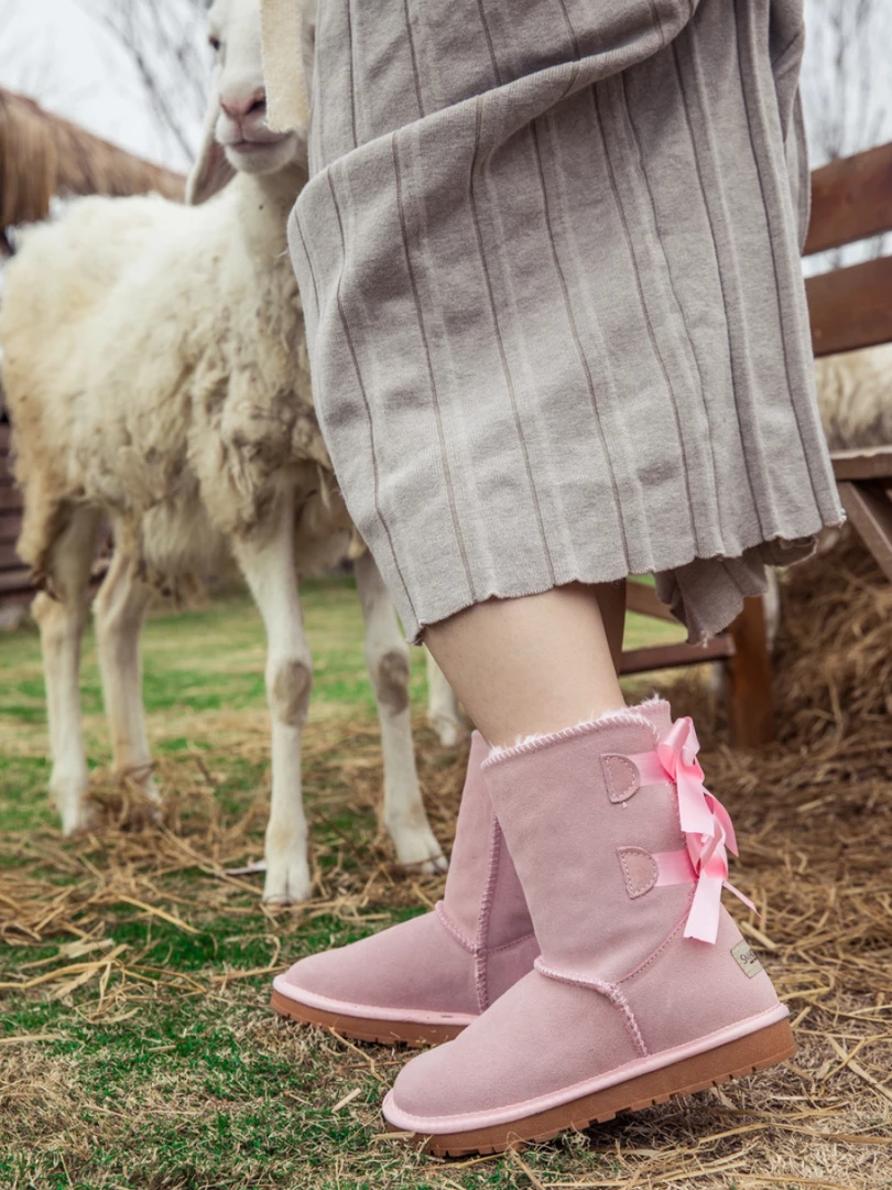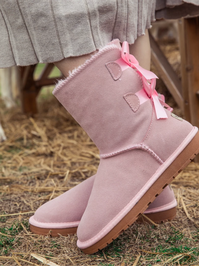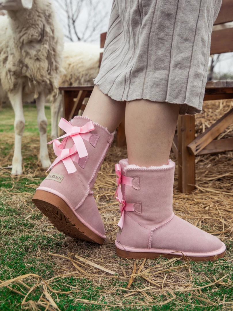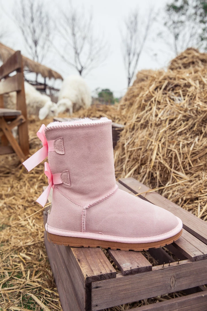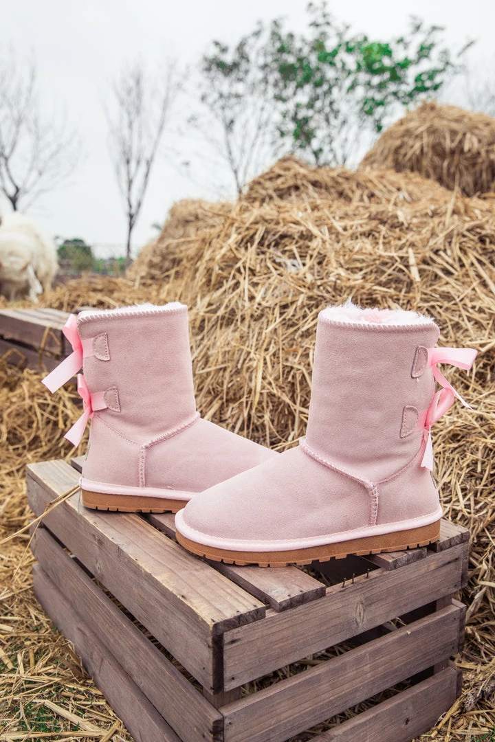 A bold double-bow detail in back puts a fun feminine twist on the classic shearling style in these genuine leather boots. A plush faux fur lining cushions your feet in supreme softness and warmth.