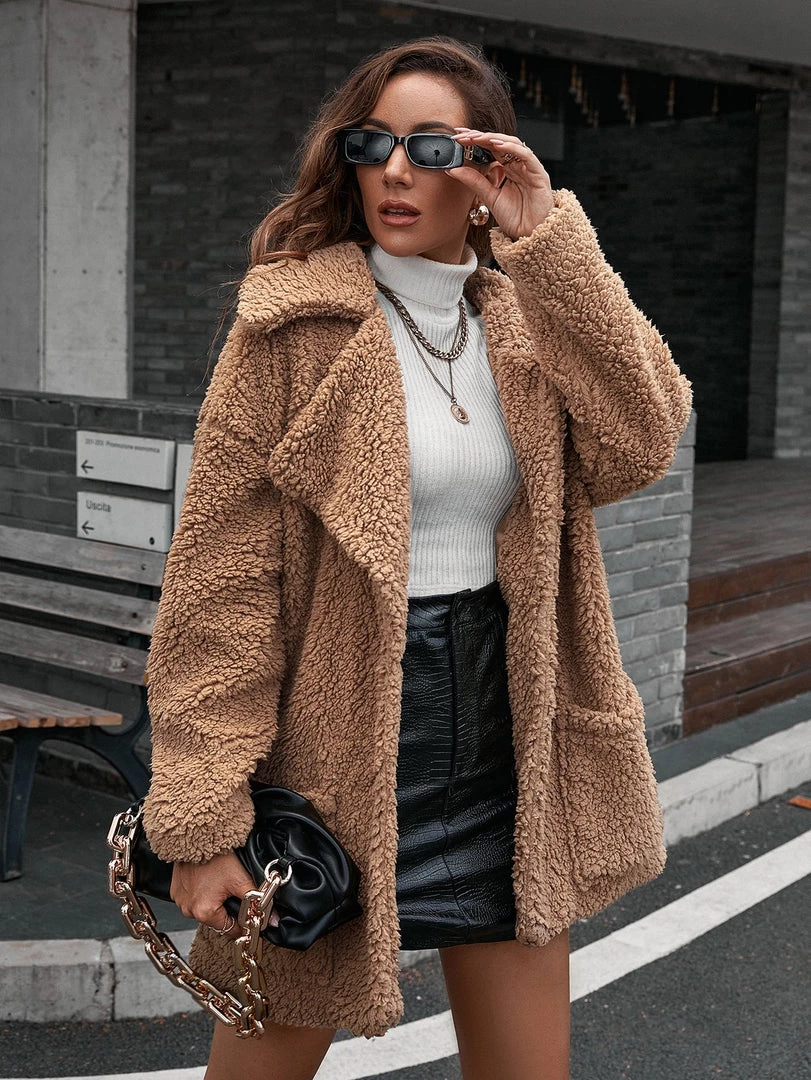 Both trendy and comfy, this teddy coat boasts an over-sized lapel collar and two roomy pockets.