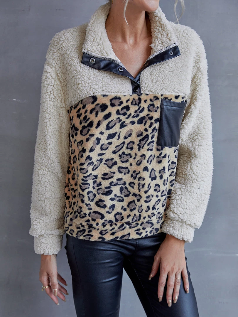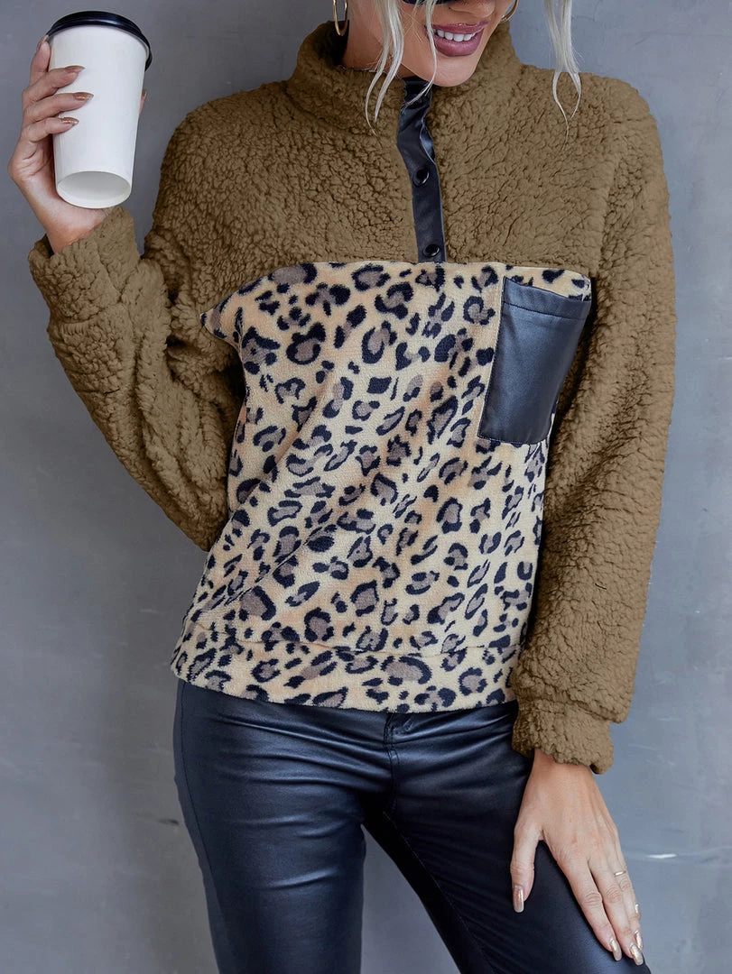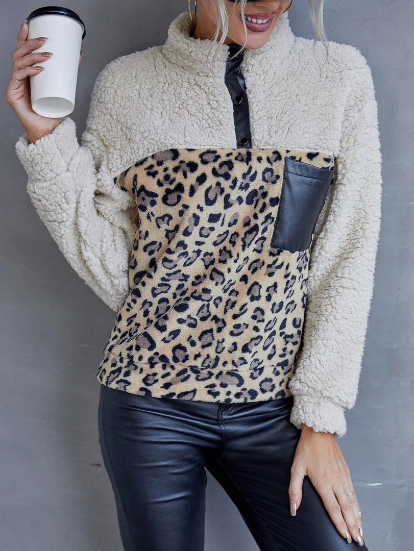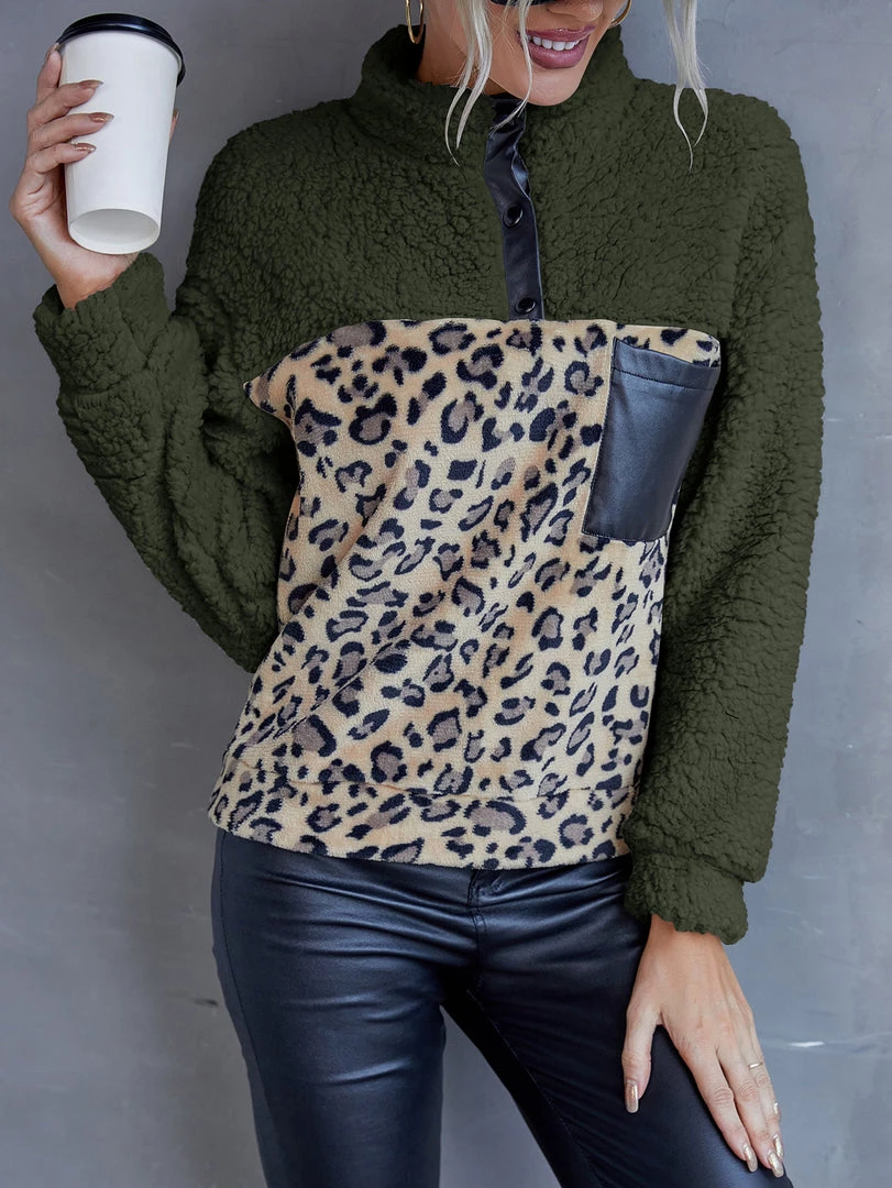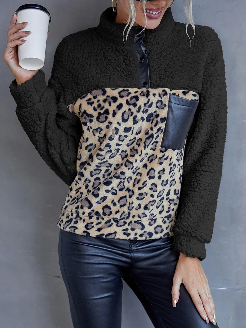 Flaunt a fun, bold look with this fuzzy pullover showcasing a contrasting leopard design and button-pocket accent.