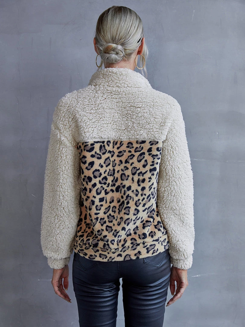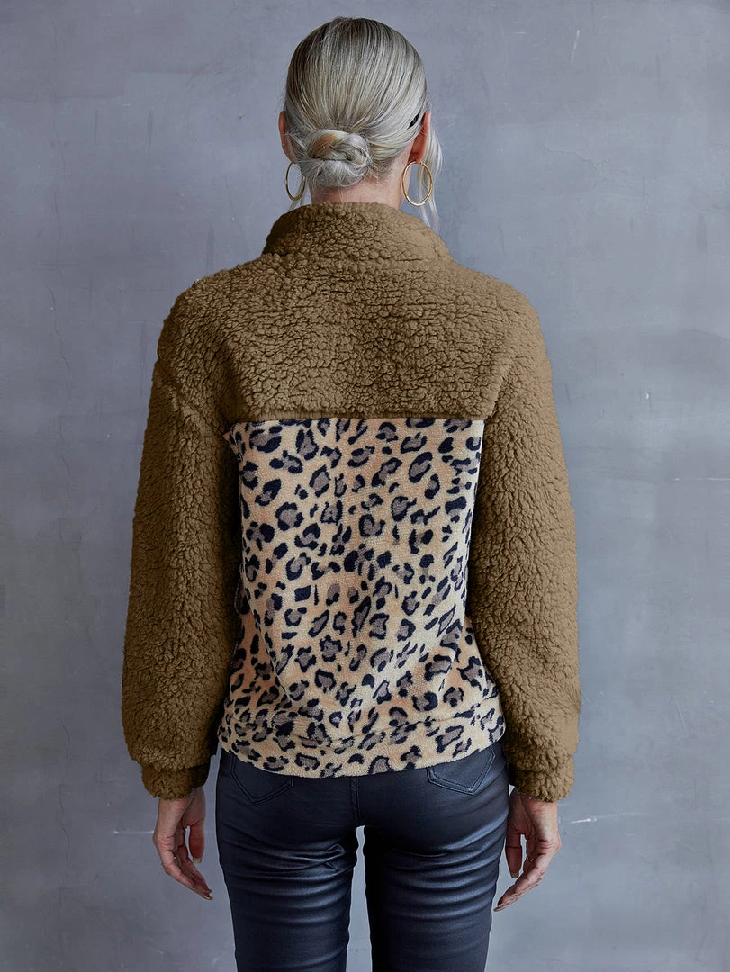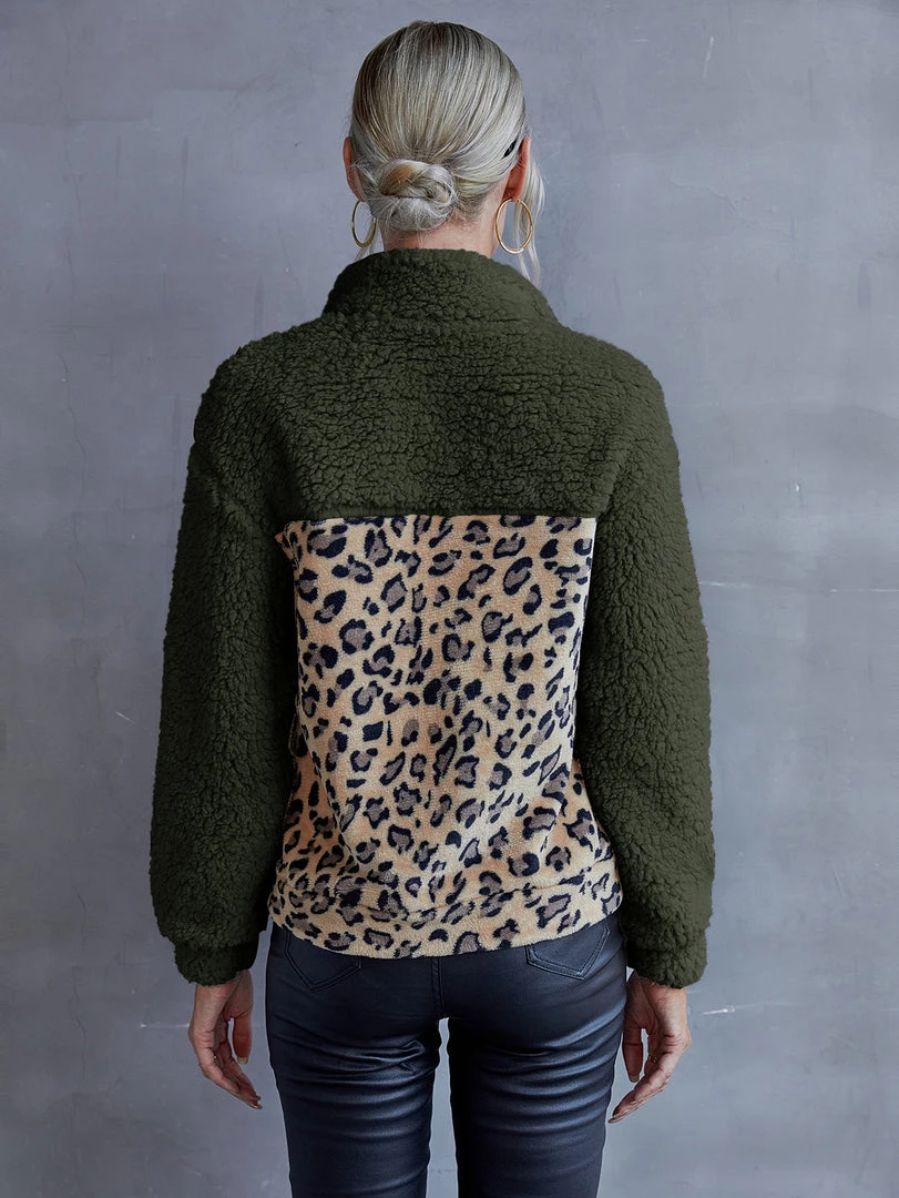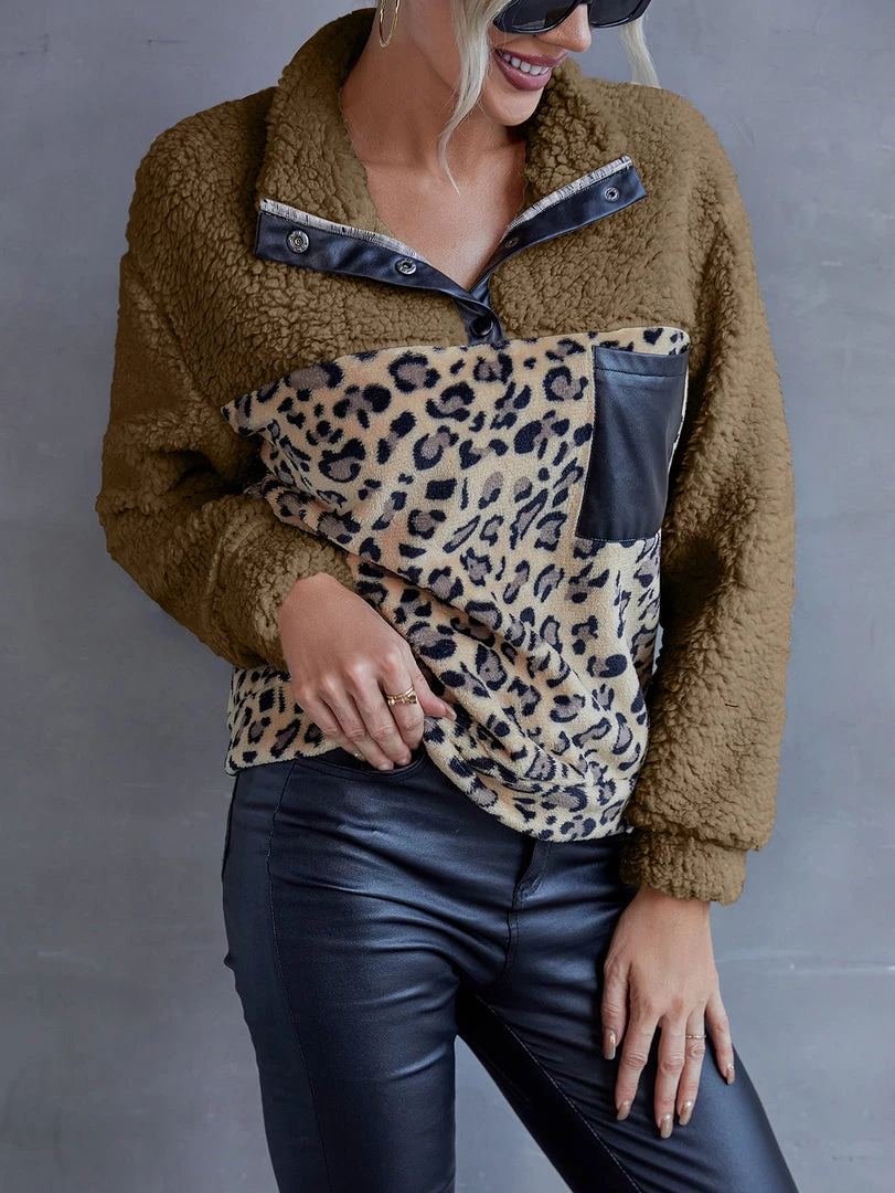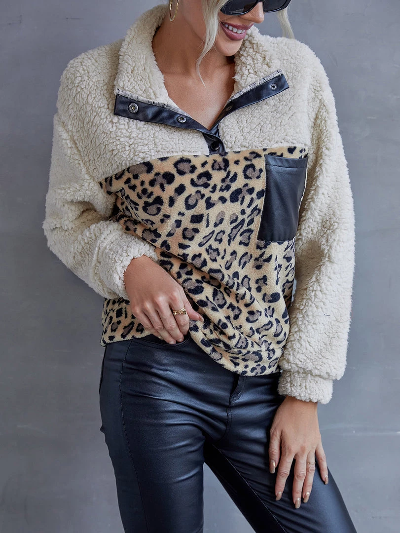 Flaunt a fun, bold look with this fuzzy pullover showcasing a contrasting leopard design and button-pocket accent.