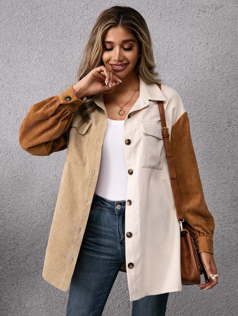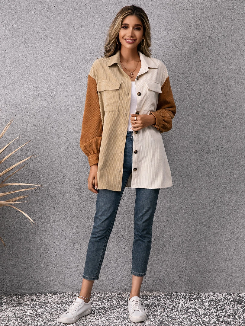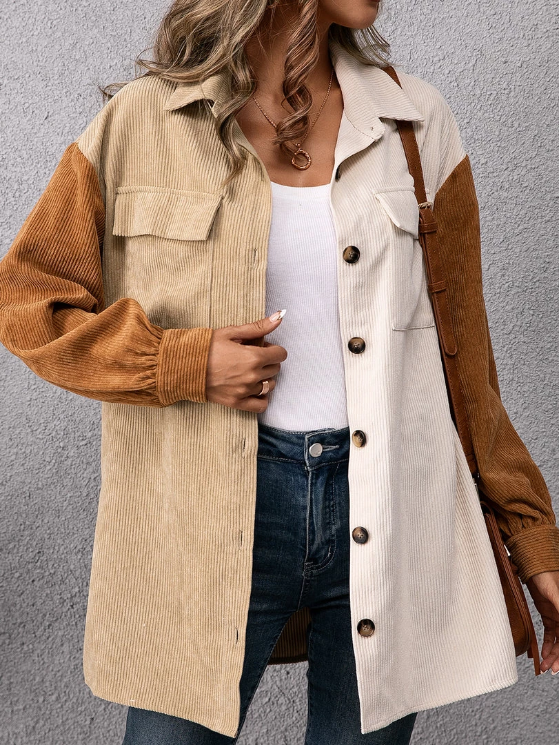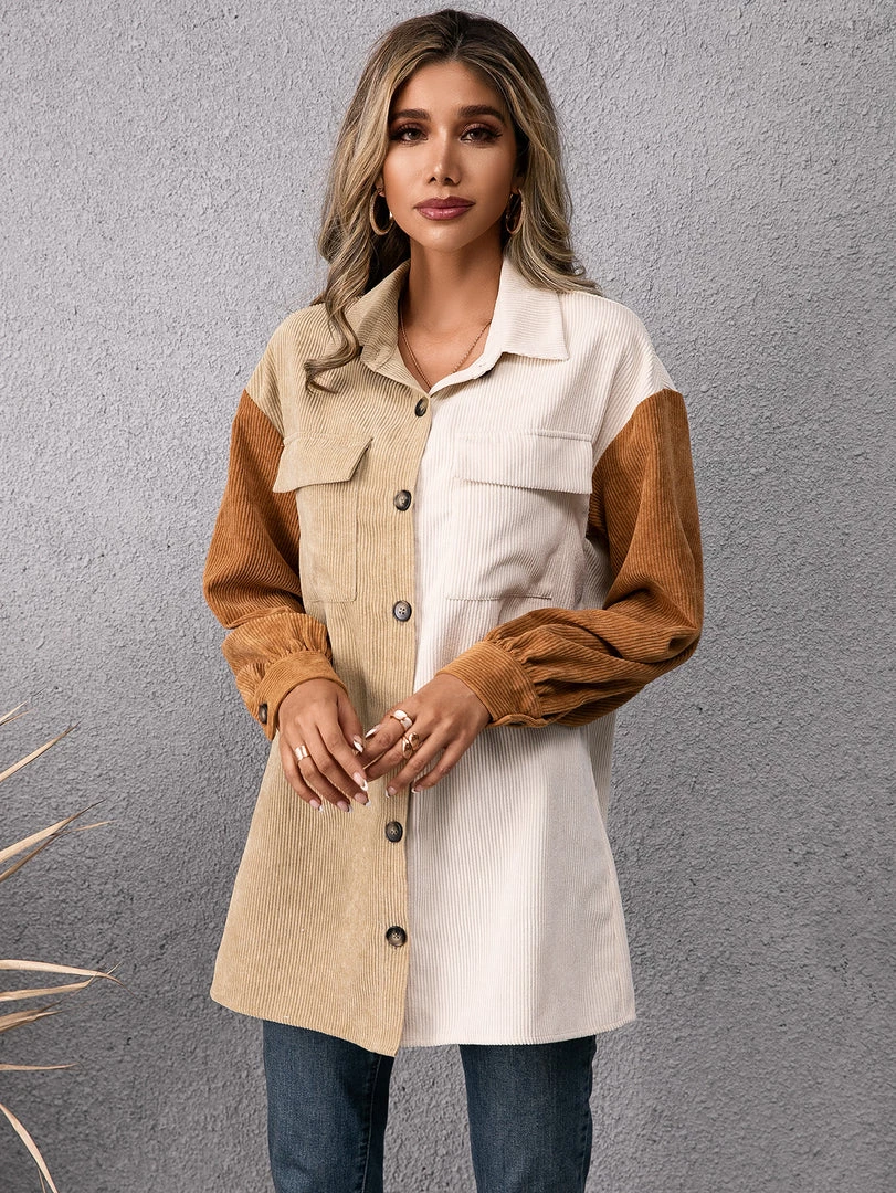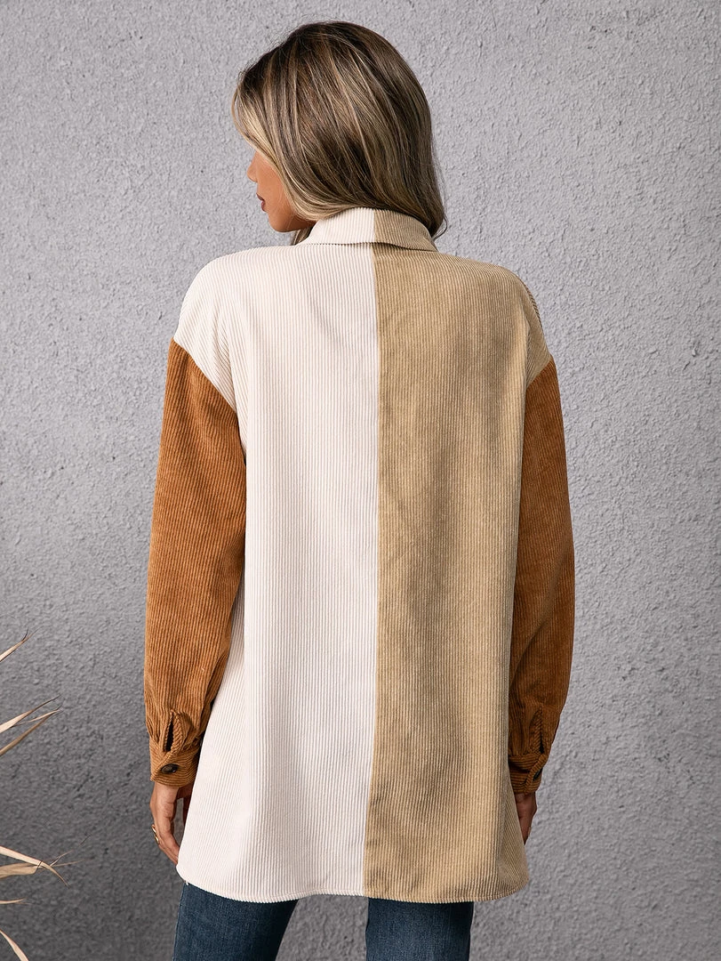 Refresh your wardrobe with this corduroy button-up that features bold color blocking and oversize chest pockets.