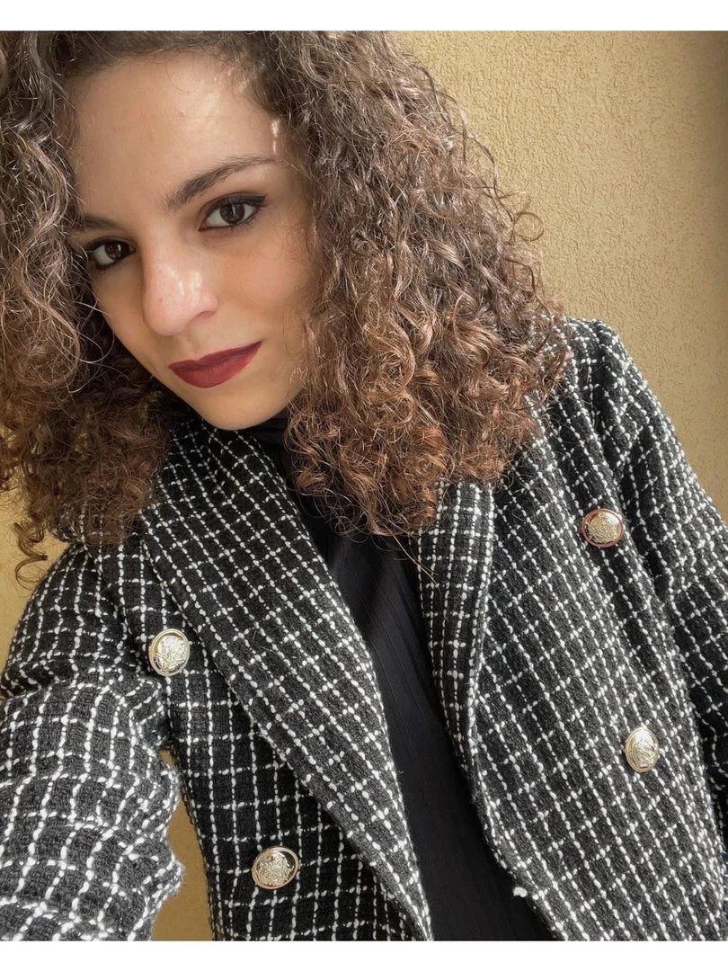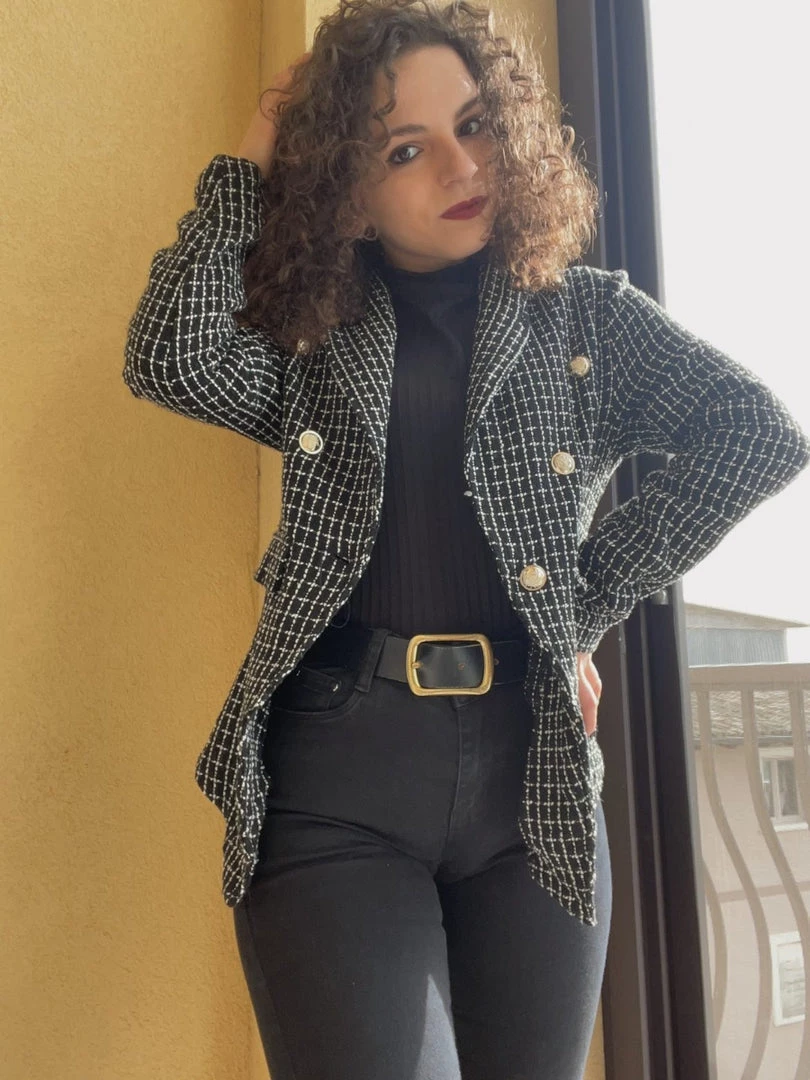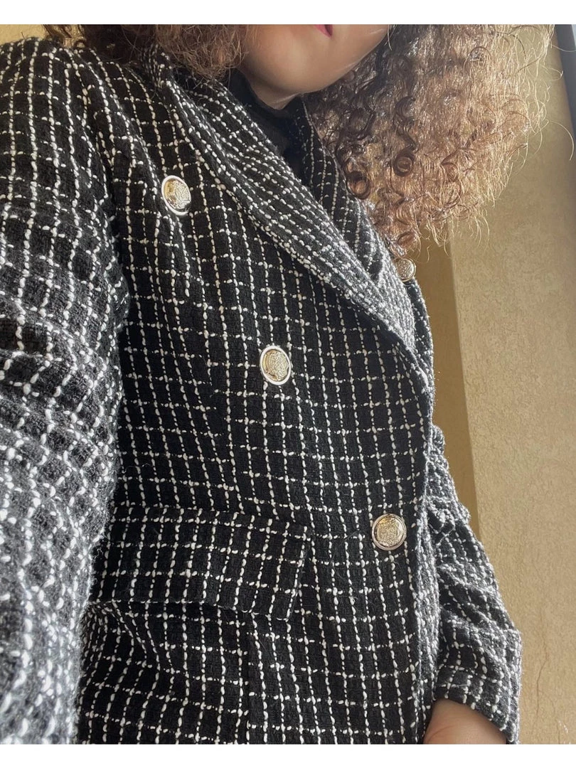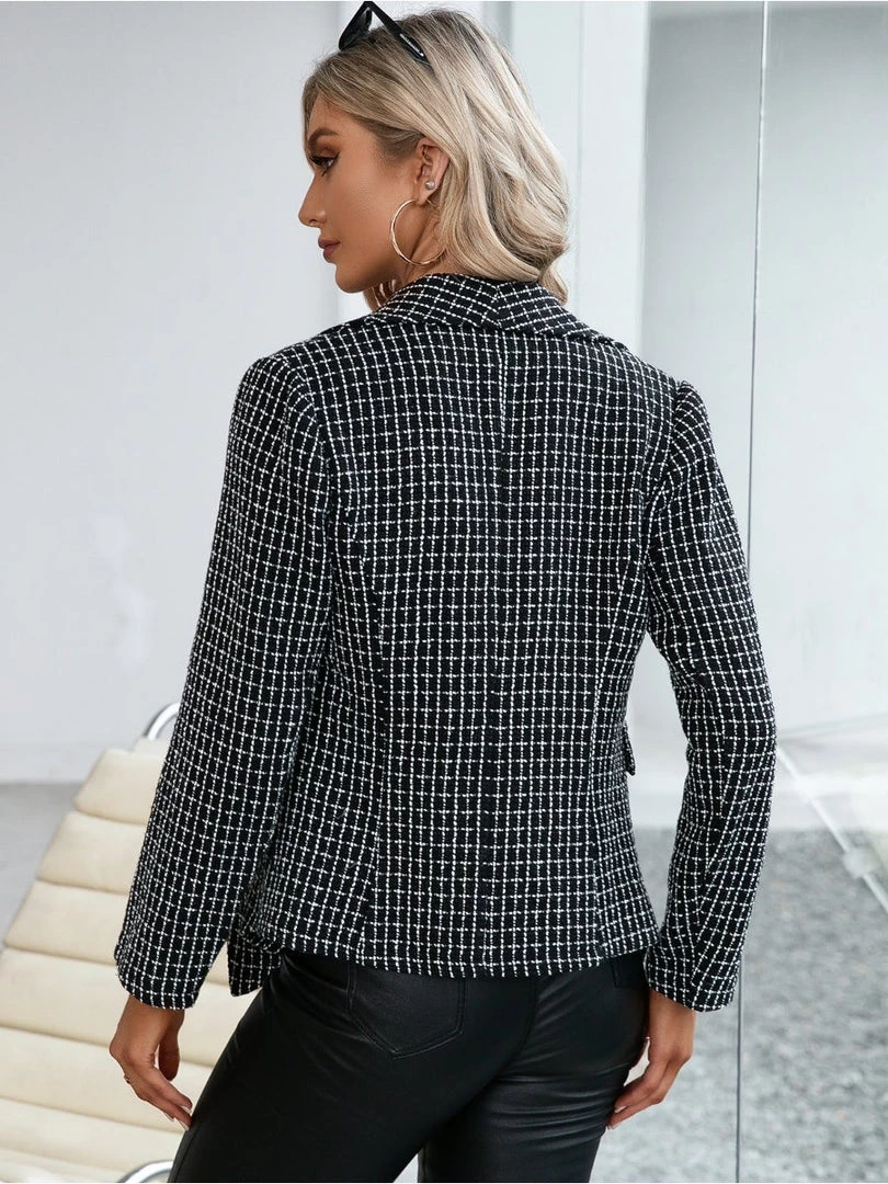 Our swallow blazer brings outfit versatility into your layering essentials with its plaid hue while bold button details welcome posh charm to your ensemble.