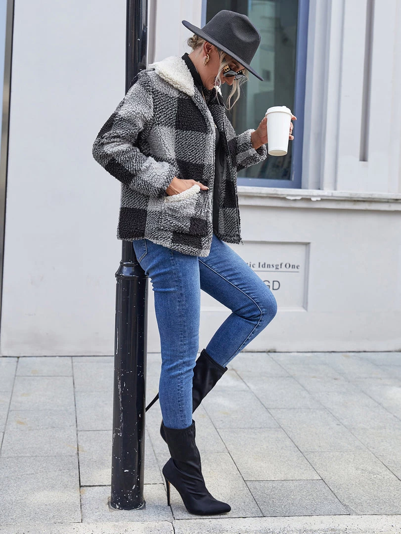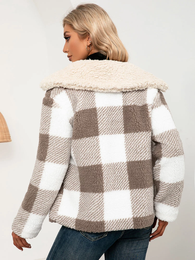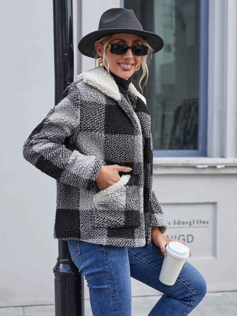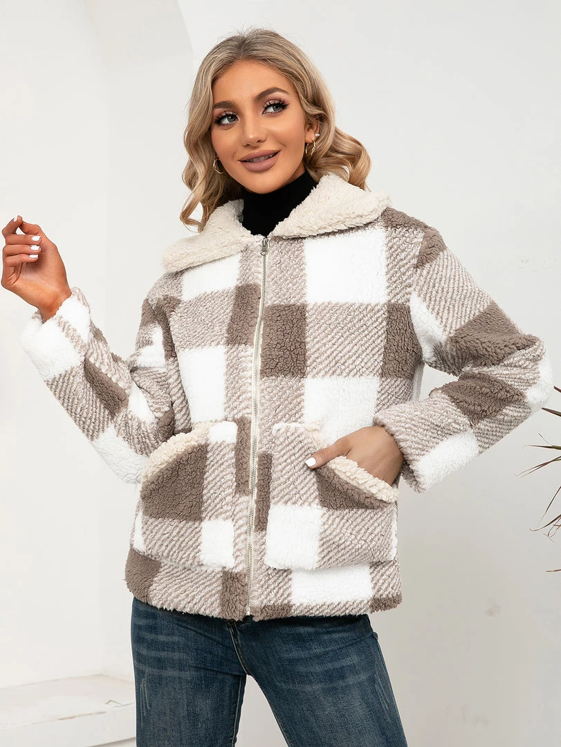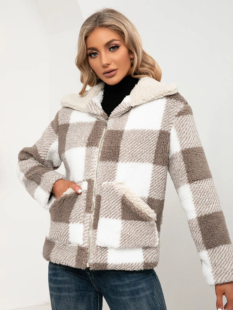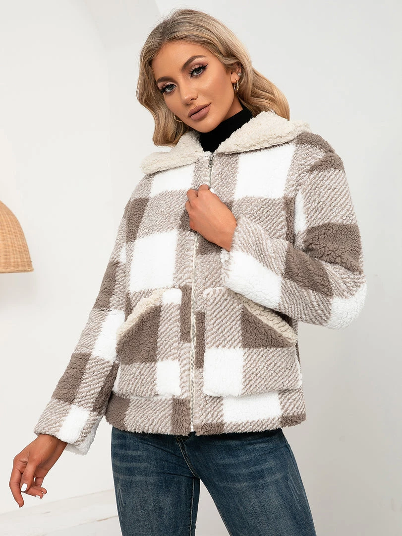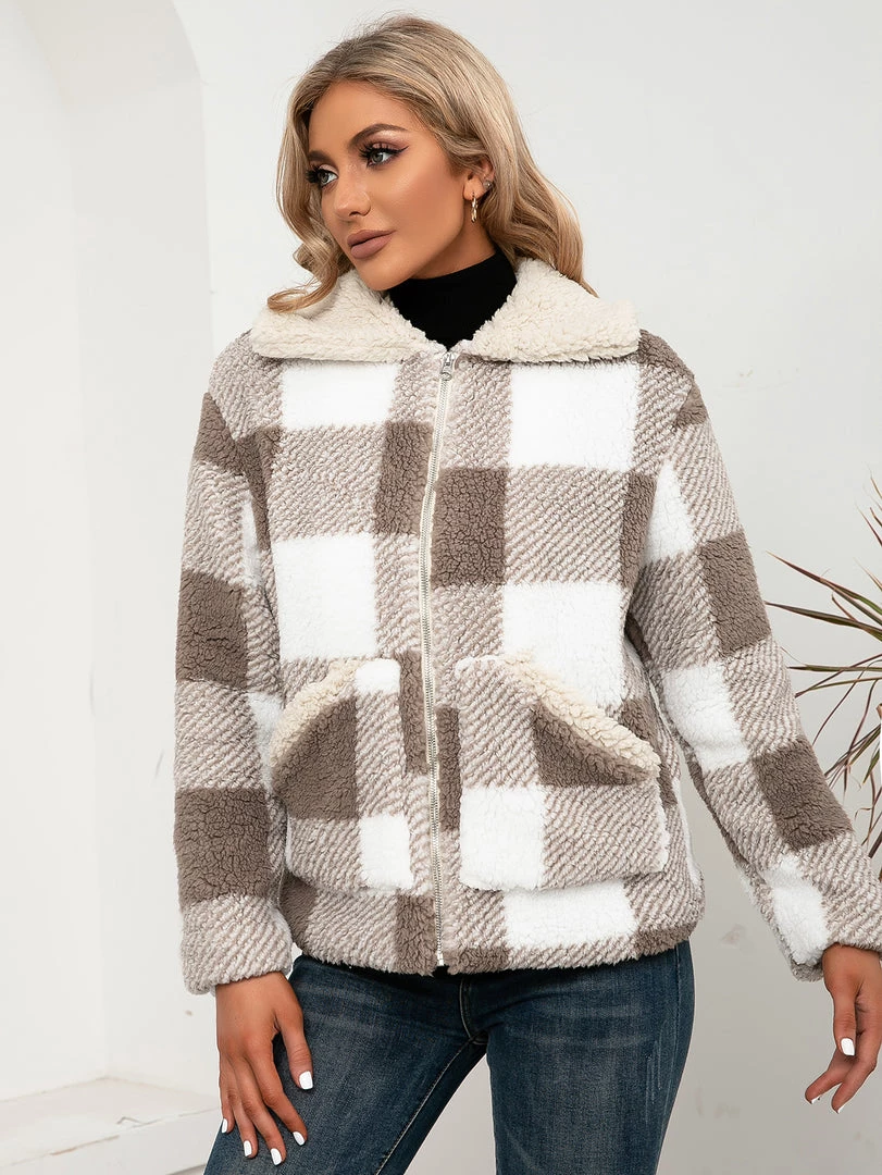 Brace against the elements in this warm zip-up coat boasting a plush texture and a soft woven plaid pattern.
