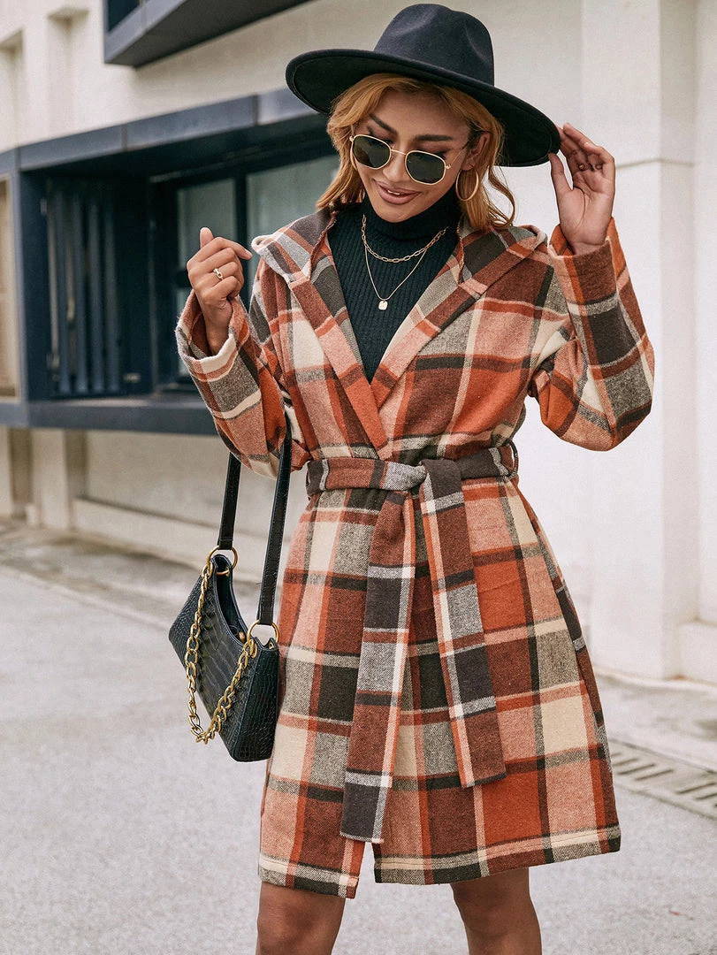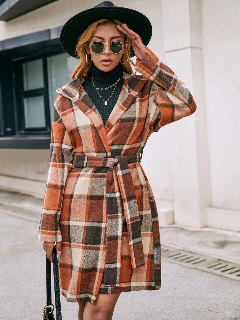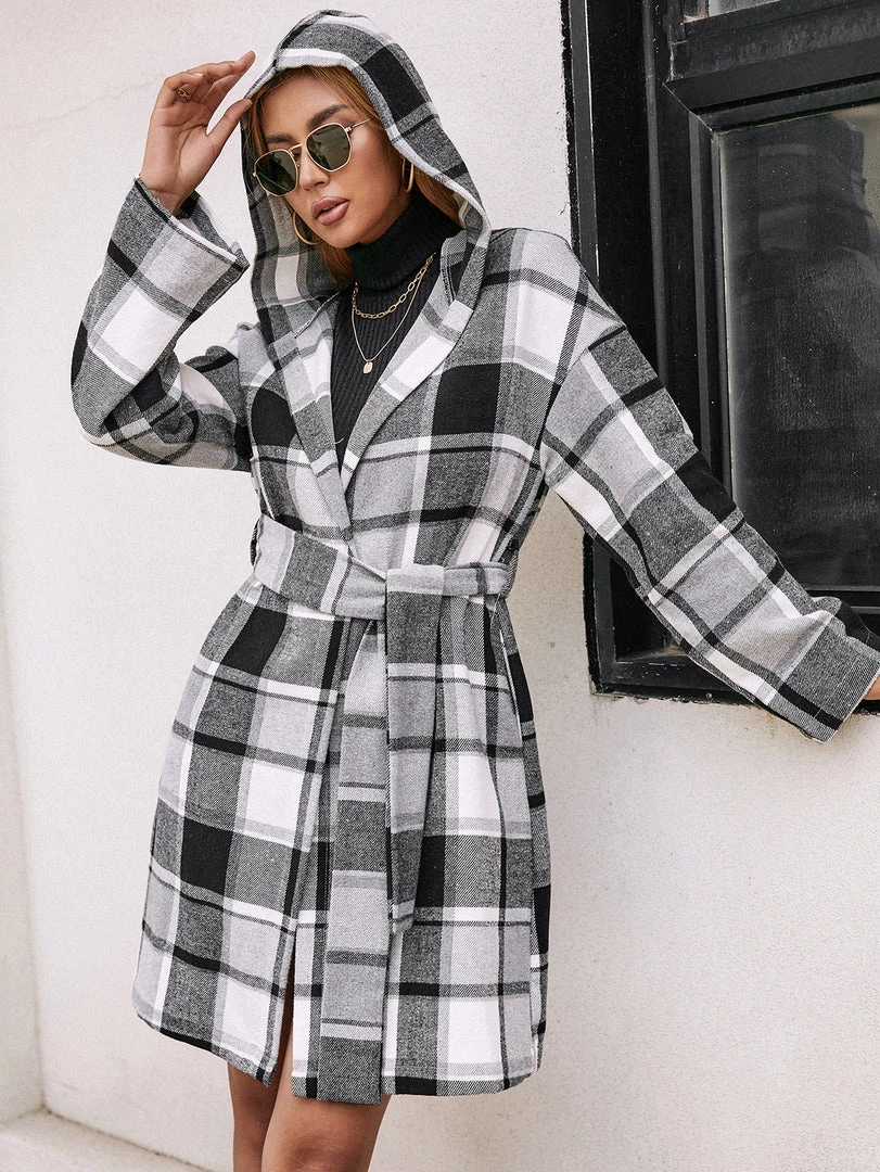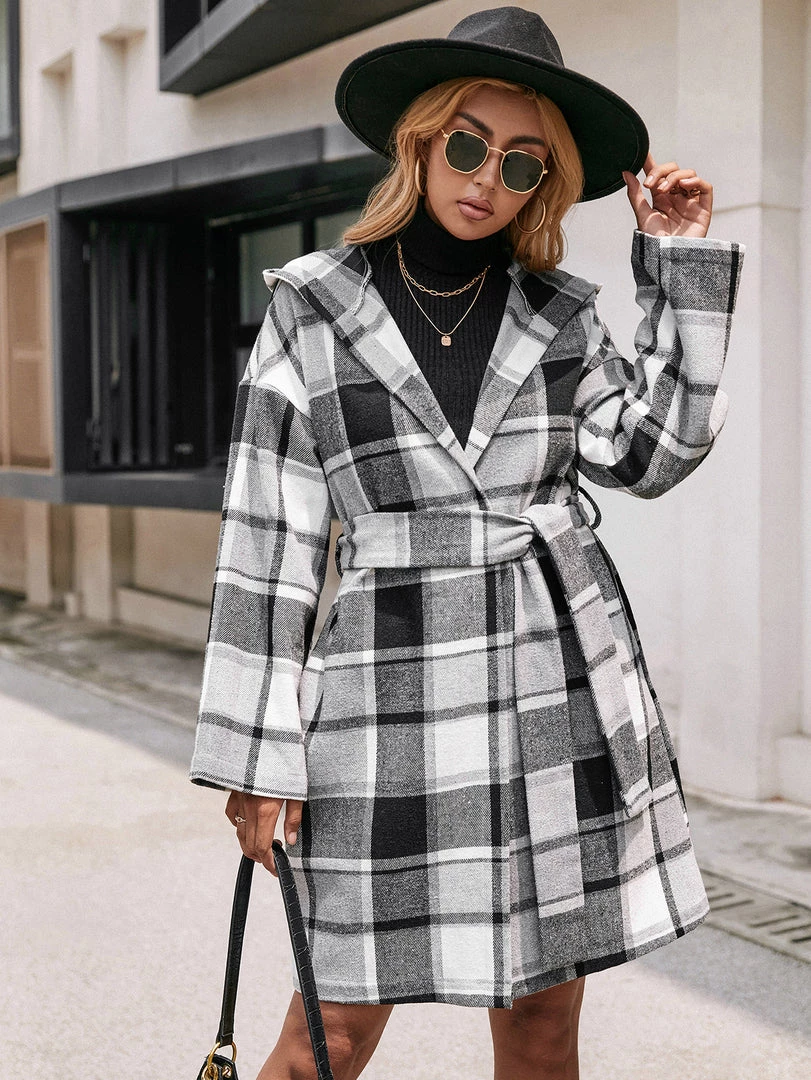 A bold plaid print updates this classic trench coat with eye-catching appeal.