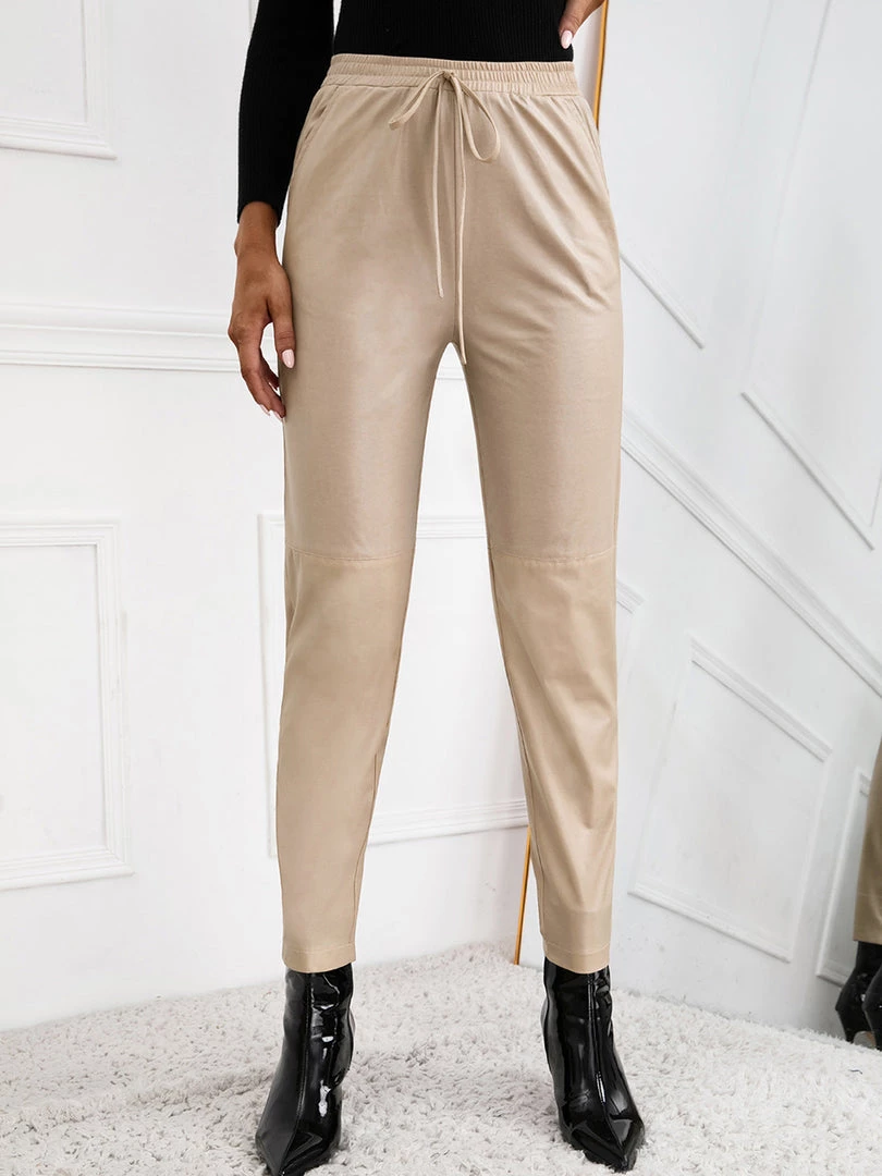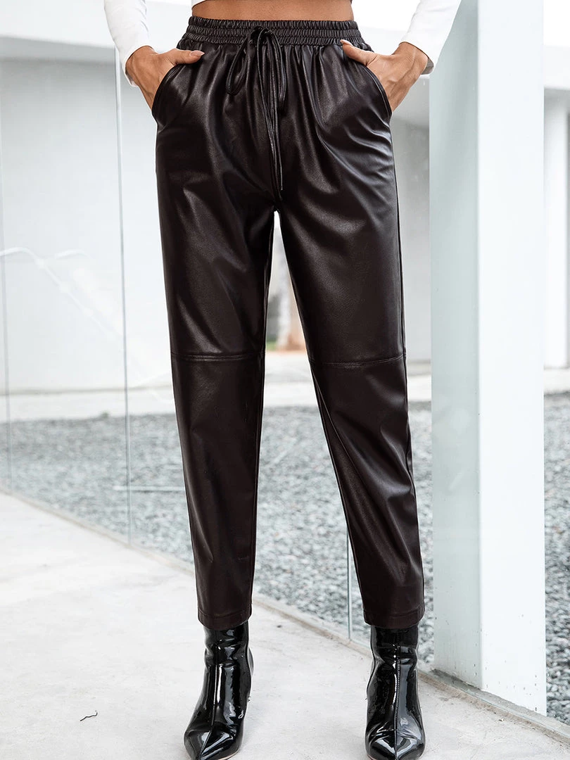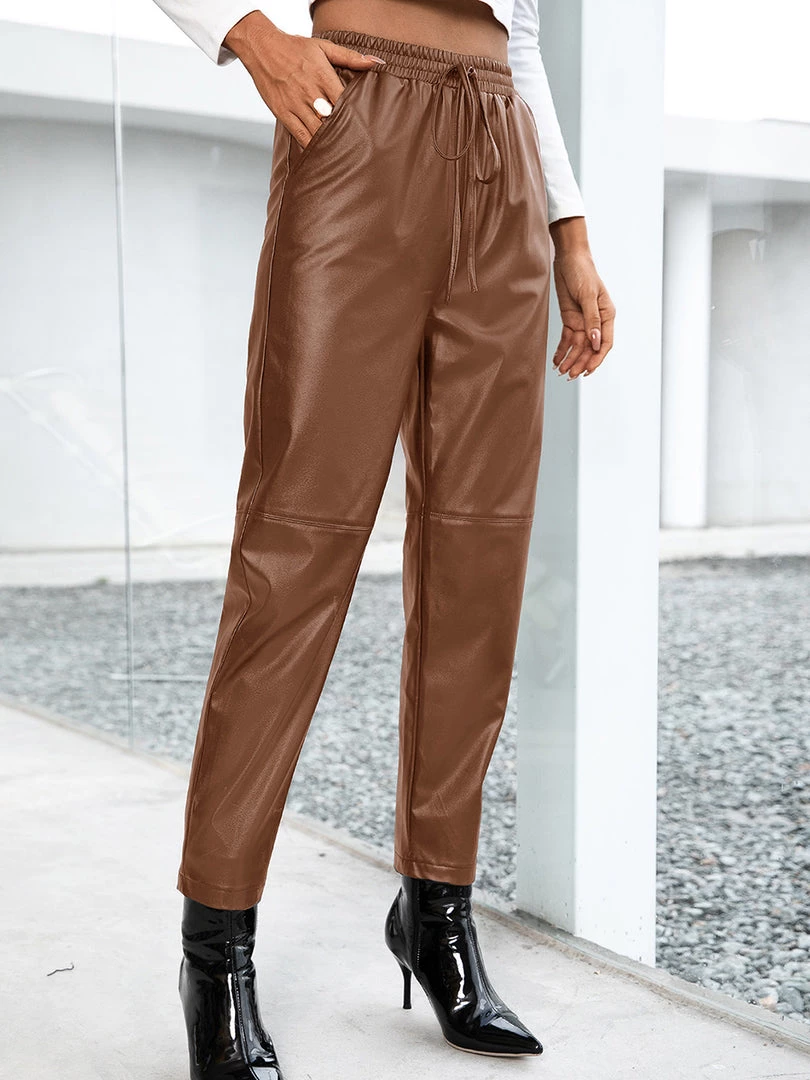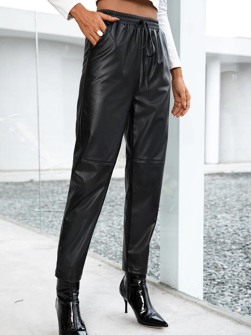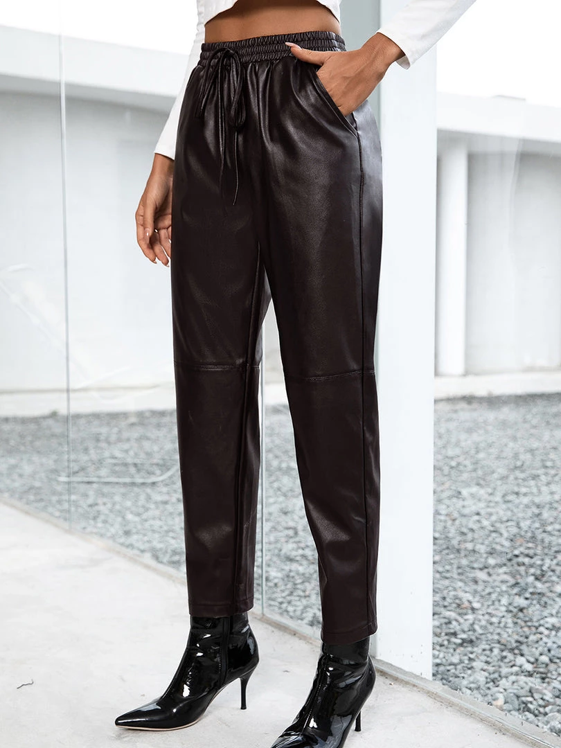 Design your contemporary ensembles with the on-trend touch of these faux-leather pants featuring subtle side pockets and an adjustable high-rise waistline for comfortable, statement-making style.