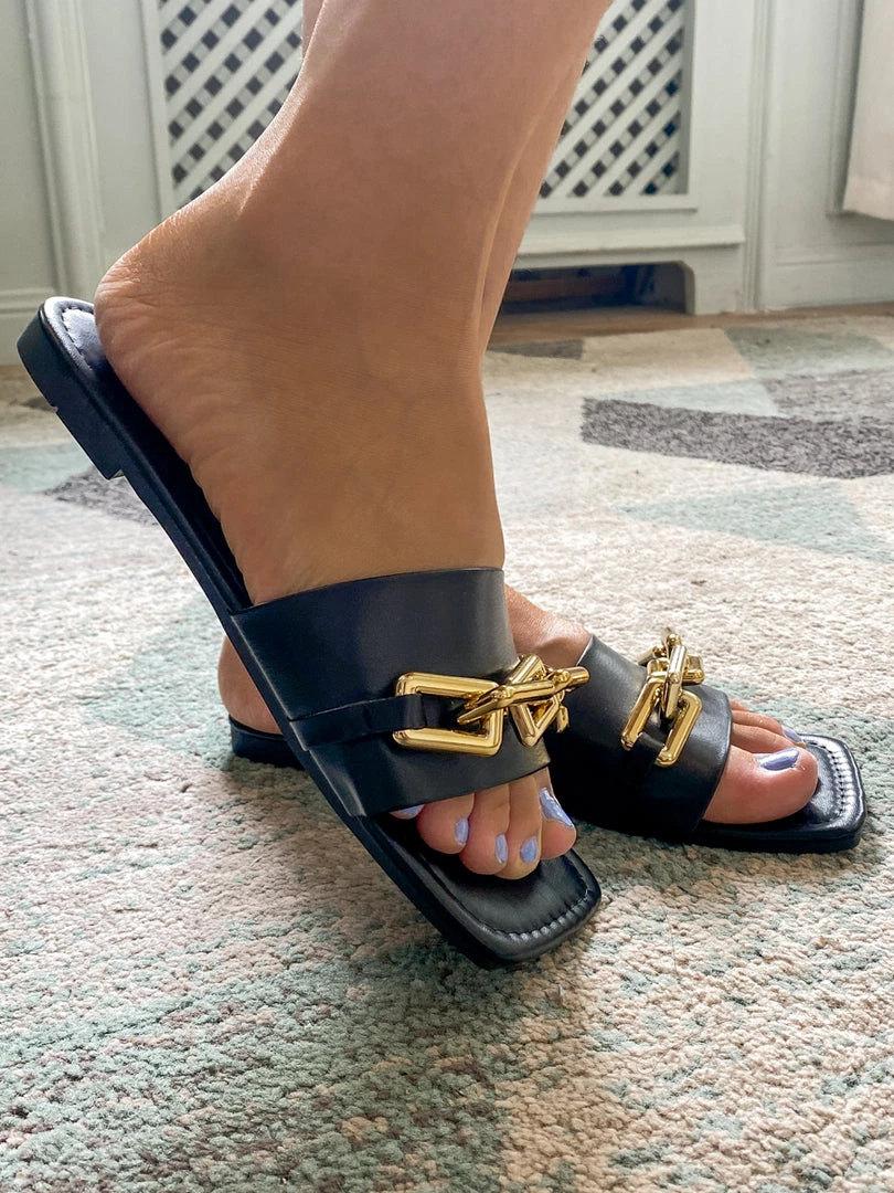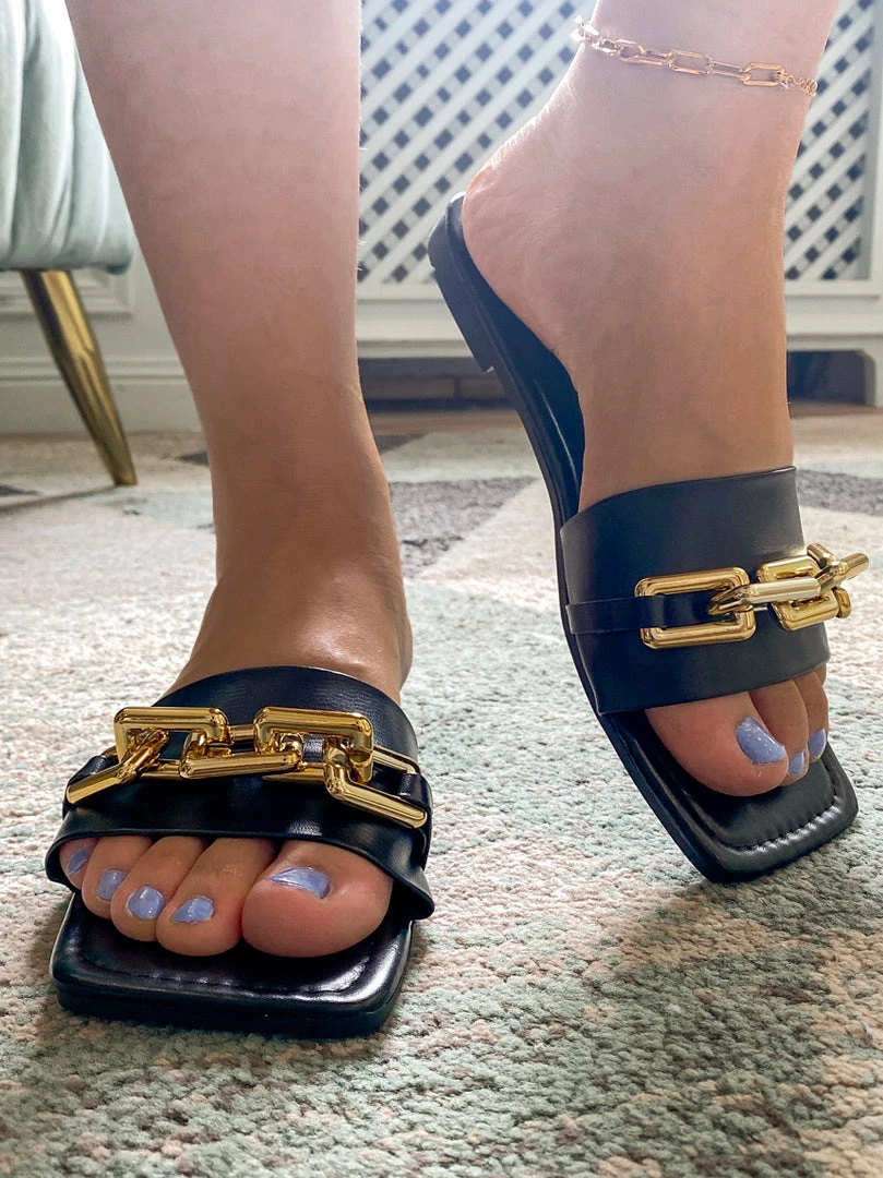 Pretty up your feet by slipping on this slide that flaunts a wide single band accented by a gleaming chain detail. A slip-fighting rubber sole makes for surer steps.