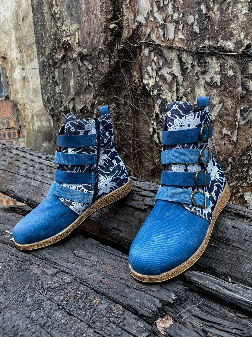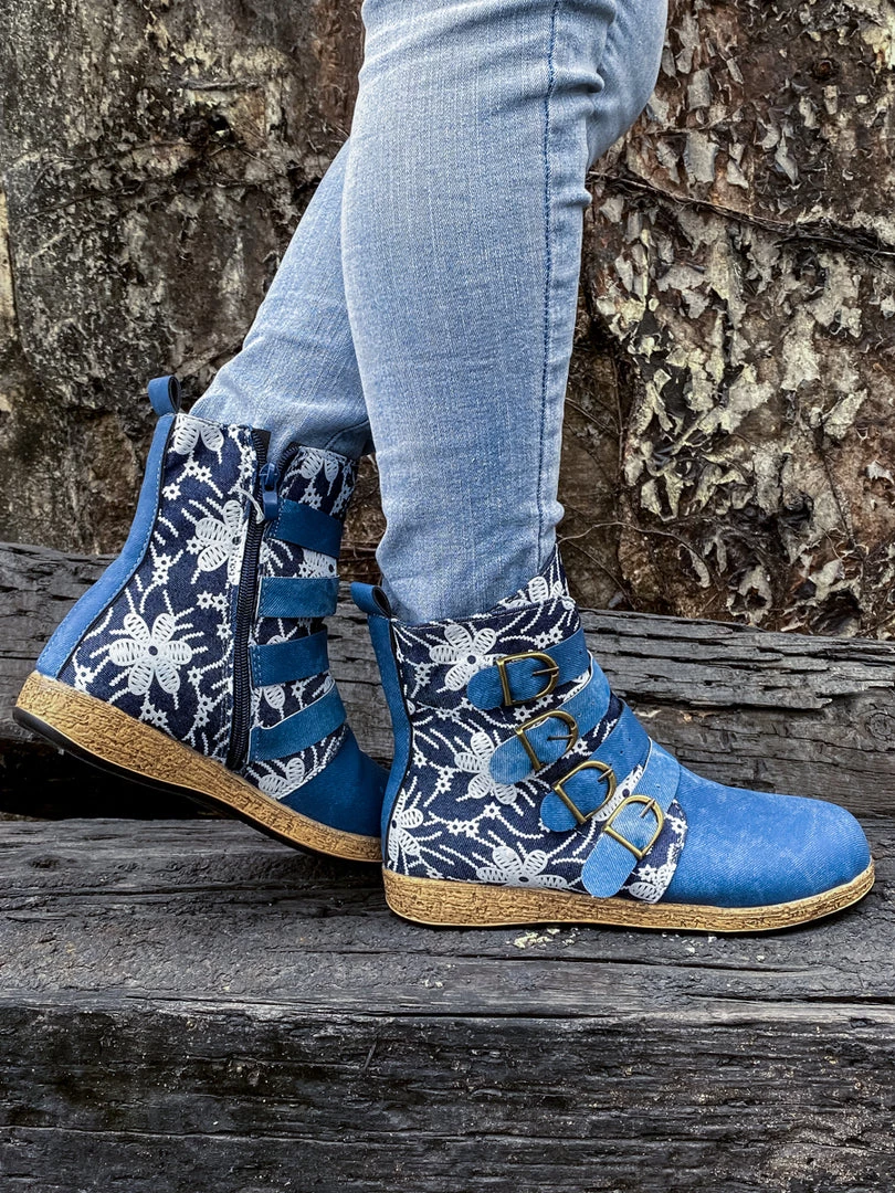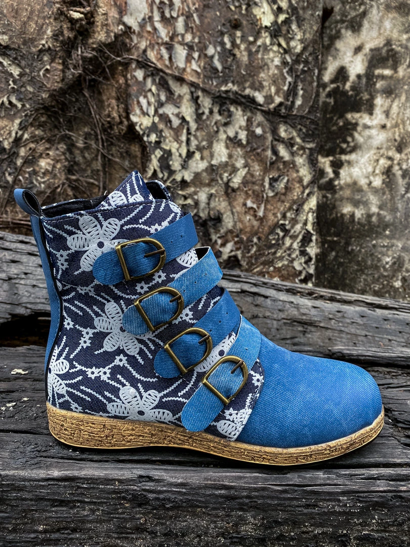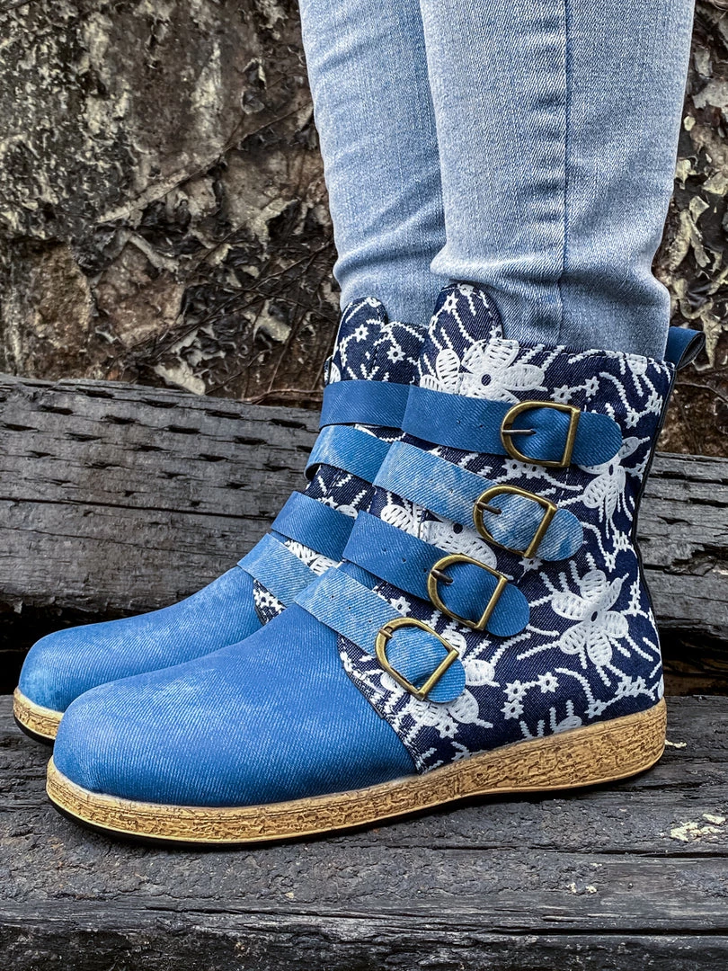 Embroidered floral detail adds creative texture to this ankle boot fashioned with three stripe buckle design to elevate your ensemble.