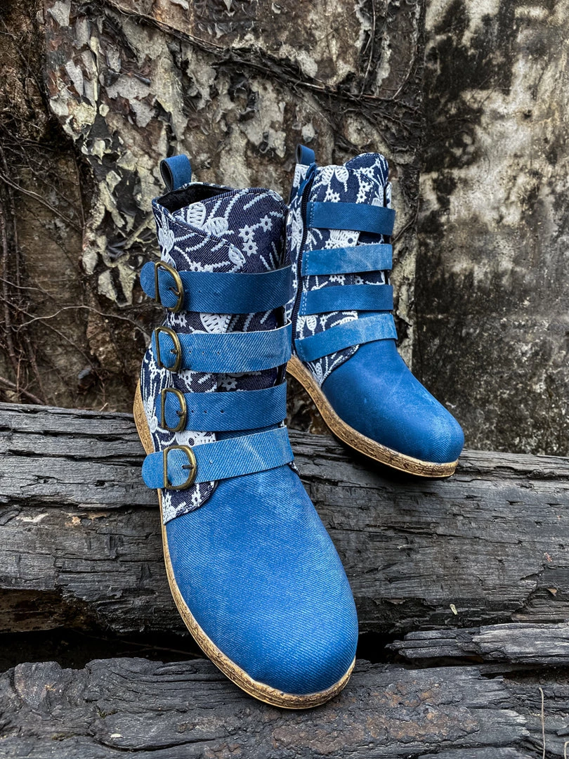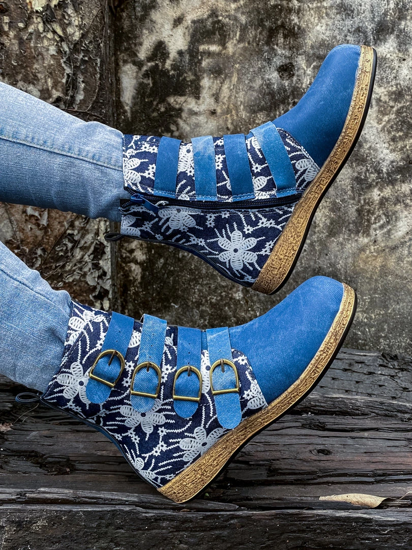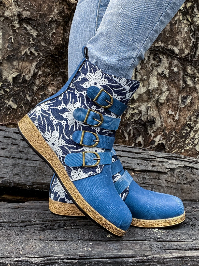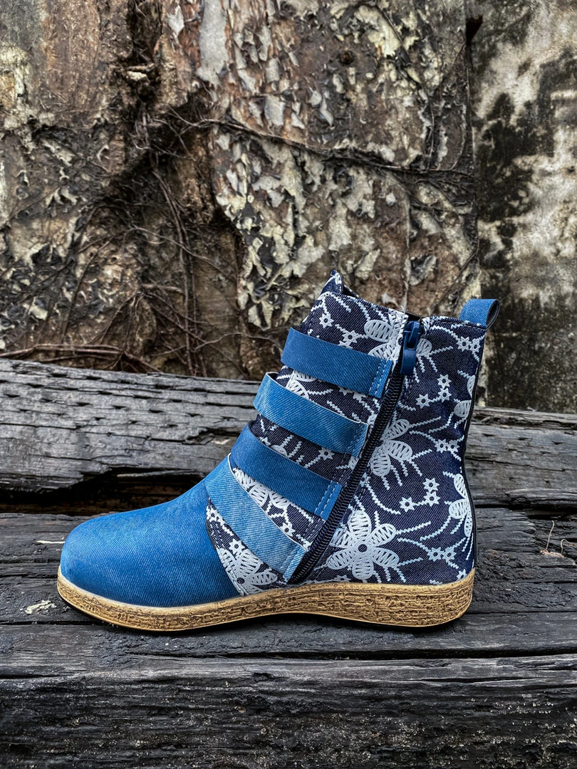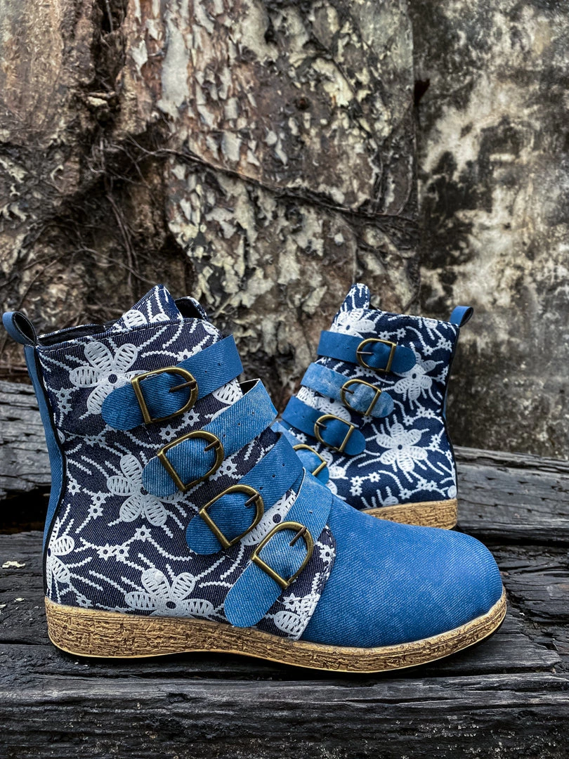 Embroidered floral detail adds creative texture to this ankle boot fashioned with three stripe buckle design to elevate your ensemble.