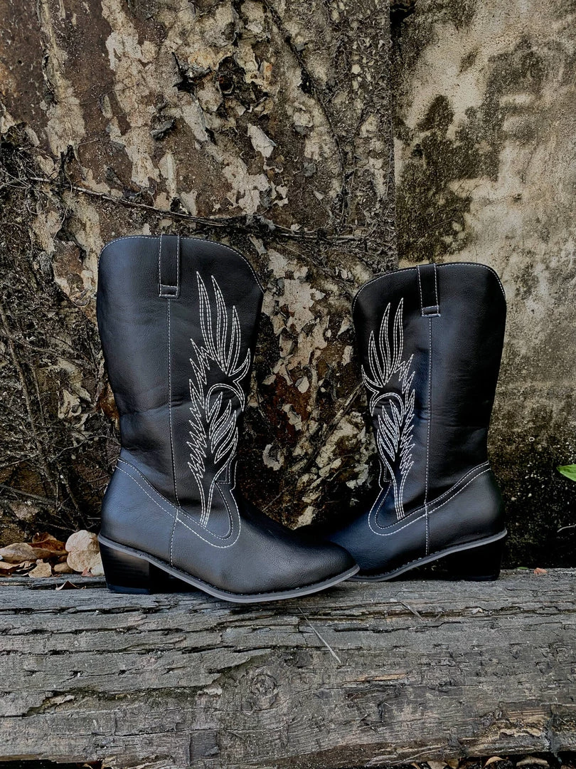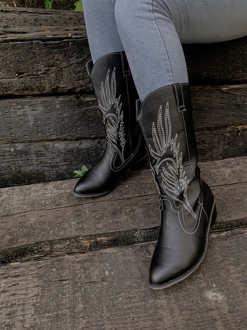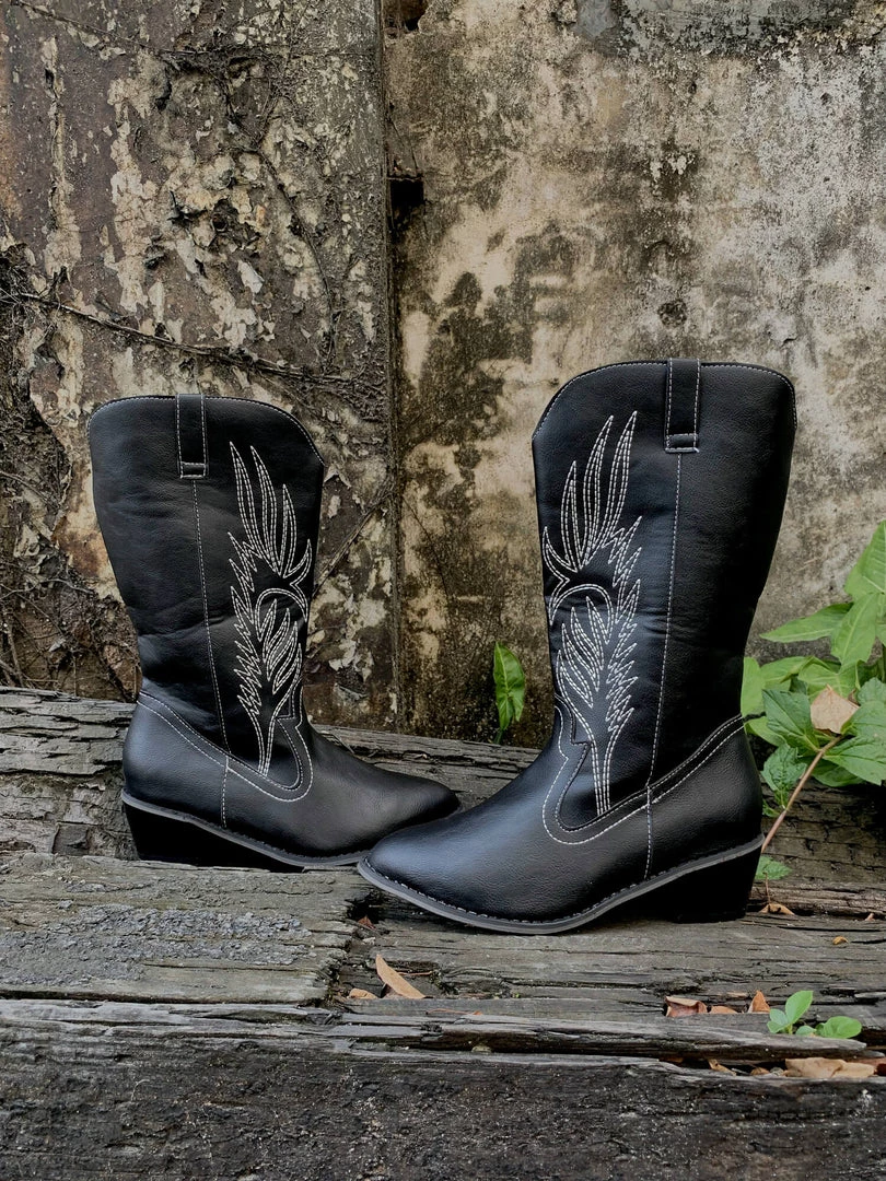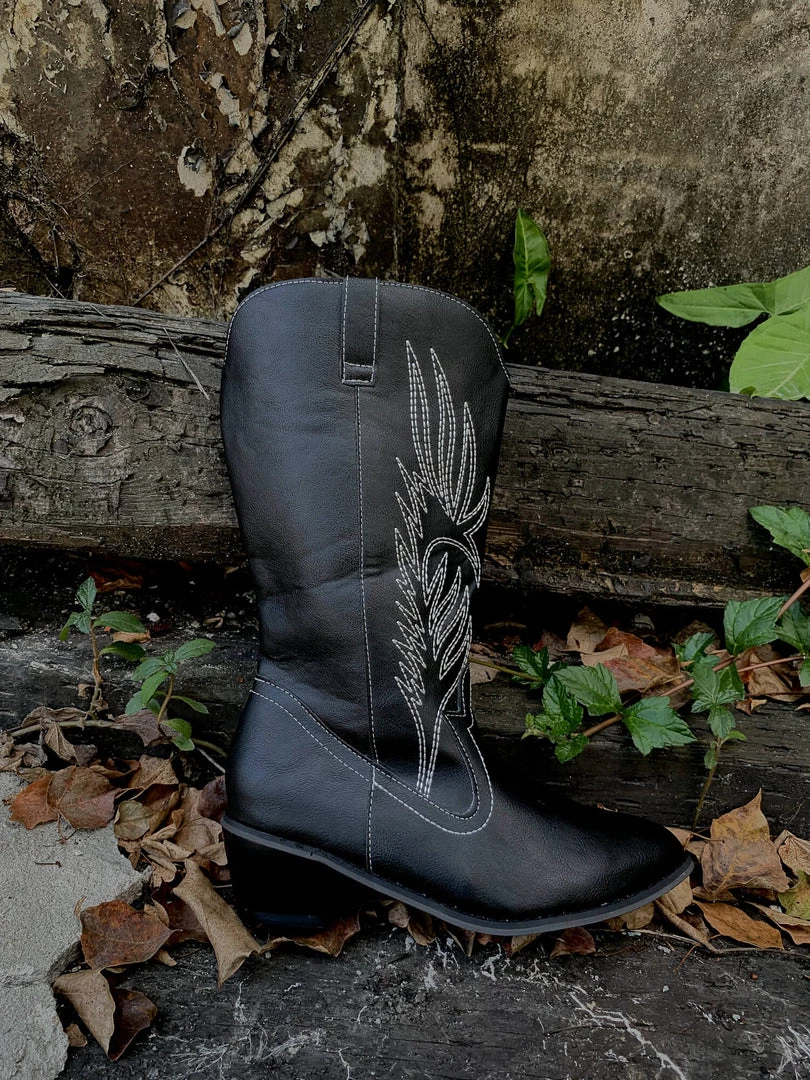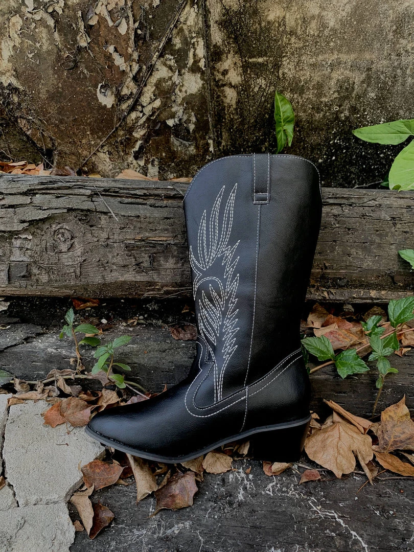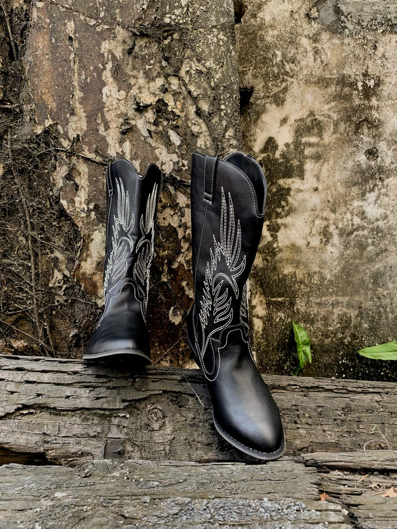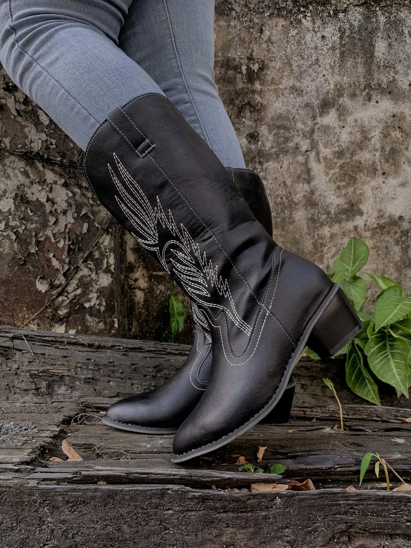 YL En Bloom | Angel Wing Embroidered Cowboy Heel Knee Boots – Black