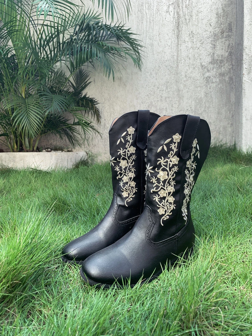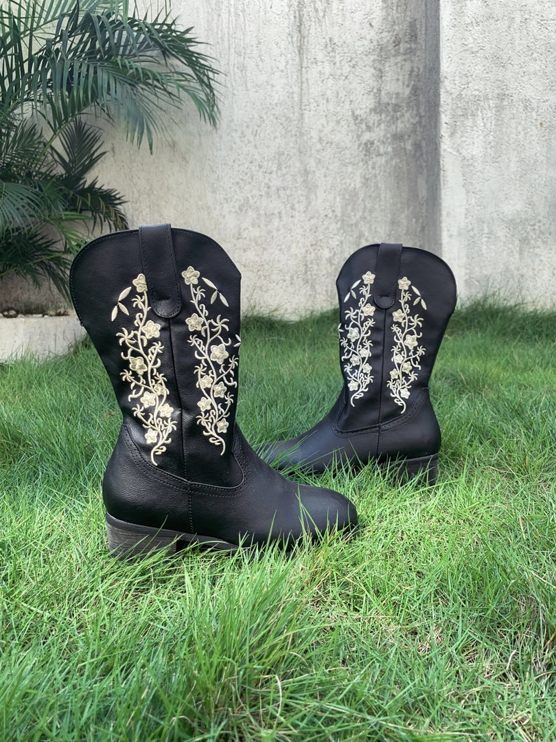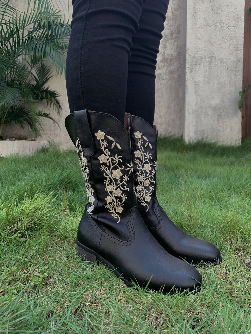Incorporate a feminine touch into your Western-inspired style with this pair of skid-resistant cowboy boots embroidered with a colorful floral design.